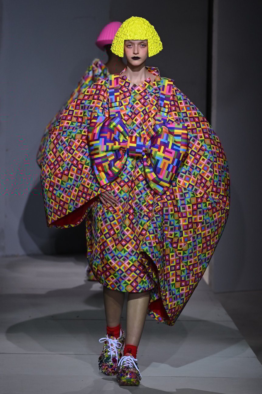 コム デ ギャルソンのショーは、ラストルックが舞台裏に消えると同時に音楽がプツリと途切れ、照明が落ちることで終わりを告げることが多い。しかし今回はその続きがあり、再び全モデルが一気に飛び出してきた。まるで色と柄の洪水のようにランウェイを埋め尽くしたのだ。観客らは意表を突かれながらも、希望を感じさせる美しいフィナーレに大きな拍手と歓声を送った。