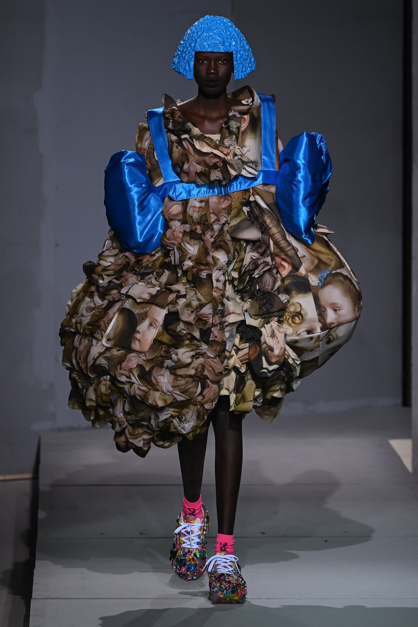 古典的な西洋絵画を想起させる子どもの顔、幾何学模様、ドットやチェックといった柄にはじまり、後半はレースやチュール、ラメといった異なるテクスチャーが一体の中で混ざり合っていく。シグネチャーの黒がランウェイピースにほとんど使われていなかったのも今シーズンの特徴だ。
