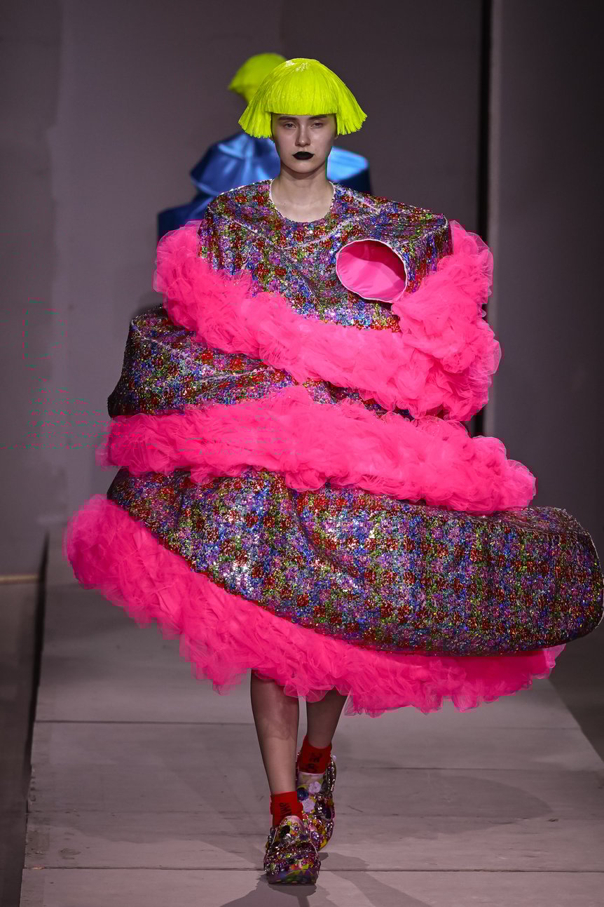 形についても常識を逸脱している。アシンメトリーをはじめ、身頃のパーツのアウトラインを残したままランダムにはぎ合わせたり、チューブ状のパーツをぐるぐると巻きつけたり、衣服のあるべき形を極限まで壊す。まるで立体造形だが、デフォルメされた襟やリボン、ベルトといったディテールによって、ドレスとしての存在が保たれている。