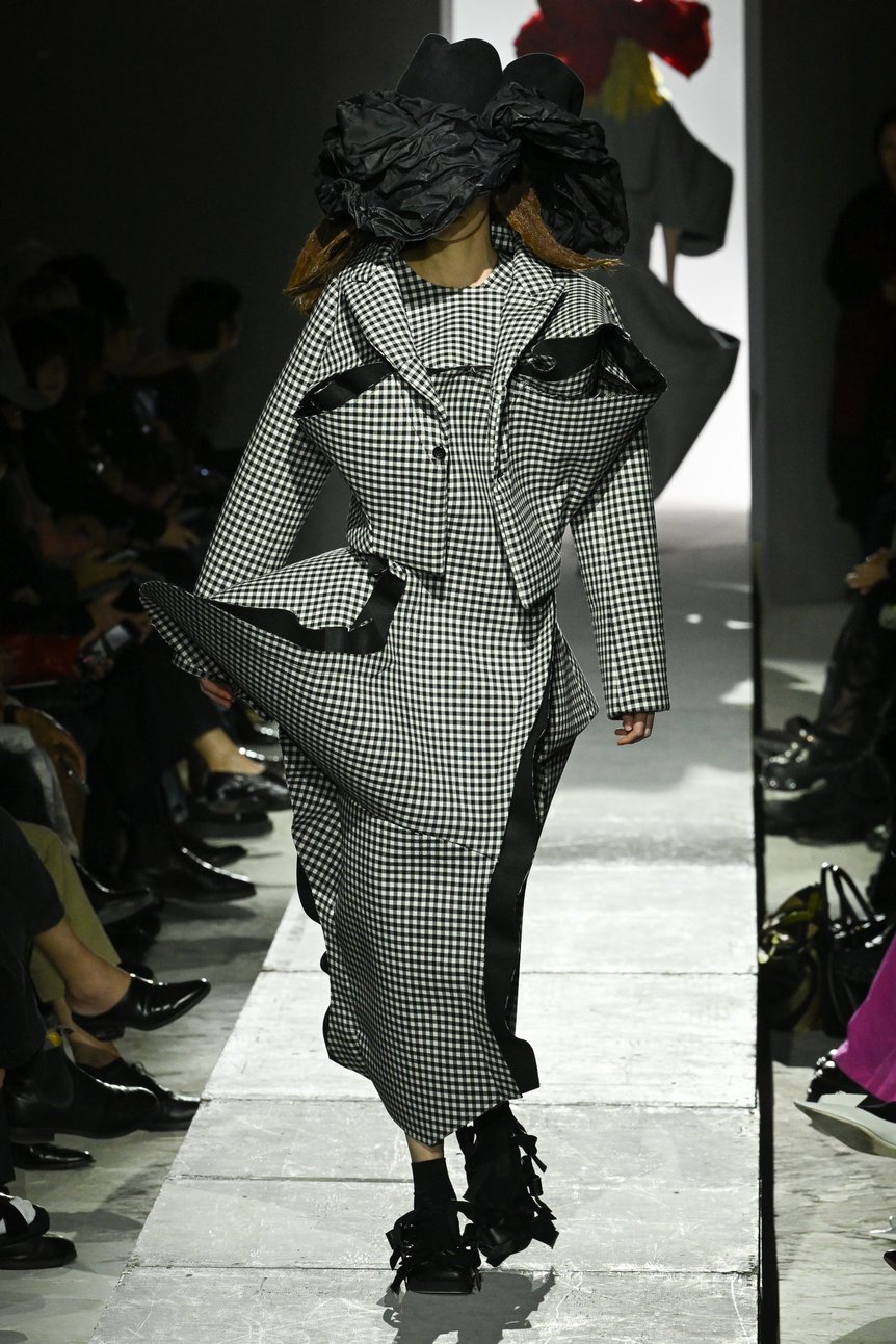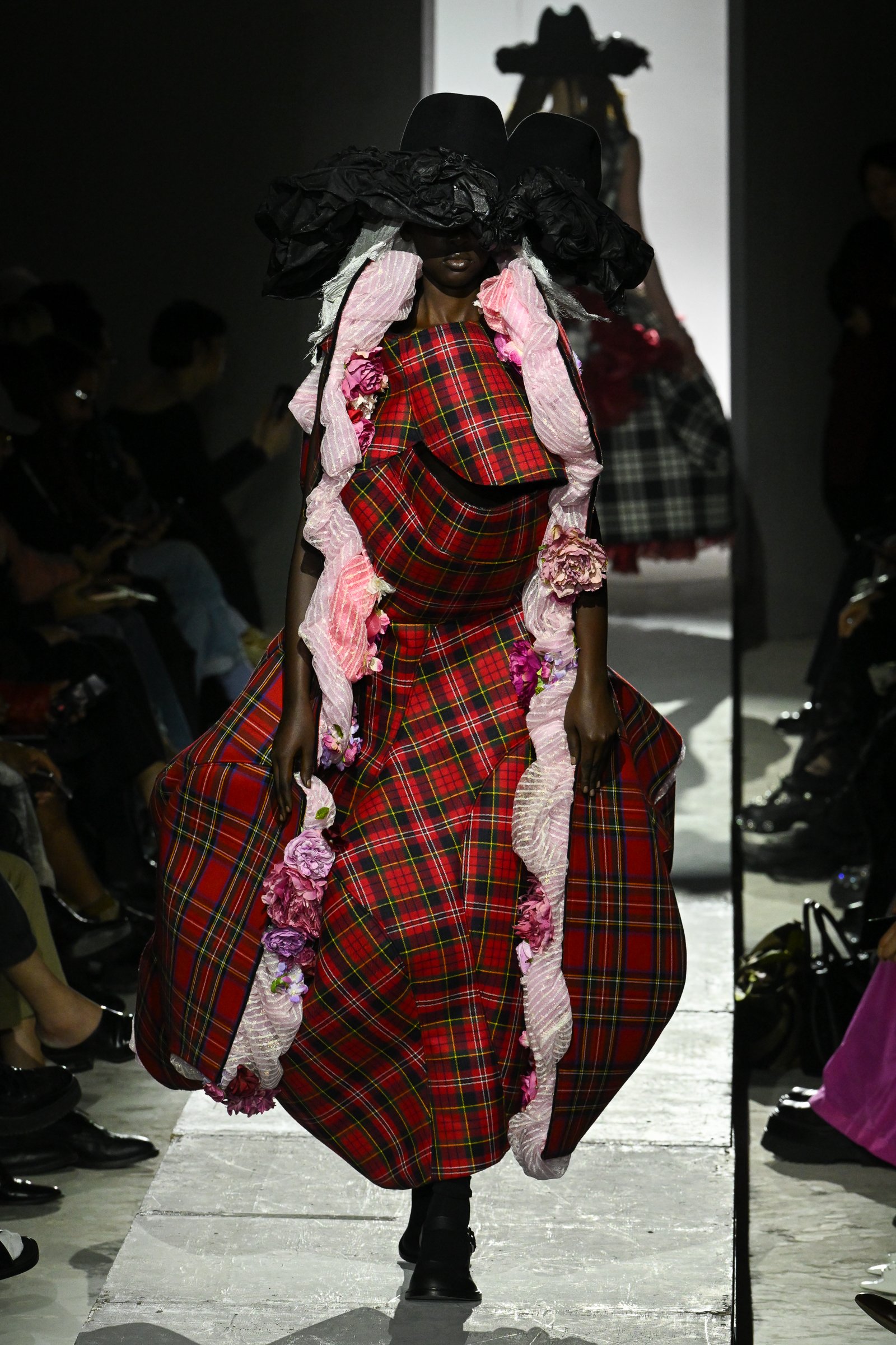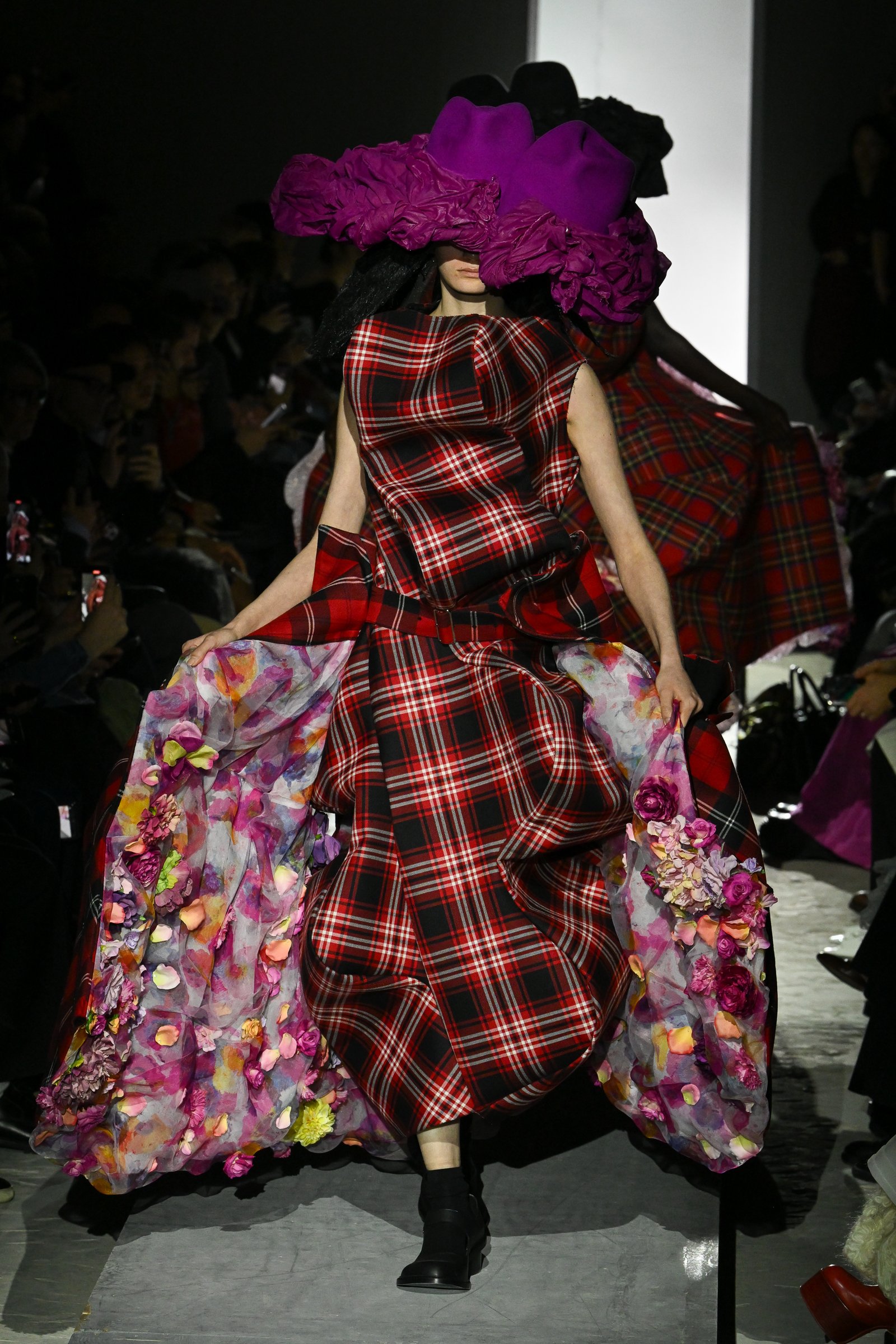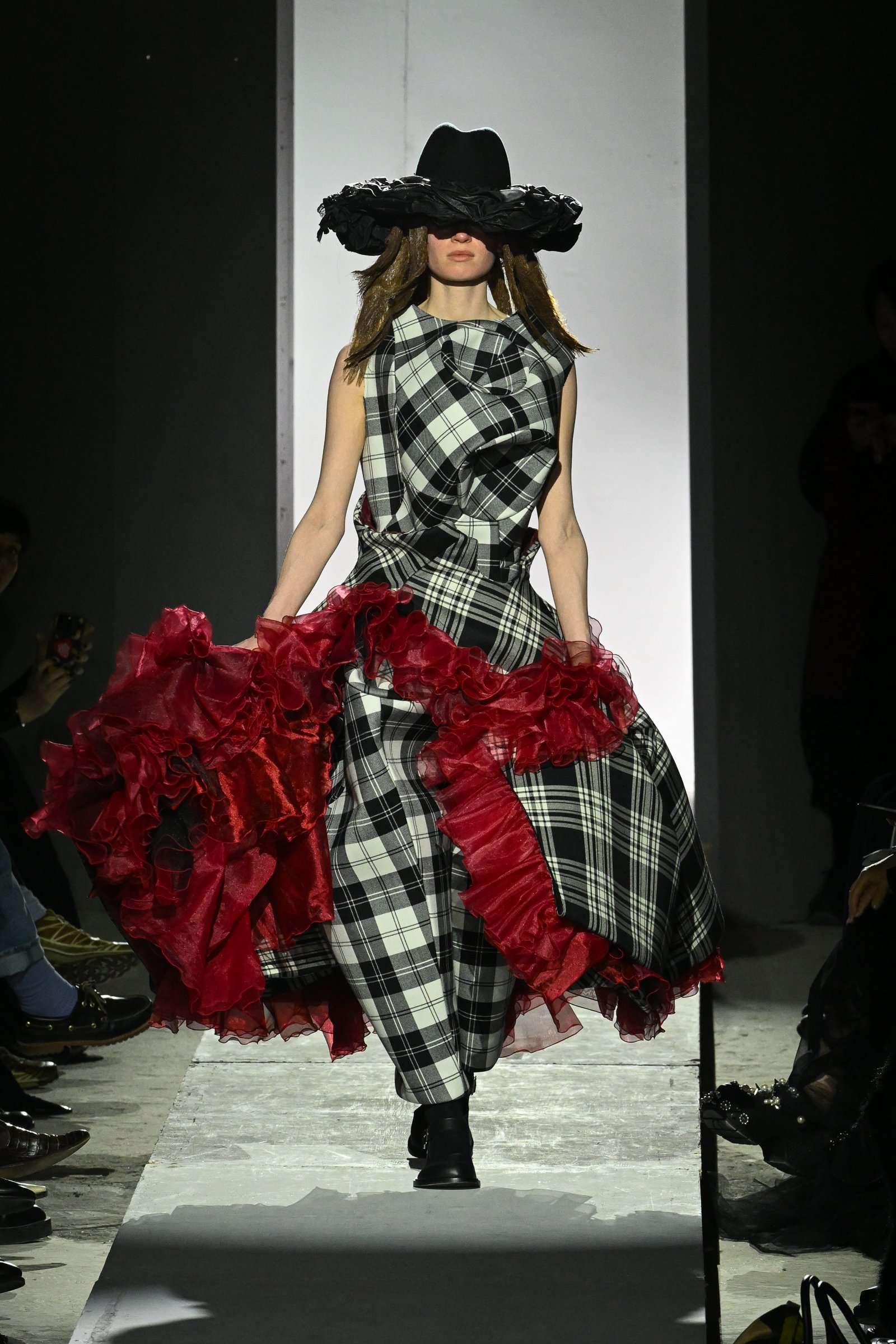 後半では、ストーリーが一転。白黒のチェック柄のドレスからは朱色のフリルが噴き出し、 パンクの象徴でもあるタータンチェックの裂け目から煌めくレースが現れ、人工の花々が縫い付けられている。あるドレスの裏地には、オーガンザの鮮やかな花柄が覗く。くり抜かれたジャケットからは、結ばれたストライプの生地がはみ出す。内部が膨らみ、こぶのように形作られる。ラストルックのモデルは、引きずるほどに長いチュールのフリルを両手で広げながら歩いた。