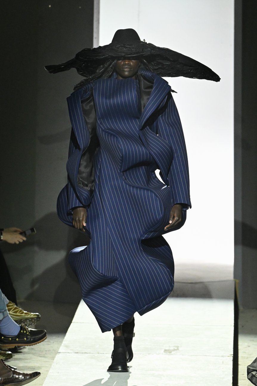 ファーストルックは、テーラードジャケットの形を基にしつつ、ボンディングで張りを持たせ、波打つポストモダンの彫刻のような造形を描く。ピンストライプやプリンス?オブ?ウェールズ?チェックといった、クラシックな紳士服に用いられる生地は、川久保が対立する「大きなもの」の象徴だろう。うごめくように肥大と膨張をし、裏地(内部)が露わになっている。所々に見られるくぼみは、欠落を暗示するのだろうか。
