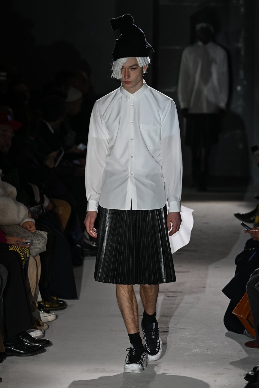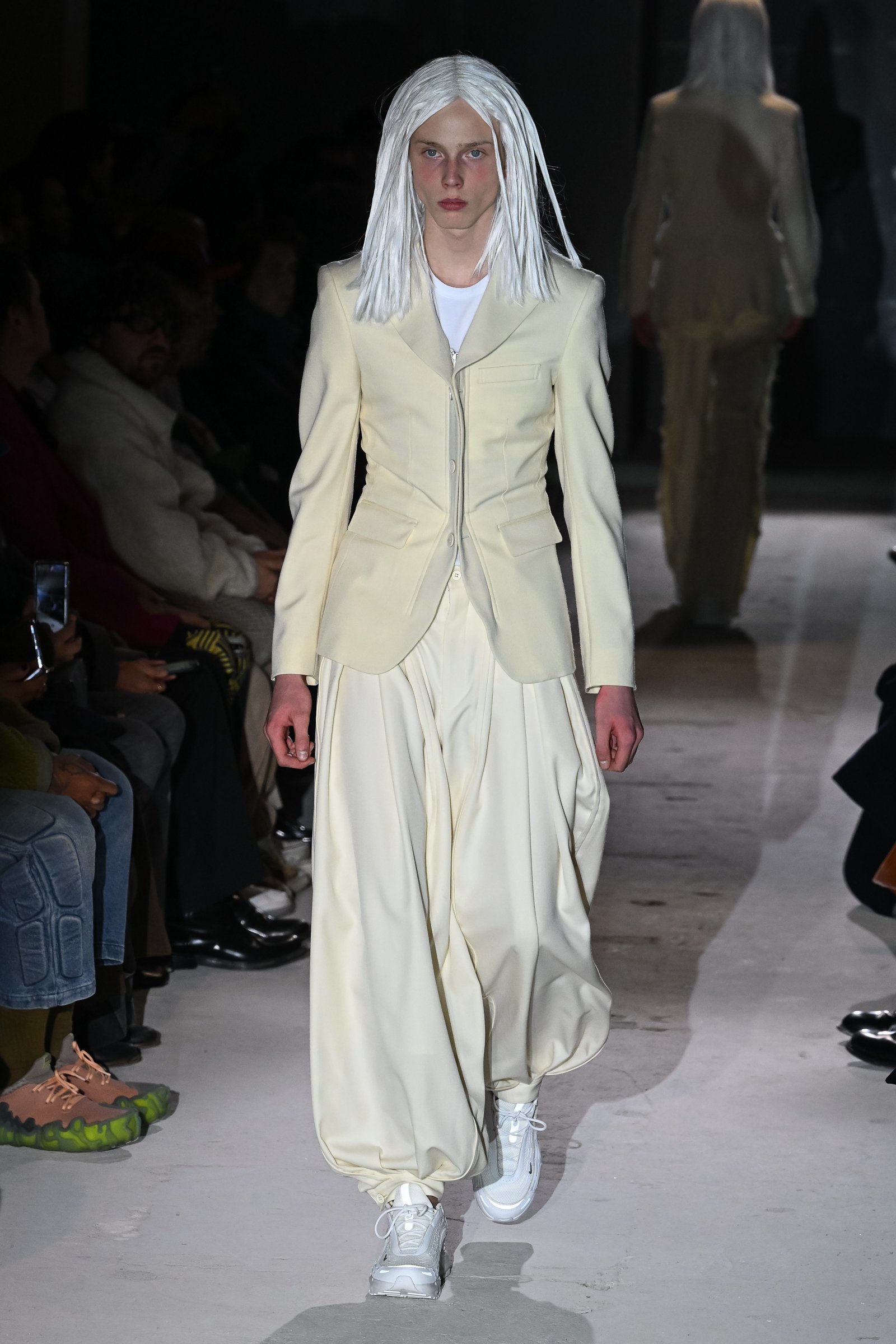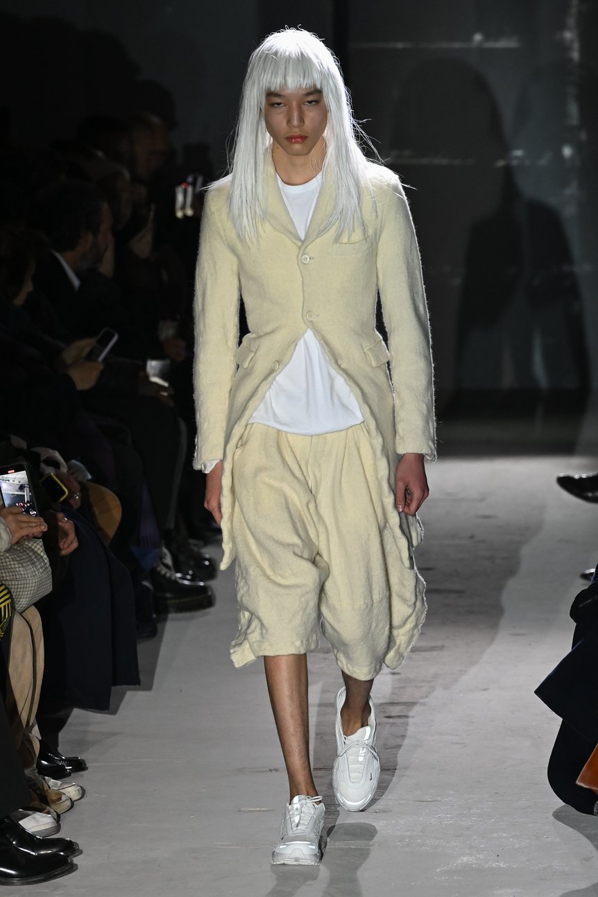 コム デ ギャルソン オム プリュスのコレクションは、常にテーラードから始まる。暗闇の中から登場したファーストルックは、頭から足まで白一色。ランウェイの脇に設置されたブラックライトを浴びると、光を帯びて浮かび上がるように見えた。