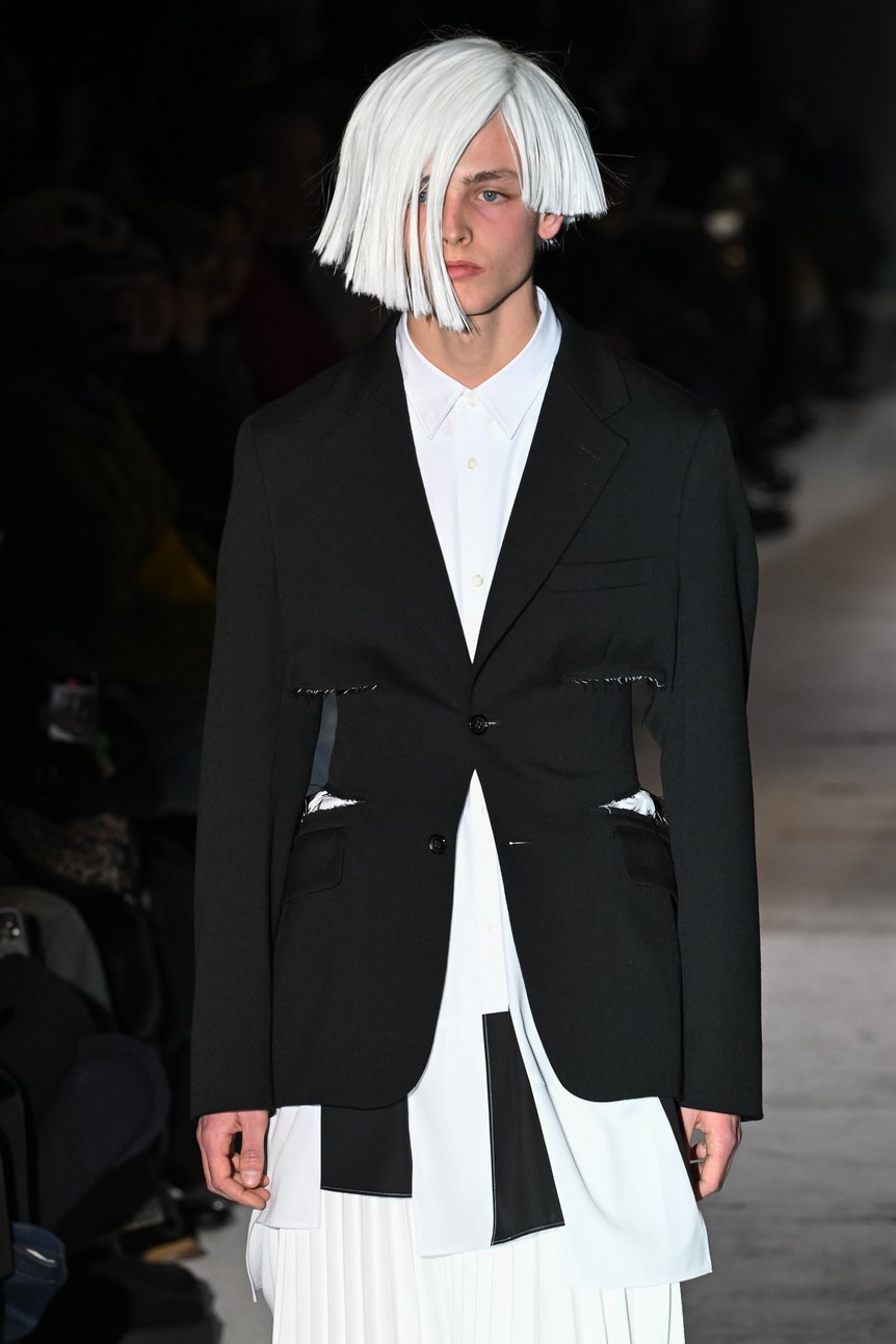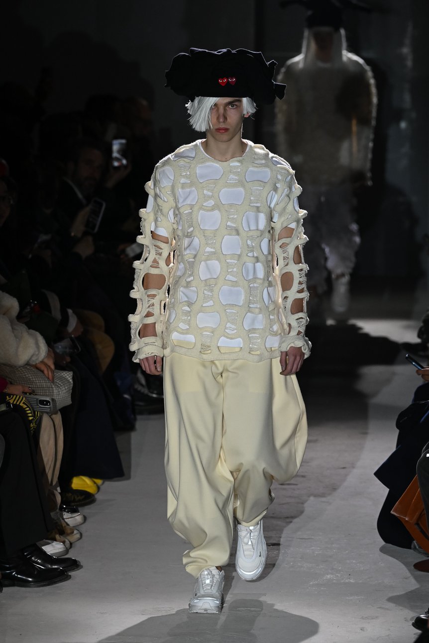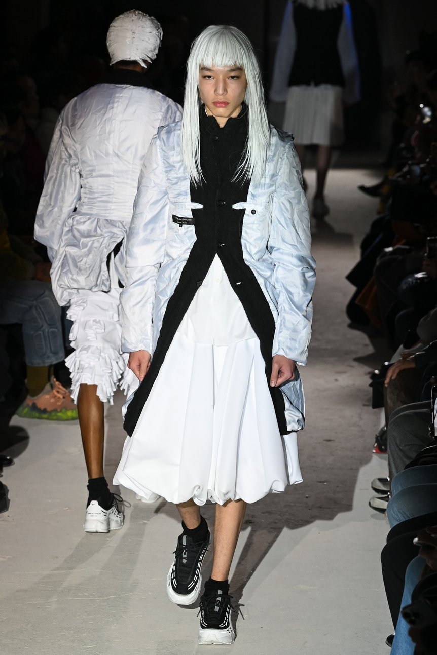 「白は祈りの象徴」——これはパリで発表された「コム デ ギャルソン オム プリュス(COMME des GAR?ONS HOMME PLUS)」2024年秋冬コレクションのテーマ「SPIRITUAL WORLD」に添えられた、デザイナー川久保玲の言葉。昨今の混乱する世界の状況を憂い嘆く心が透ける。最もピュアで清らかな白を用いたショーは、神聖な儀式のようなムードが漂っていた。