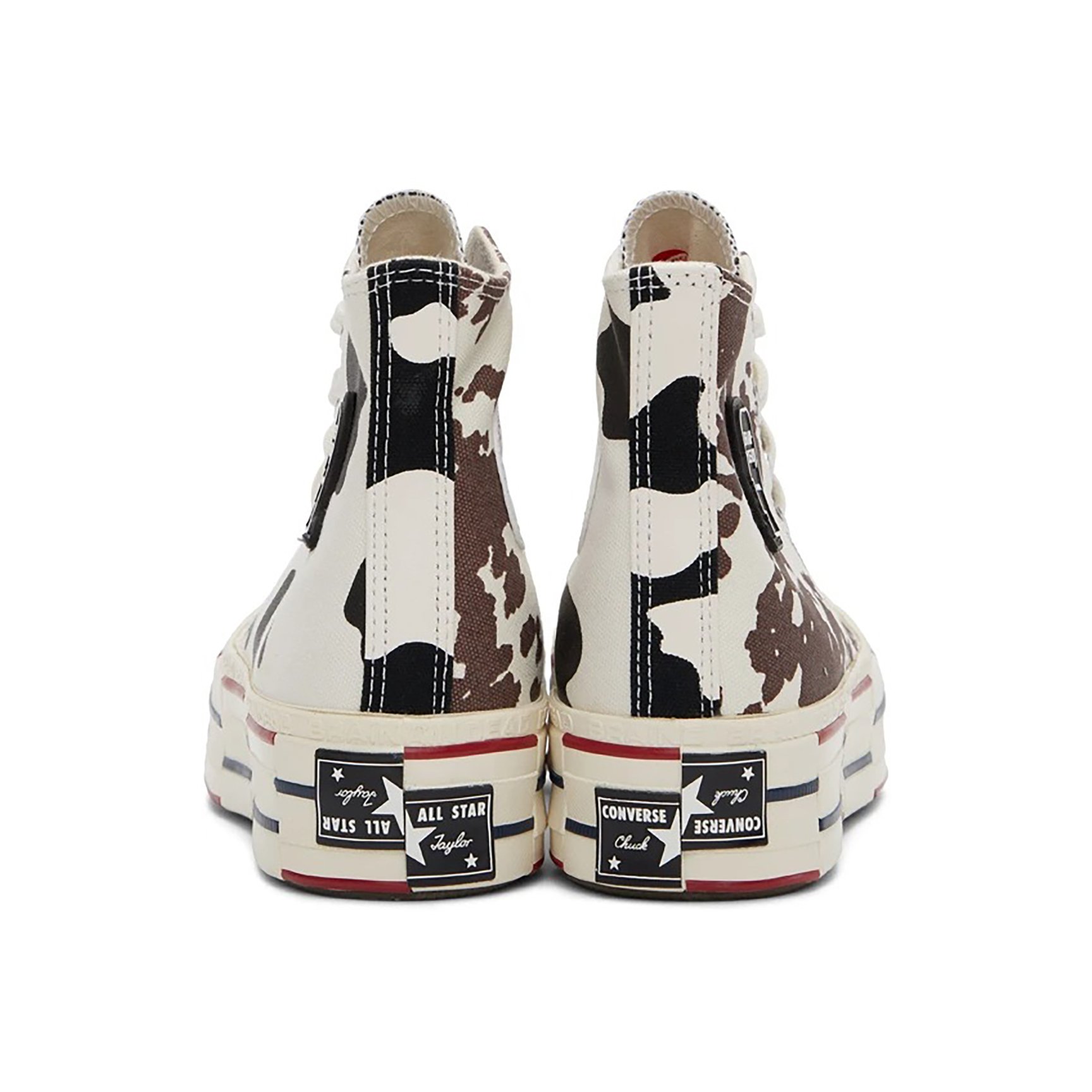 もう一足、「ブレイン デッド」とのコラボコンバースをピックアップ。こちらもフィーチャーしているのは牛柄ですが、両足とも中心から左右それぞれ異なるカウプリントになっているんです。少しチャンキーなソールに施されたレッド&ブラックのリズミカルなソールパターンにも注目!