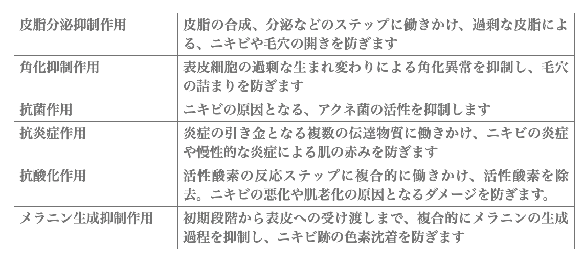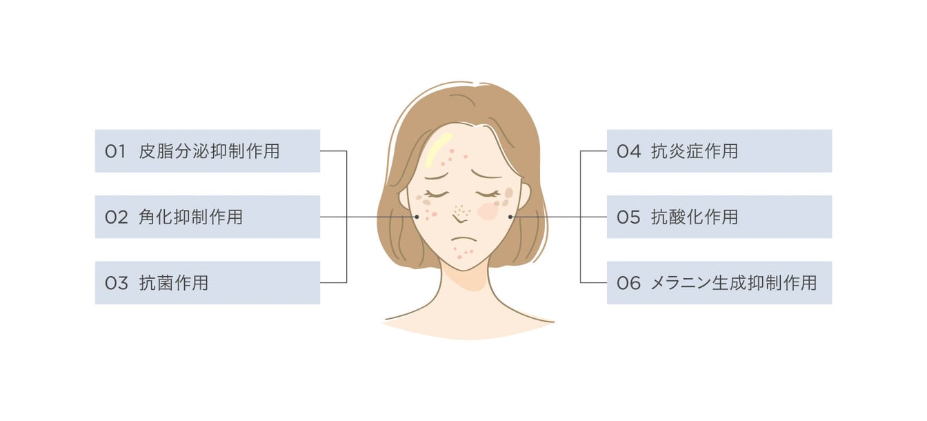 主に6つの働きが認められています。①過剰な皮脂の分泌を抑える働き、②過剰な角化を防ぐ働き、③アクネ菌などに対する抗菌作用 ④肌の炎症や赤みを防ぐ抗炎症作用、⑤肌ダメージを防ぐ抗酸化作用、⑥メラニンの生成を防ぐ働き、です。