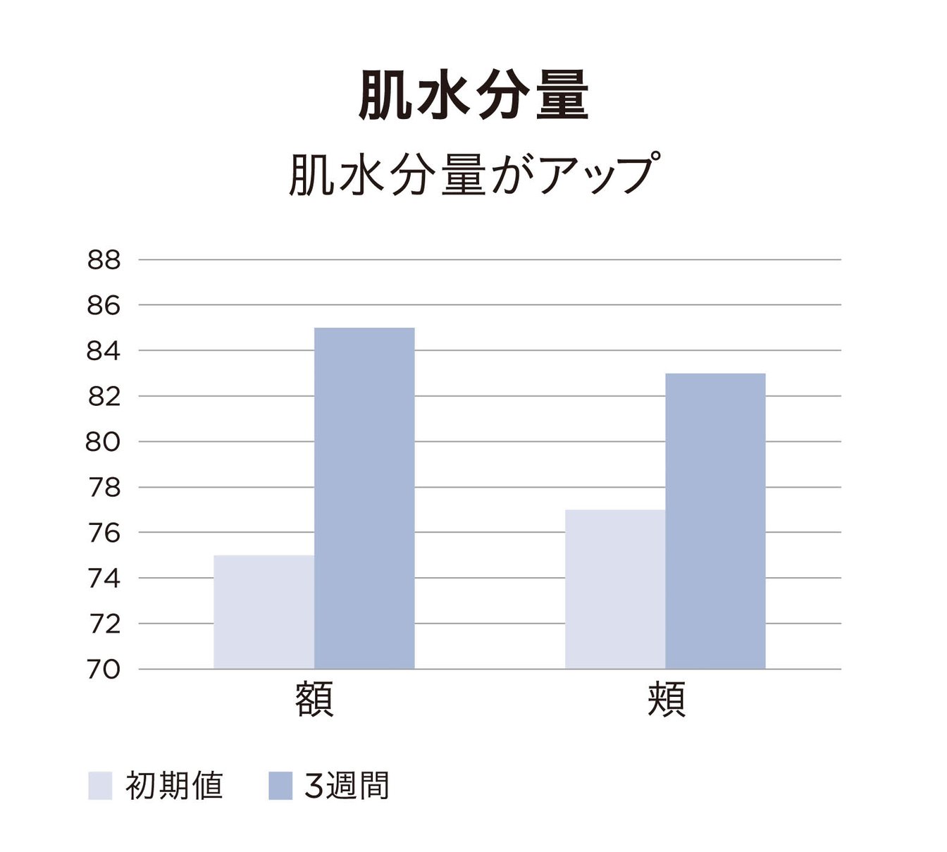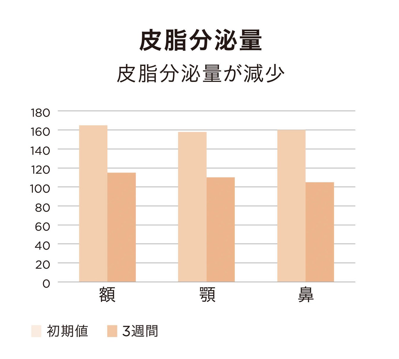 「アゼロイルジグリシンK」原液を配合した水溶液を、1日2回3週間塗布した際の肌変化を計測。皮脂分泌量が減少する一方で、水分量は高まっていることが分かる。出典/エトヴォス
