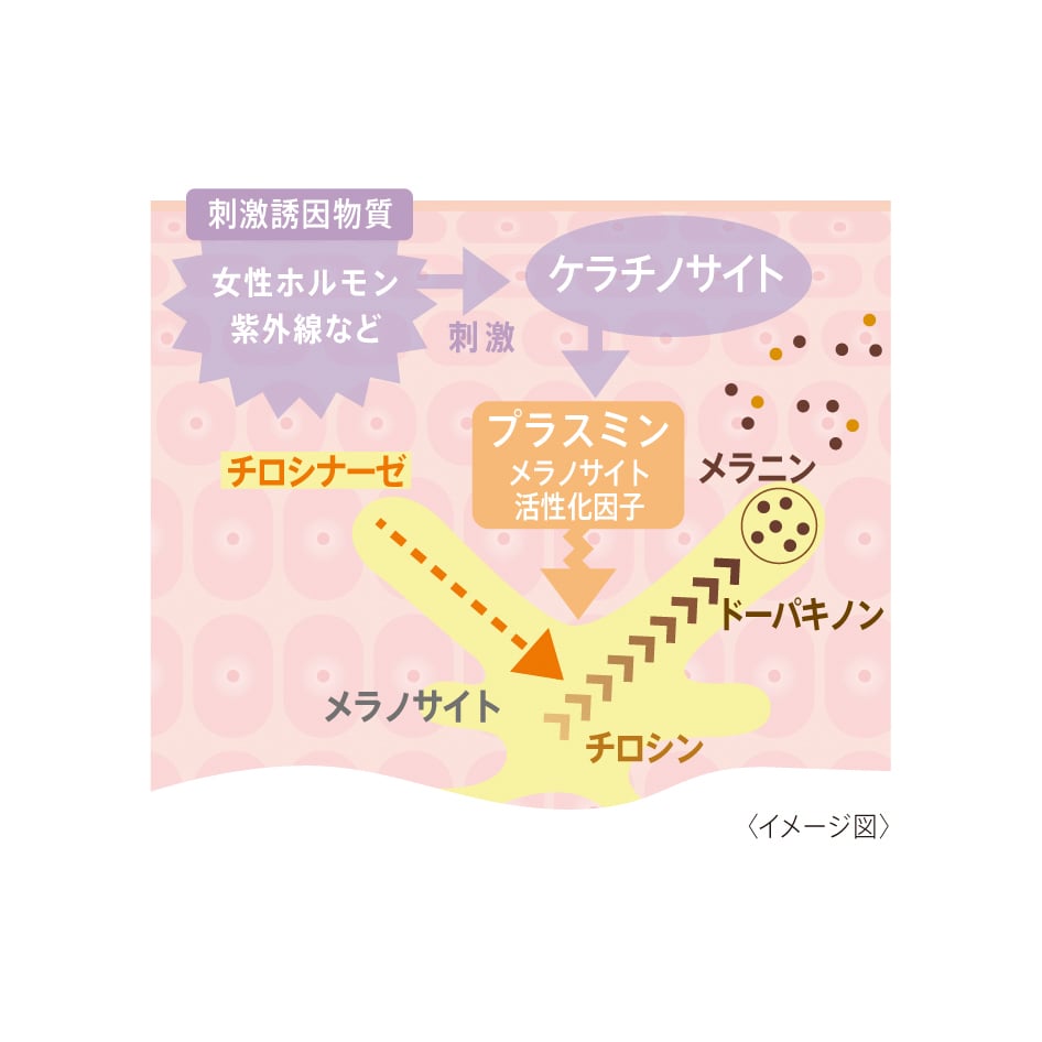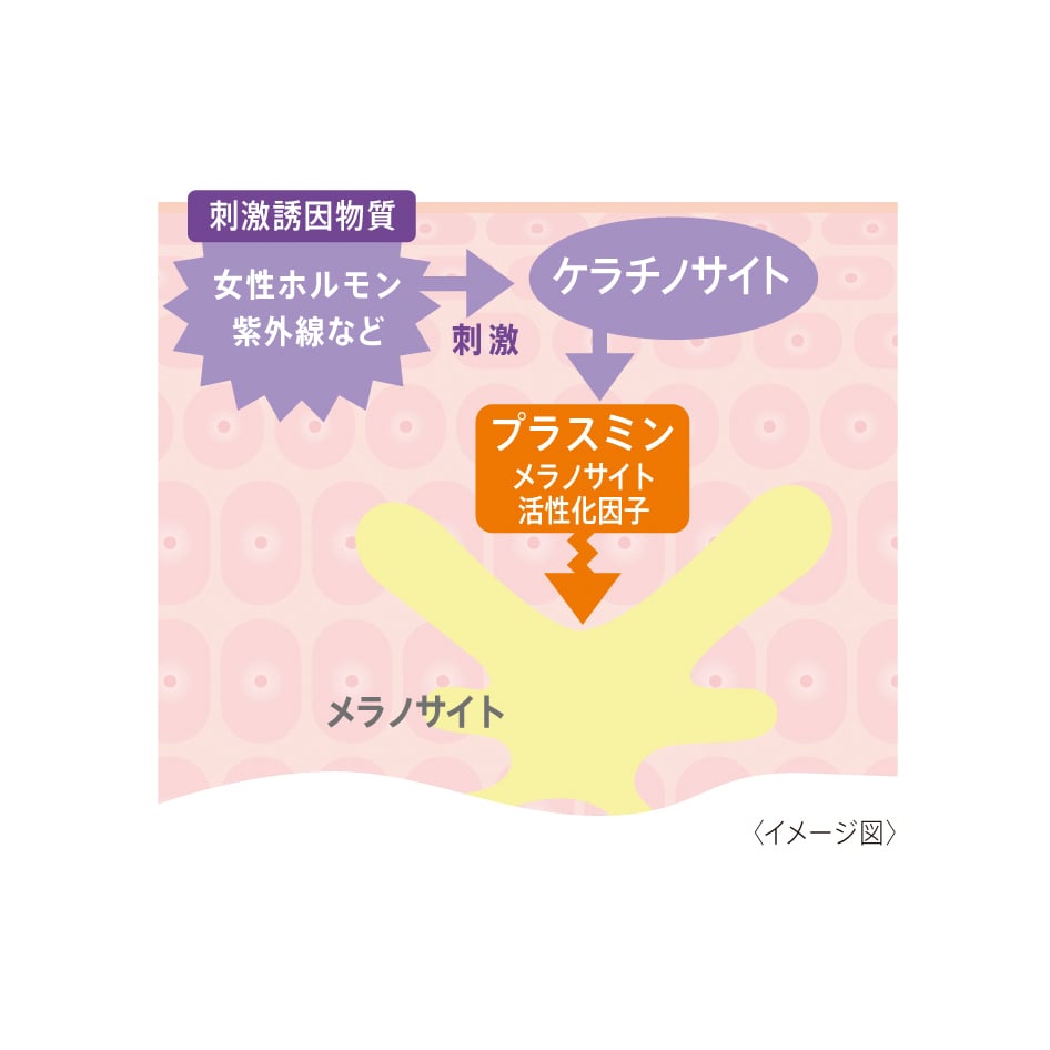 肌内部で「プラスミン」という炎症因子が発生すると、メラニン生成や肌荒れの引き金になります。トラネキサム酸はこのプラスミンの働きを抑制し、シミや肌荒れの連鎖を初期段階でブロックします。出典/第一三共ヘルスケア