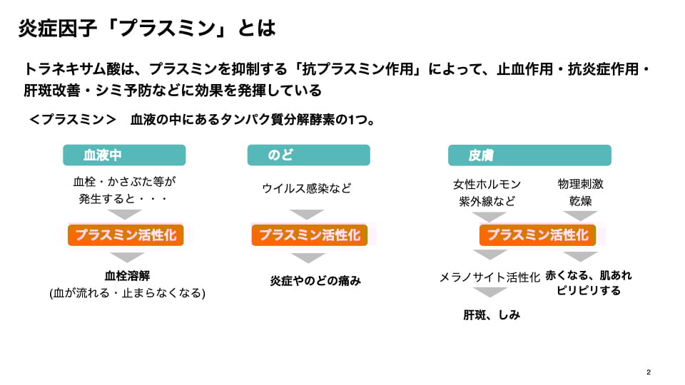 その通りです。プラスミンがメラノサイトを刺激して、メラニン生成のスイッチが入ります。トラネキサム酸はプラスミンを抑制して、症状を初期段階でブロックするんですね。