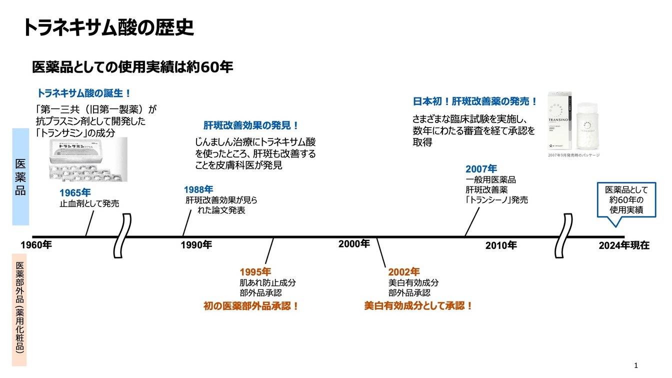 トラネキサム酸は、もともと1965年に止血剤として開発されたお薬です。薬剤としての歴史は長く、実に60年の使用実績があるんですね。1988年に肝斑の改善効果についての論文が発表されると、美容の分野でも注目を集めるようになりました。