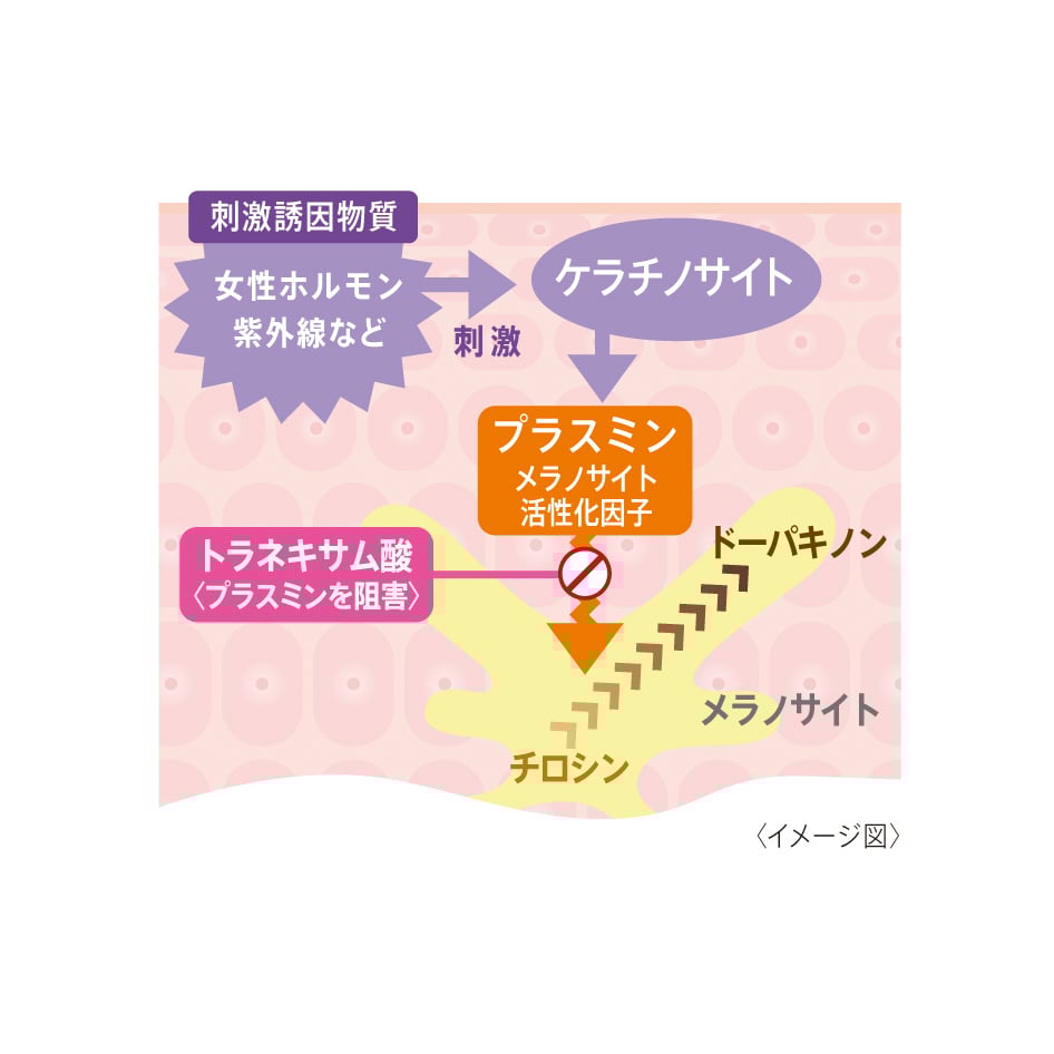 肌内部で常に生じている慢性的な炎症は、メラニンの生成や肌荒れなどのトラブルの引き金となる存在です。トラネキサム酸はこの慢性炎症を、初期の段階でブロックする成分。医薬部外品の有効成分として、「美白」「肌荒れ防止」の効果が認められています。