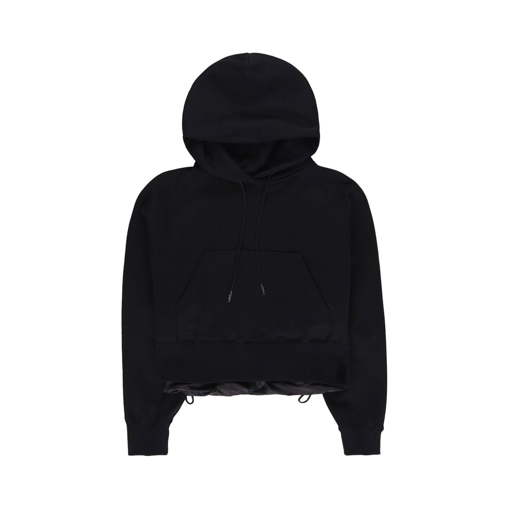 ブラックのワントーンでシックに決まる、「サカイ(sacai)」のクロップドフーディ。フロントにコットン、バックにナイロンを採用した、ドッキングの魅力を堪能できるカジュアルウェアです。リブにコンパクトなイニシャルロゴをパッチした、特別感溢れる一枚をデイリーで活躍させて。