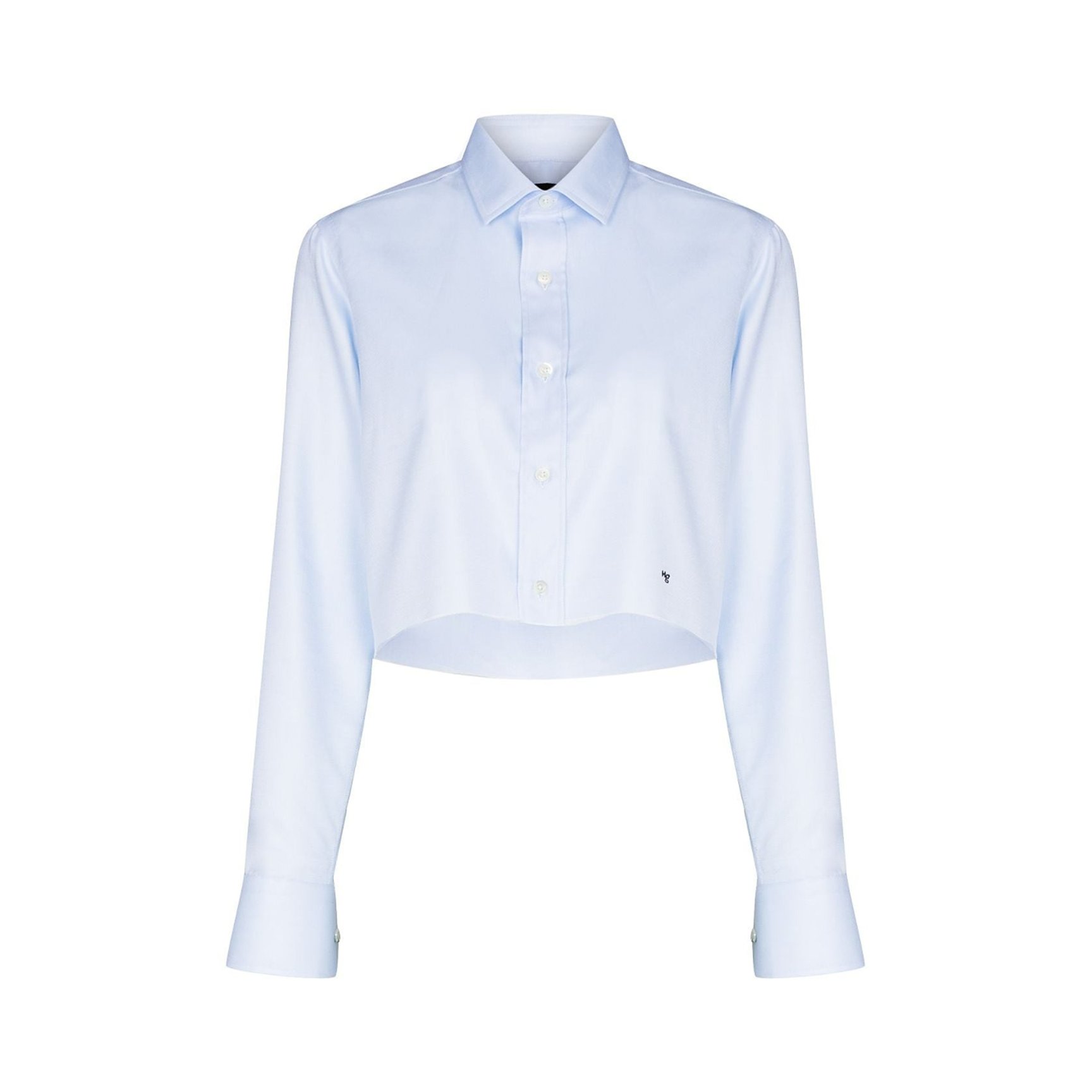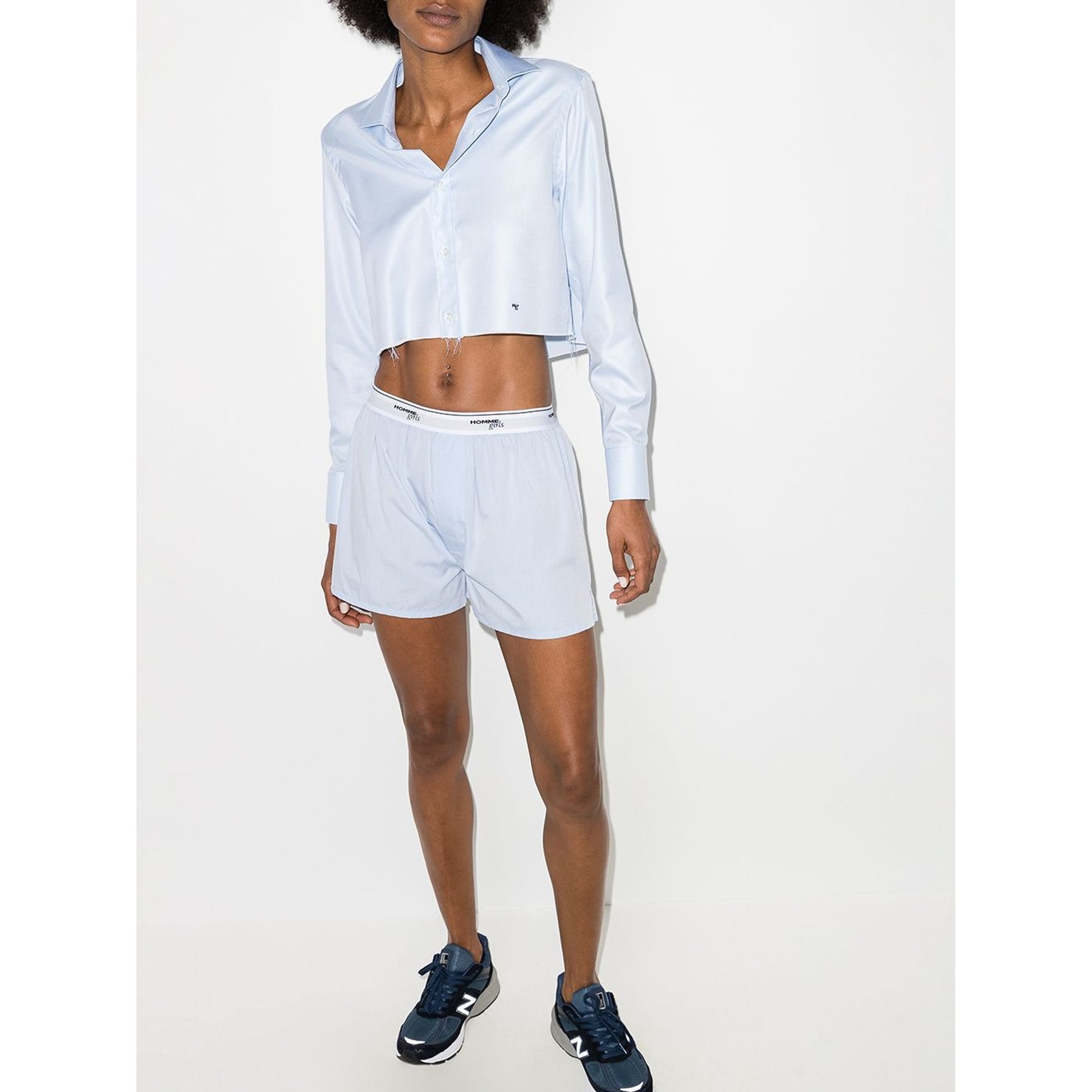 艶のあるコットン生地で仕立てた「オムガールズ(HommeGirls)」のシャツは、テーラーリングの醍醐味を肌で感じるハンサムなデザイン。小さなロゴだけを刺繍したクリーンさと、クロップド丈に裁断したエッジィなカッティングで、凛としたタフなルックを完成させます。