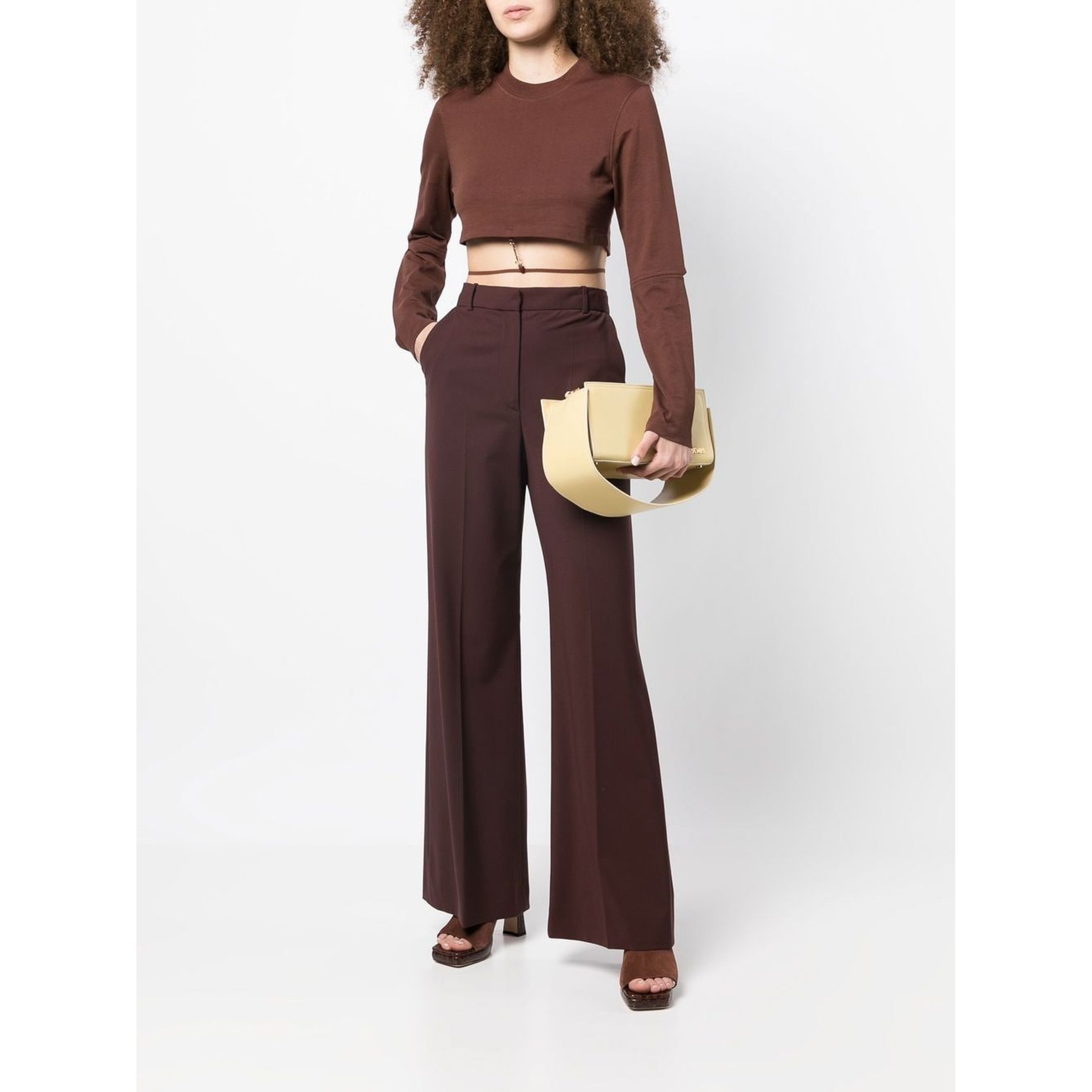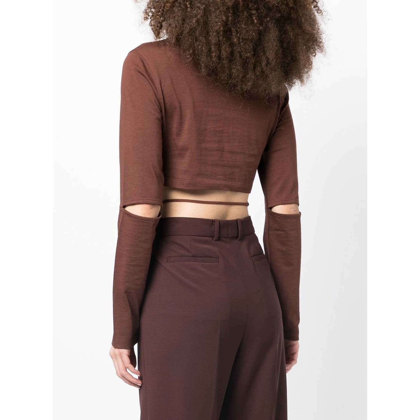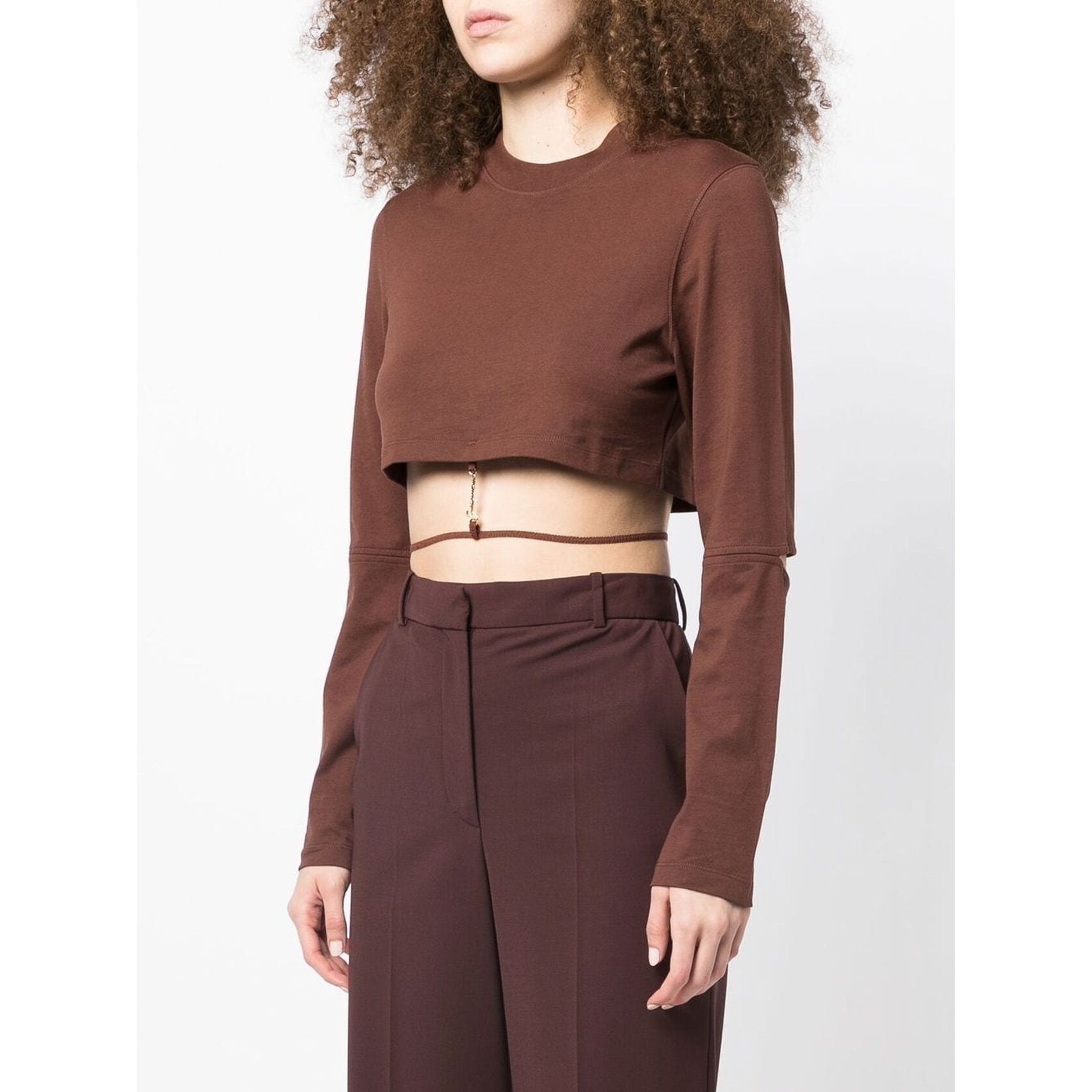 こだわりのディテールが随所に散りばめられた、「ジャックムス(JACQUEMUS)」の個性的なクロップドトップス。肘部分はカットし、ウエストにはゴールドのハードウェアロゴで繋げた華奢なベルトをオン。秋に馴染むブラウンの他に、ハッピーなピンクも展開しています。