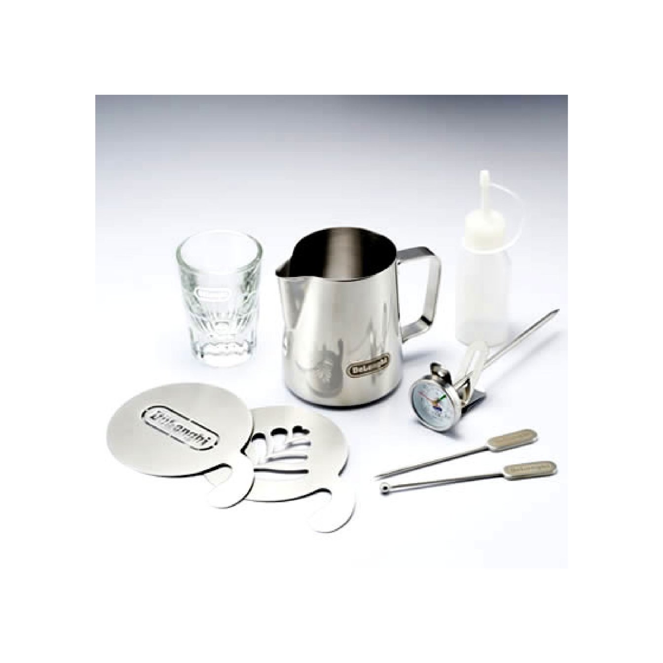 本格カフェを作るならマシンだけでなく、バリスタ気分を味わえる便利なキットも揃えたいところ。「フロスミルク用温度計」「アートピック2種類」「ステンシンプルプレート2種類」「ソースディスペンサー 50ml」「ショットグラス 2オンス」「ステンレス製ミルクジャグ 350ml」の6つがセットになったバリスタキットは持ってるとテンションが上がるアイテムです。