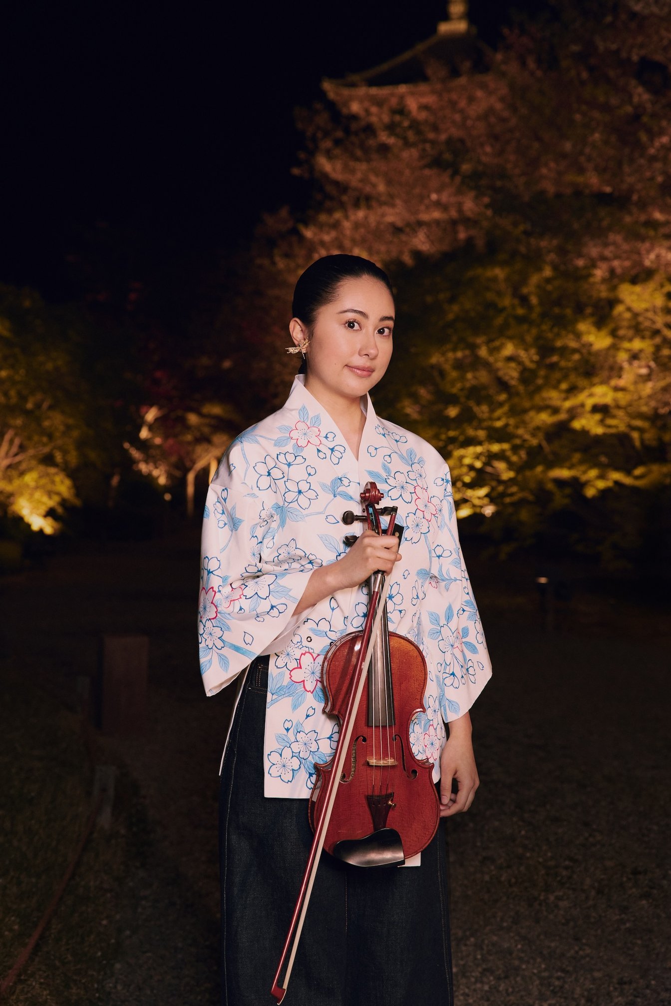 ショーの冒頭を飾ったバイオリニストLiliyo Tsujimuraが身につけていた着物風ジャケットのテキスタイルは、京友禅 五代?田畑喜八が手掛けた。「素描友禅」の技法で、藍をベースに珊瑚朱の赤を取り入れて桜を描き、日本の庭を表現したという。