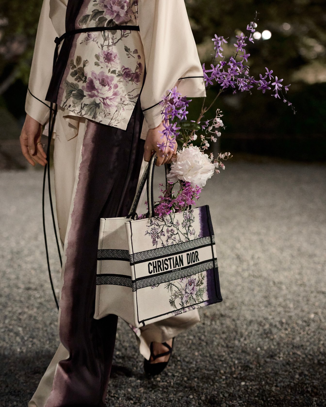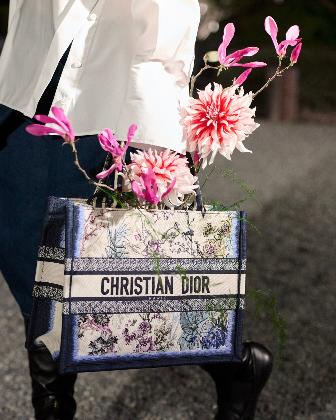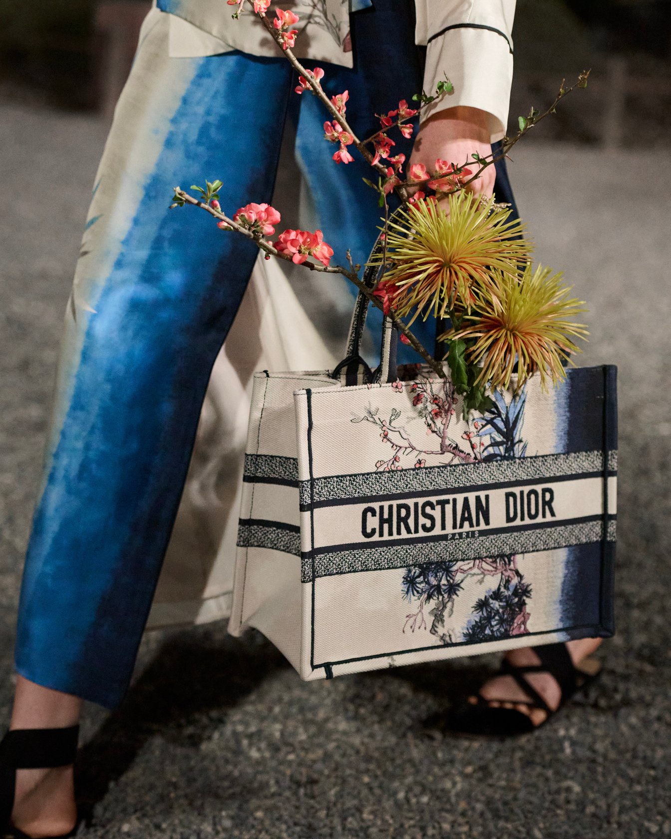 毎シーズン新作が発表されるディオールの「ブックトート」は今回、コレクションと連動し、藍染を連想させるグラデーションと東洋の花々が描かれたデザインに。ショーのランウェイでは、パリを拠点とするHiroyuki Moritaが、ブックトートを花器に見立てた生け花(いけばな)が彩りを添えた。