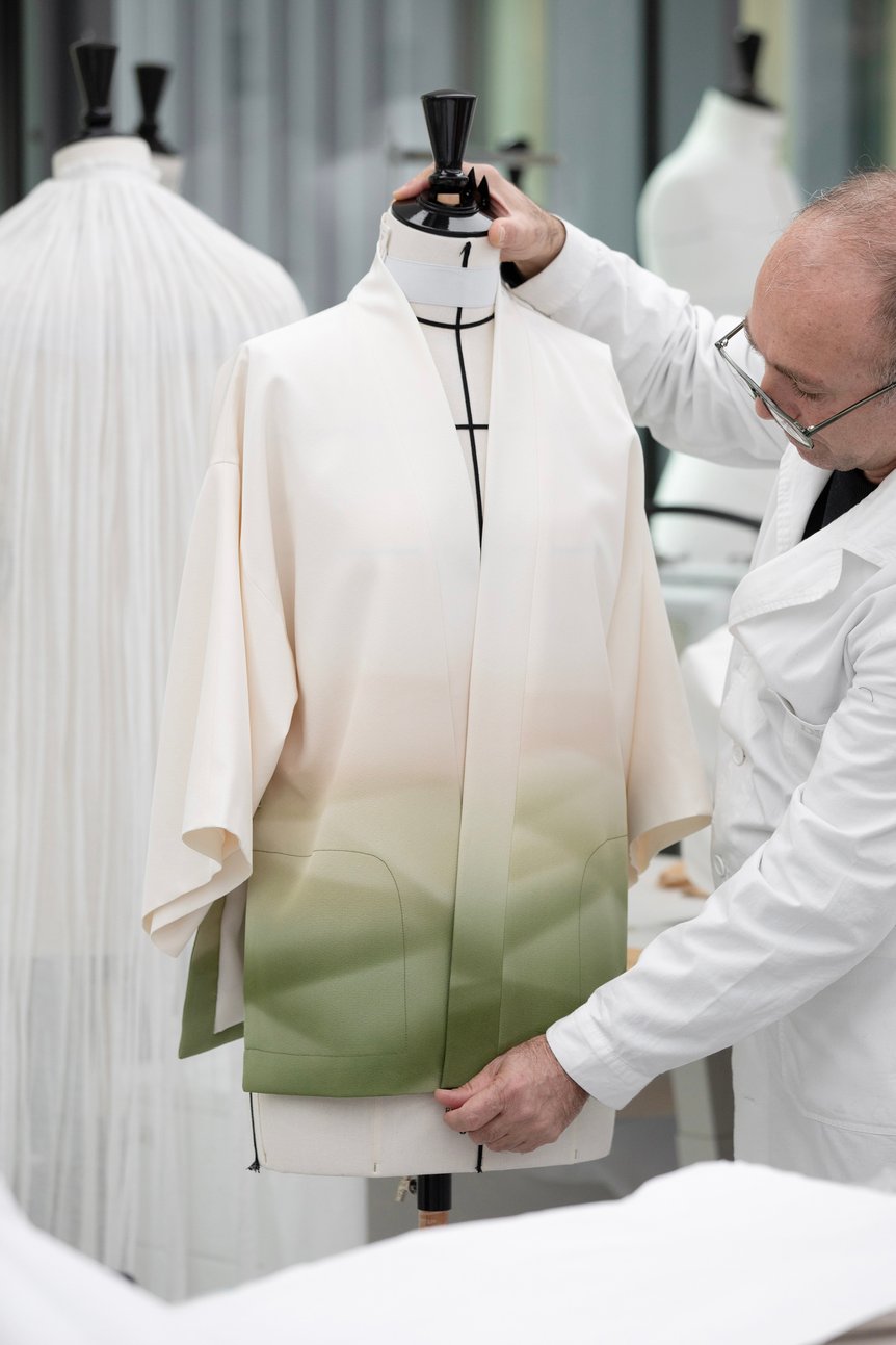 2025年フォールコレクションに向けたプロジェクトは約3年前から始まり、いずれも当時の織物を復元しつつ現代の感性で再解釈が加わった。龍村美術織物の烏丸工場では、72年前にディオールの生地制作に携わった西陣織の職人が、いまも現役で働いているという。