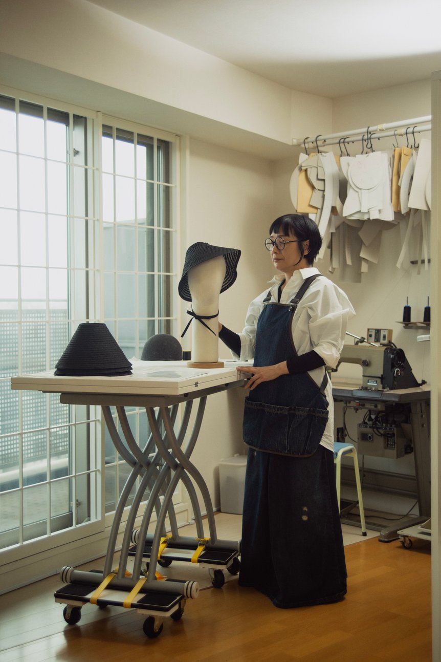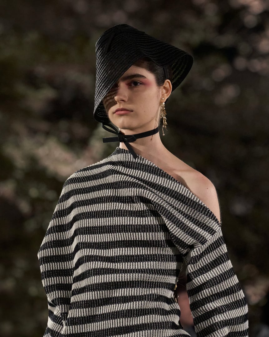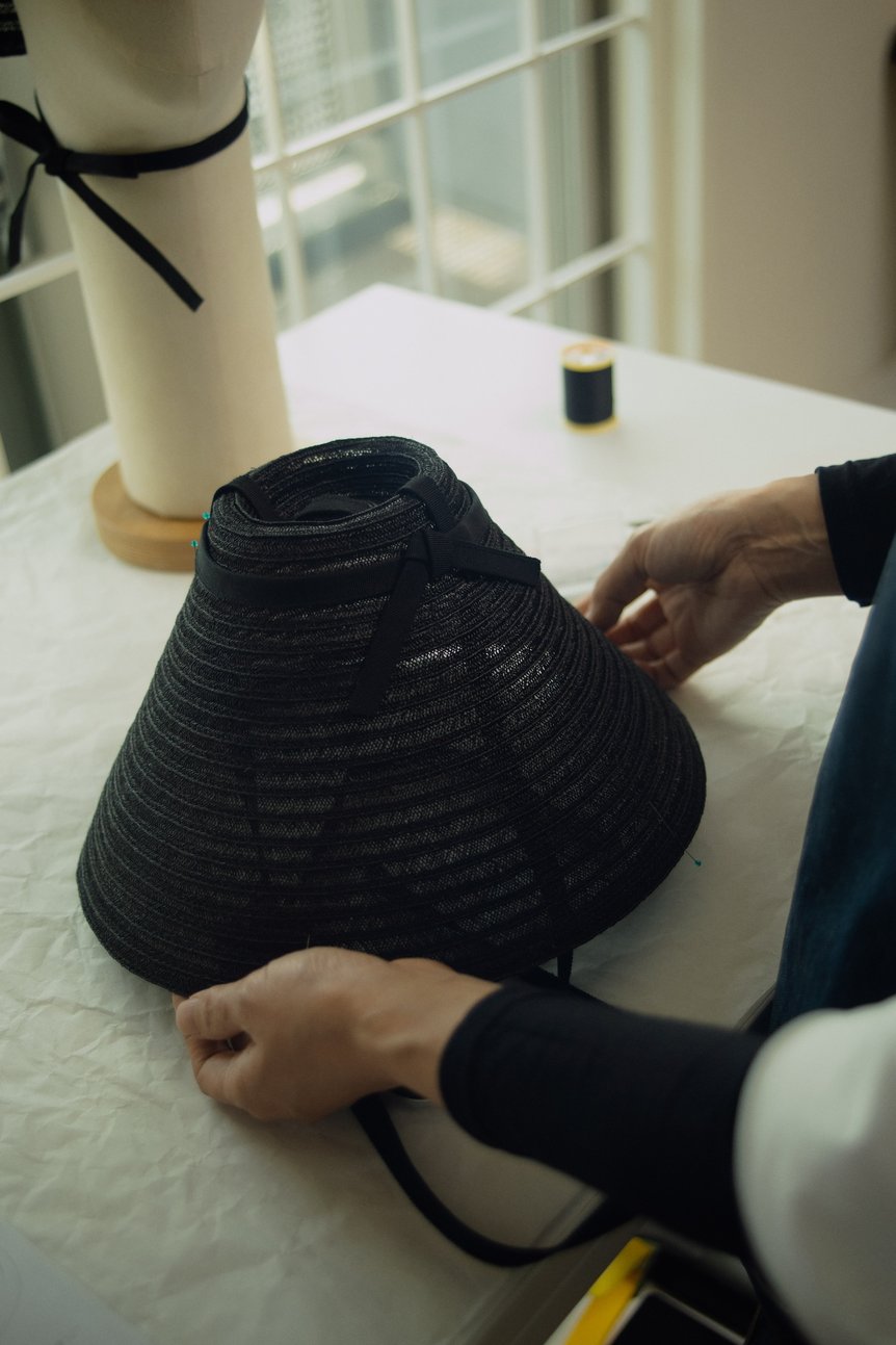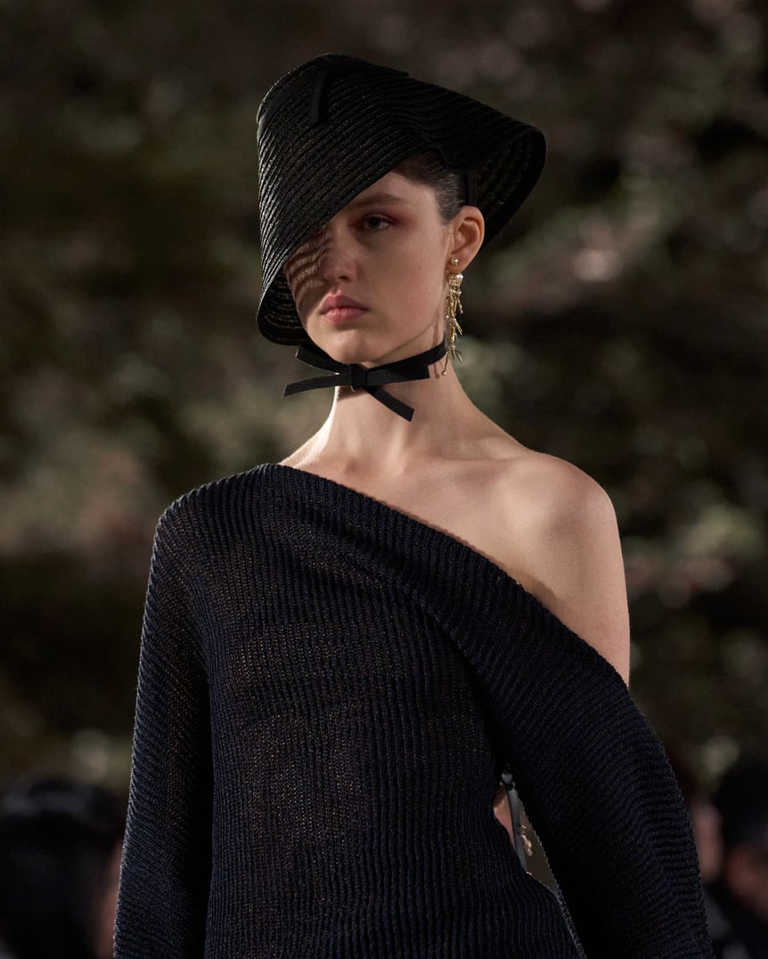 今回はディオールとスティーブン?ジョーンズとのトリプルコラボレーションとして、日本の伝統文化へのリスペクトを込め、「笠」から着想を得た帽子を制作。透ける黒の編み紐でモダンに仕上げ、東洋と西洋のスタイルを融合した。