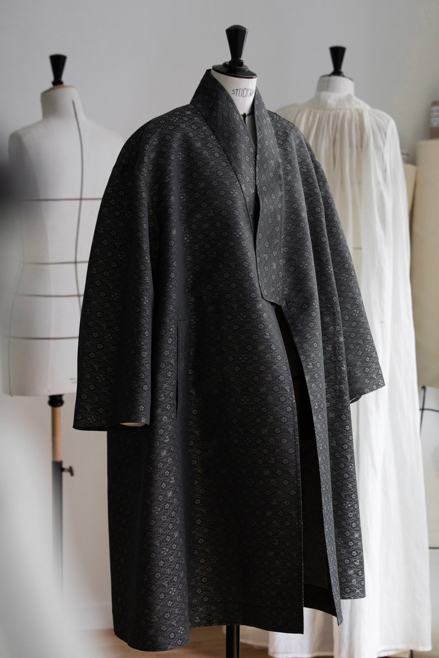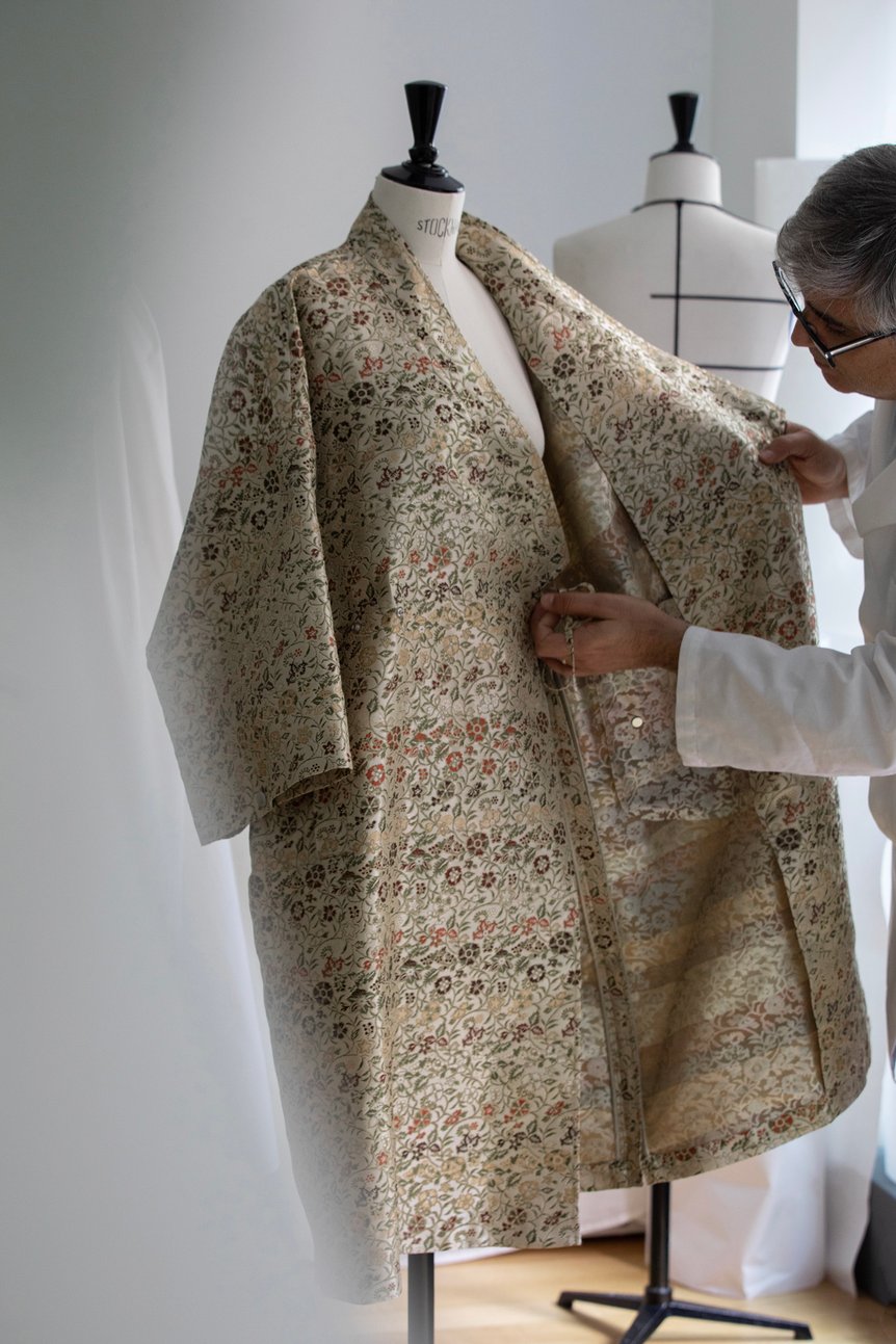 江戸時代から200年にわたり受け継がれてきたのは匠の技だけではなく、顧客のことを表す「華主(かしゅ)」という言葉に込められた「お召しになる方が主人公。その方をより引き立て、より美しくするのが我々の仕事(田畑喜八)」という考え方。マリア?グラツィアが手掛ける女性のための服作りと共鳴し、特別な一体に仕上がった。