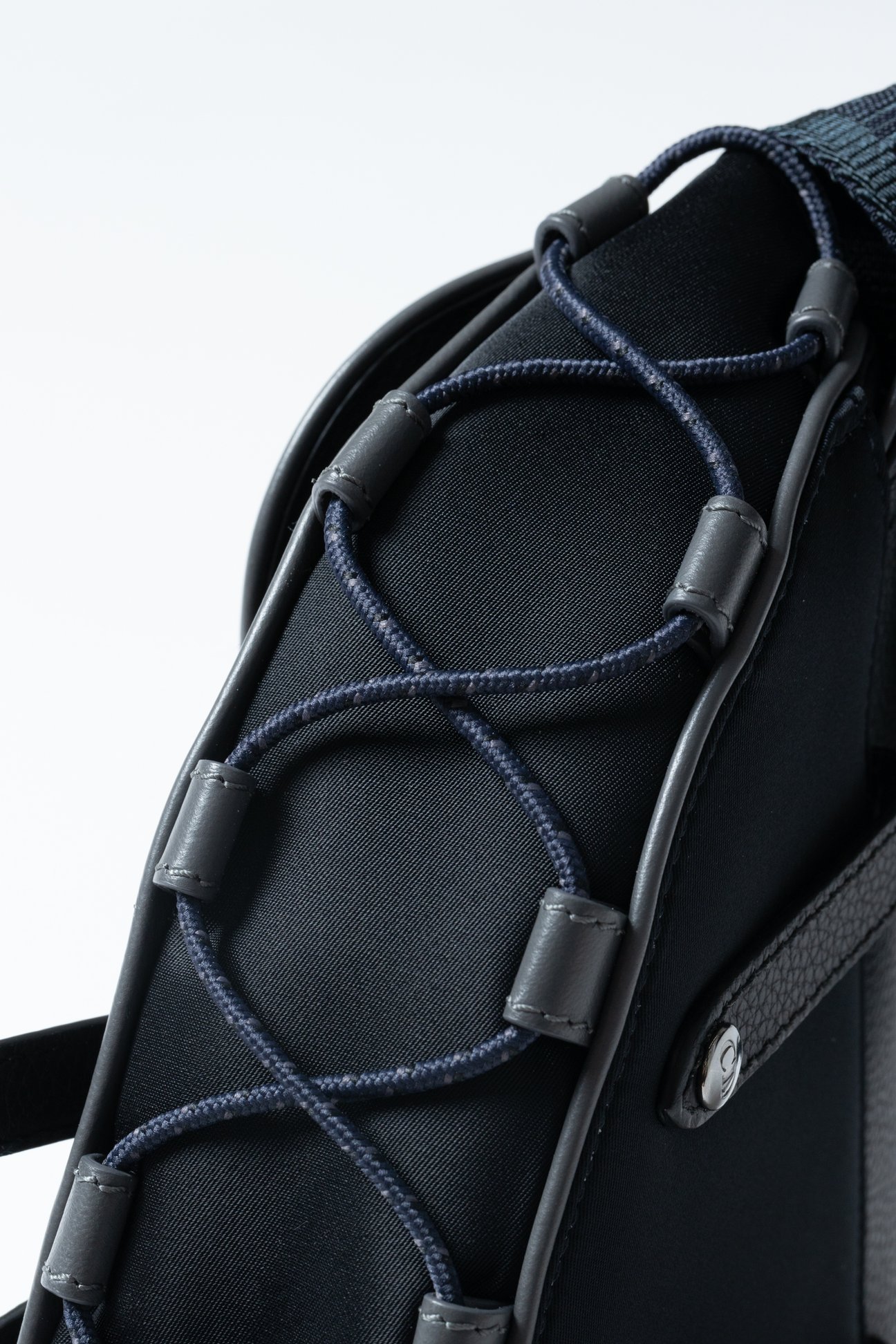 編集M:ディテールがよりギュッと詰まっていますね。こちらのカラータイプはブラックですが、ストラップやバンジーコードはネイビー。レザーのパイピングがブルーグレーだったり、落ち着いた配色なので合わせやすそう。