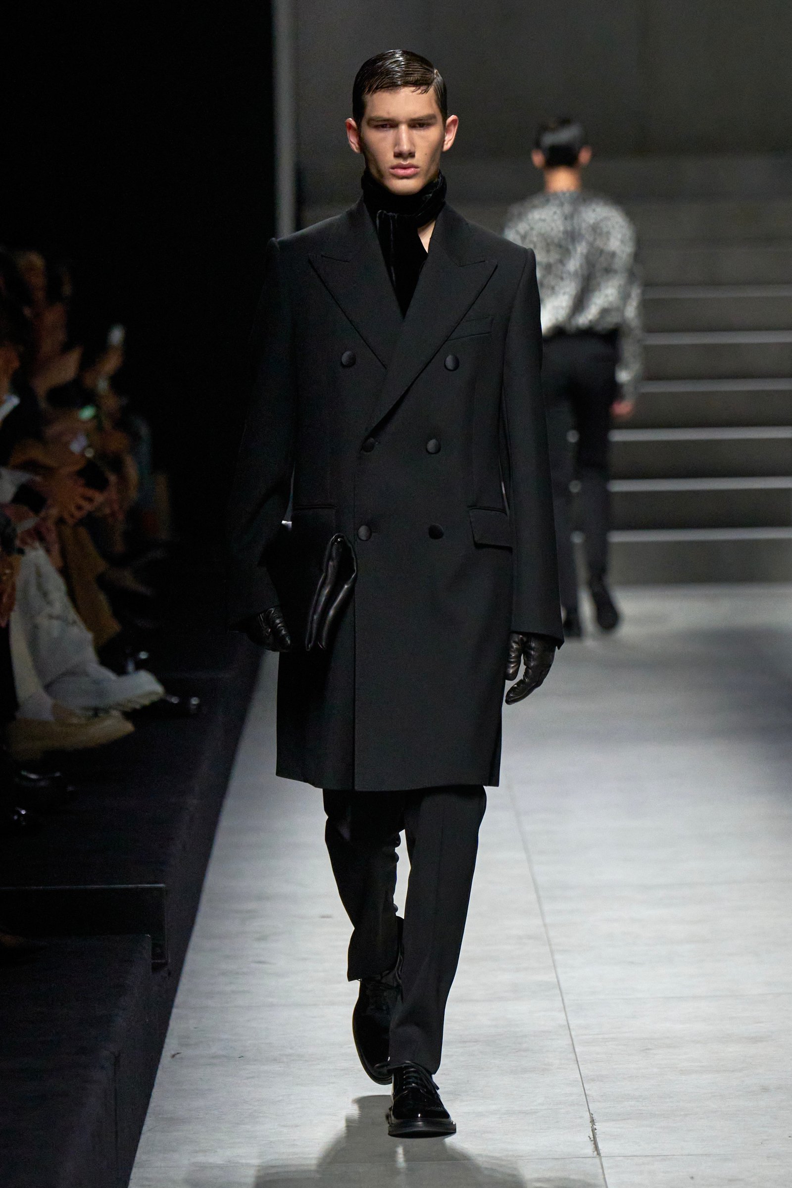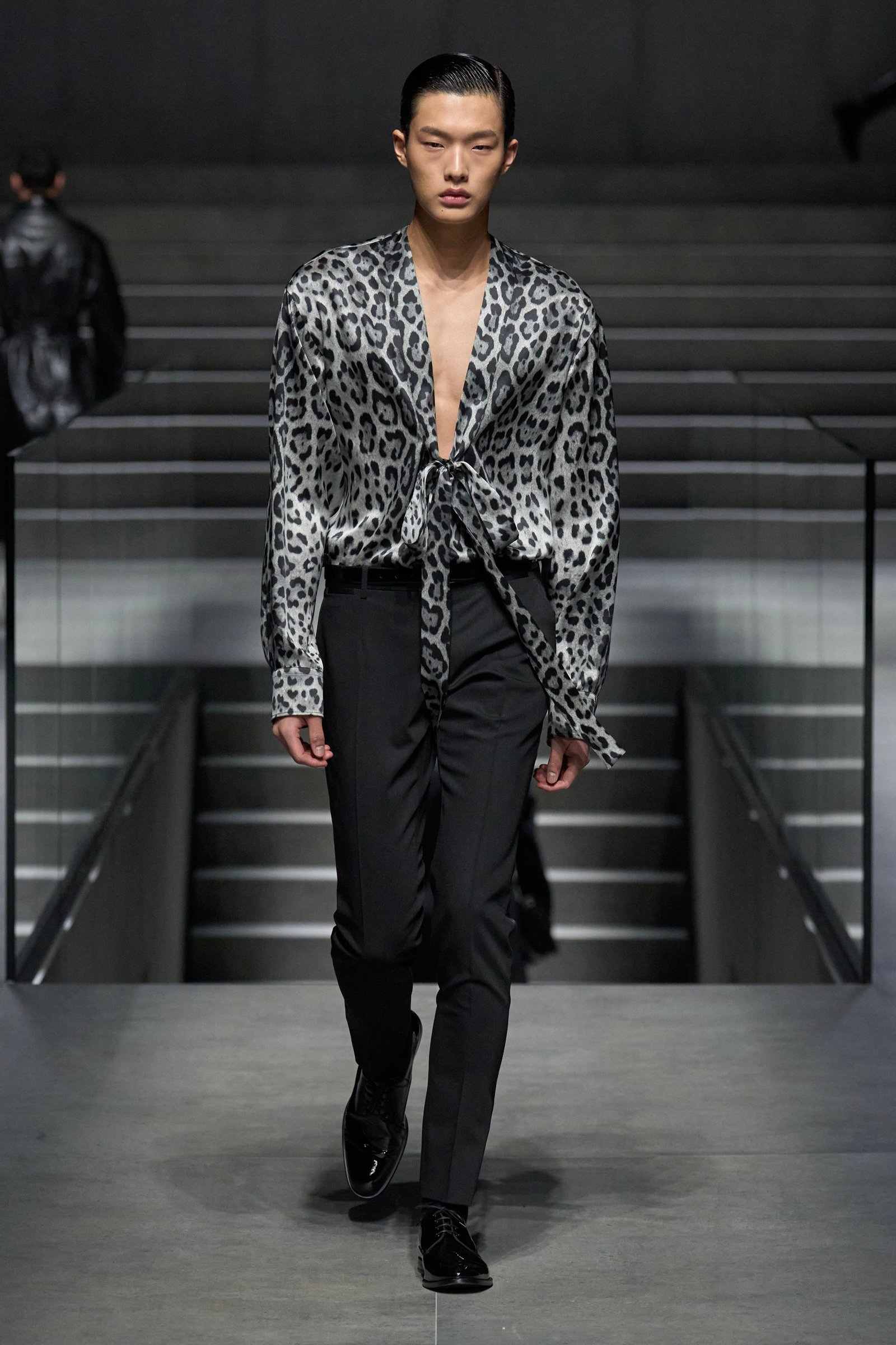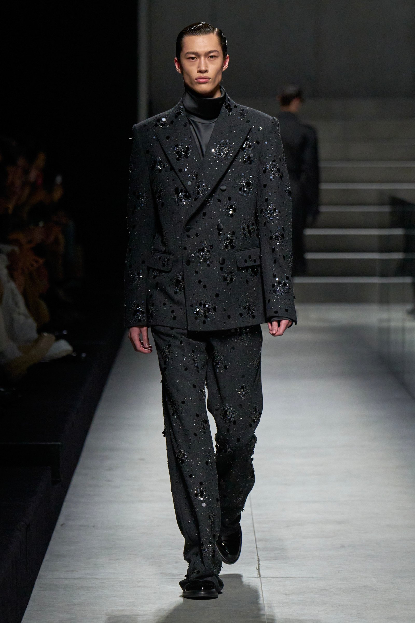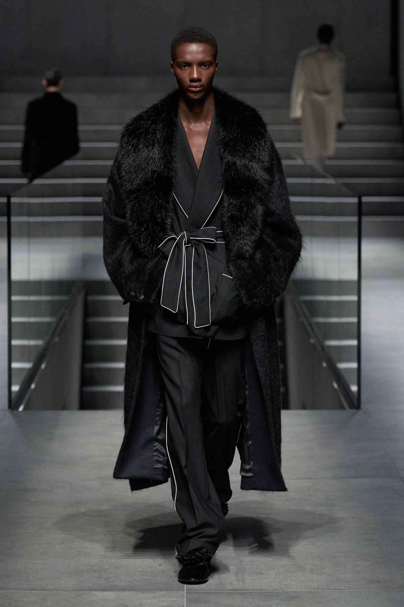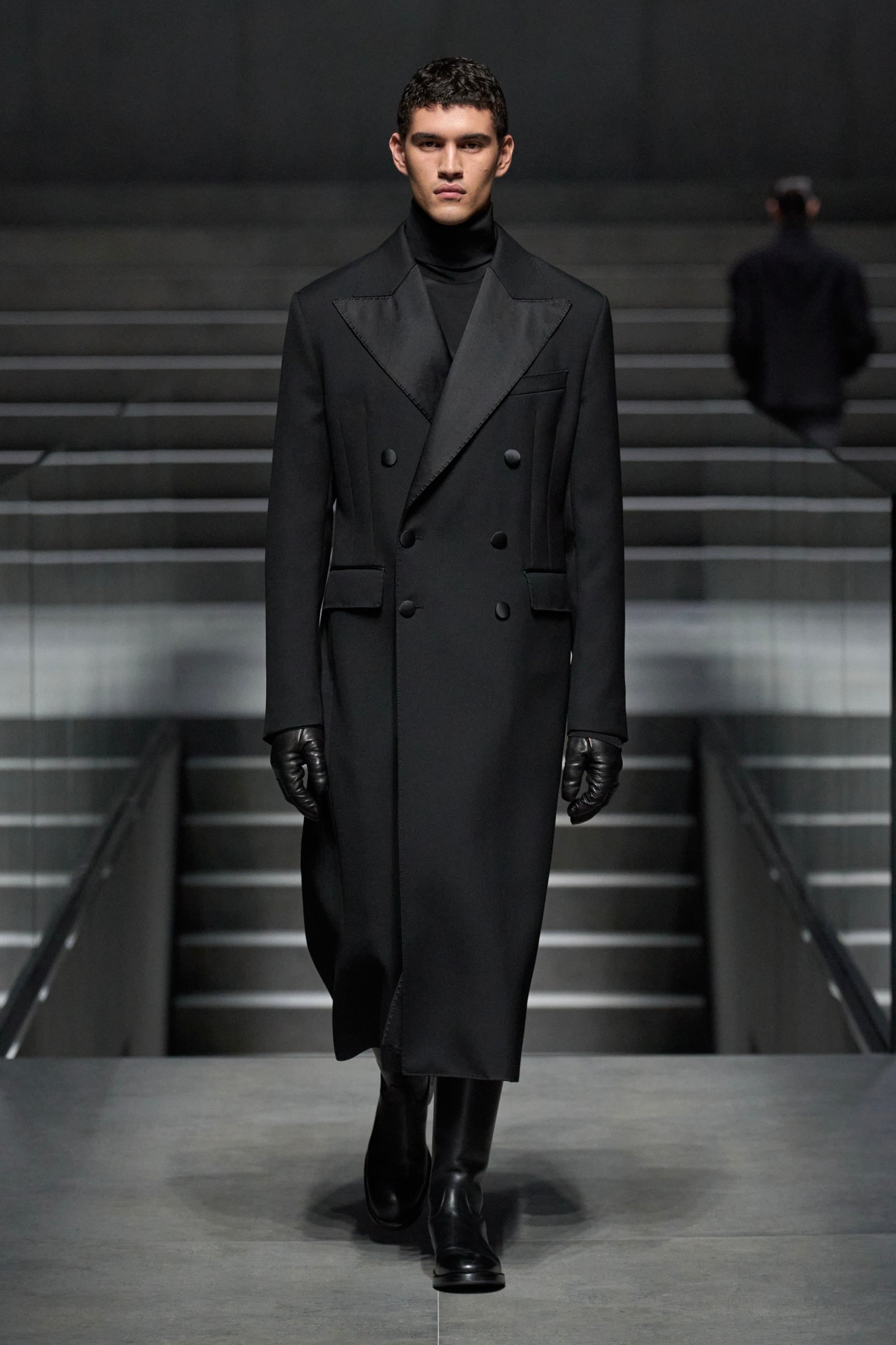全62ルックで構成された2024年秋冬メンズコレクションは、「艶のある」や「洗練された」といった意味を持つ「SLEEK」を軸に、サルトリアを駆使した黒が基調のオーセンティックなアイテム群で構成。ドルチェ&ガッバーナのアーカイヴを参照しつつ、編集を加えることでクラシックをモダナイズしている。ドルチェ&ガッバーナは毎回自社オフィスでショーを開催しているが、今回特別に階段を増設。モデルが階段を登ってくるという演出により、コートの裾が階段を登るたびに美しく流れたのも、生地の落ち感を見定める目とそれに合うパターンメイキングという確かな技術があってこそなせる技だ。