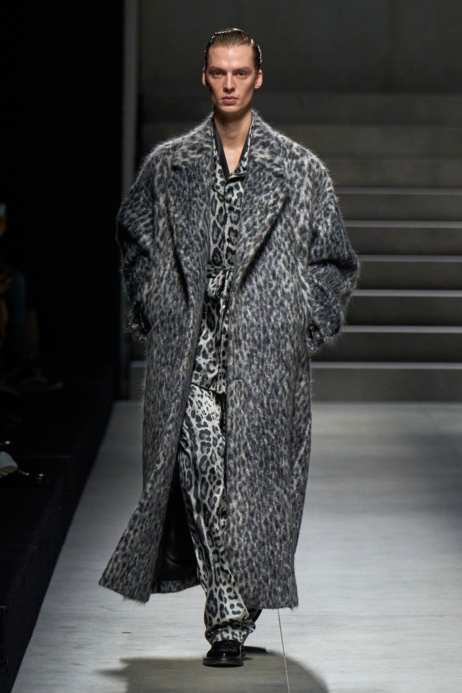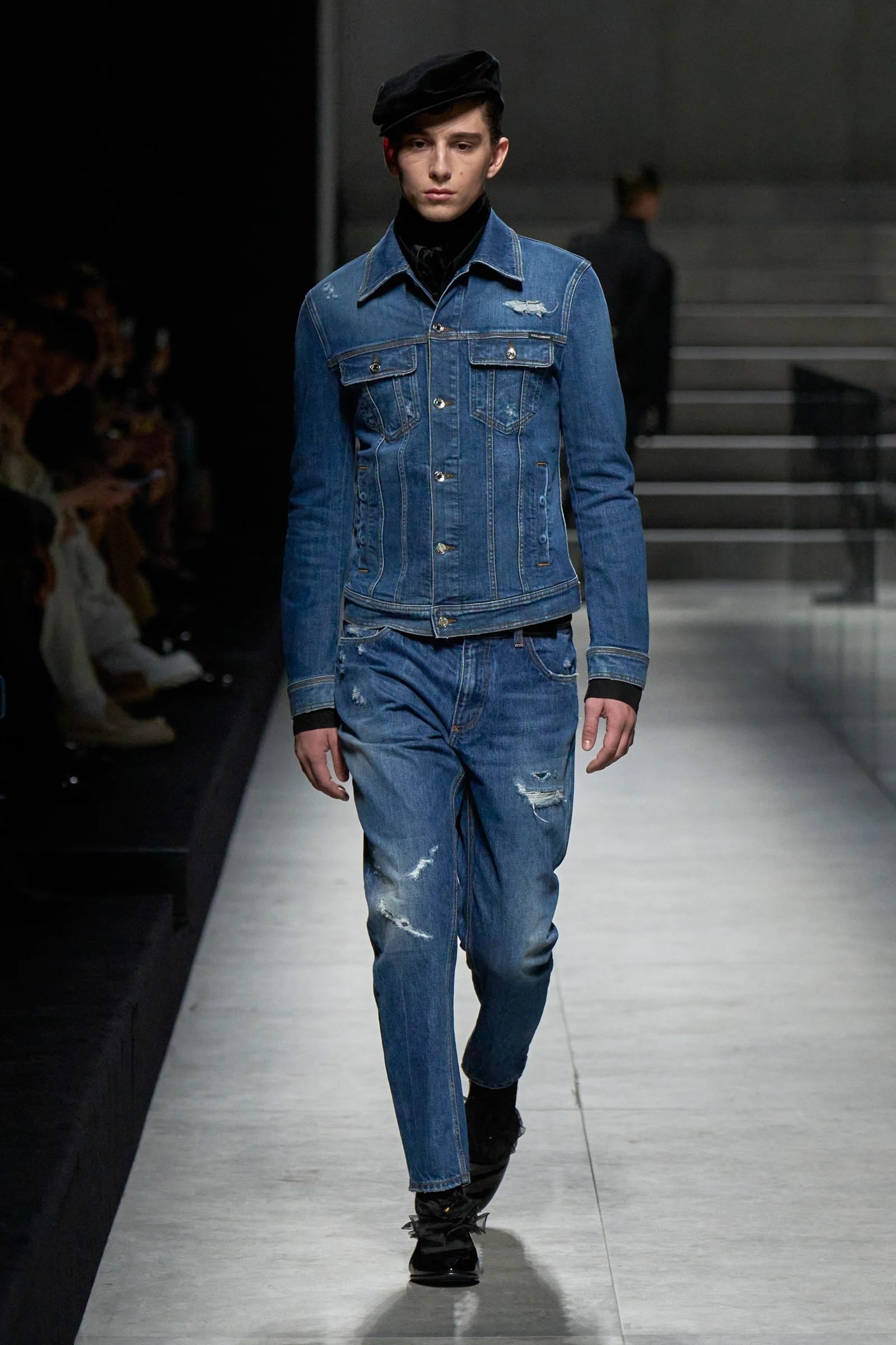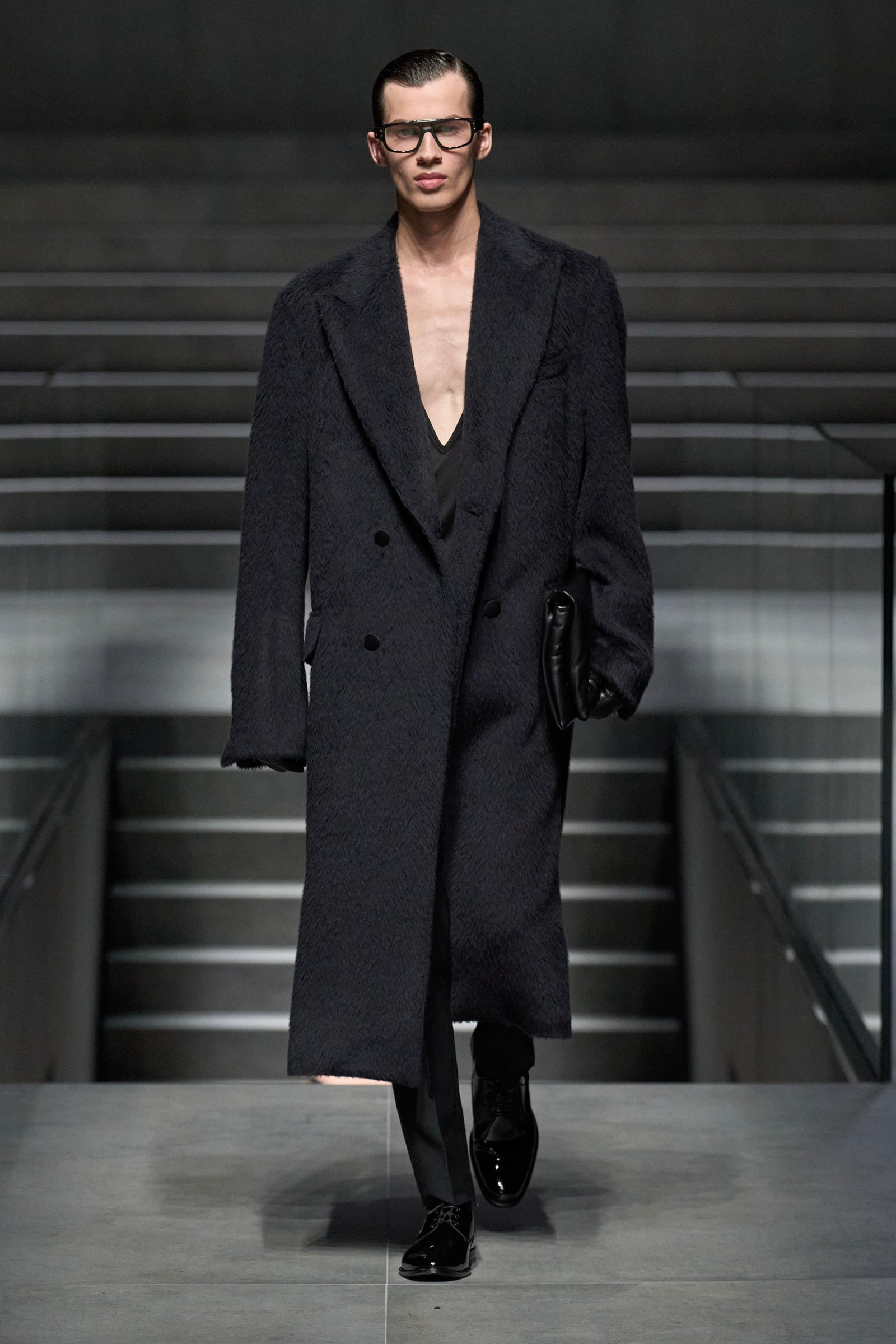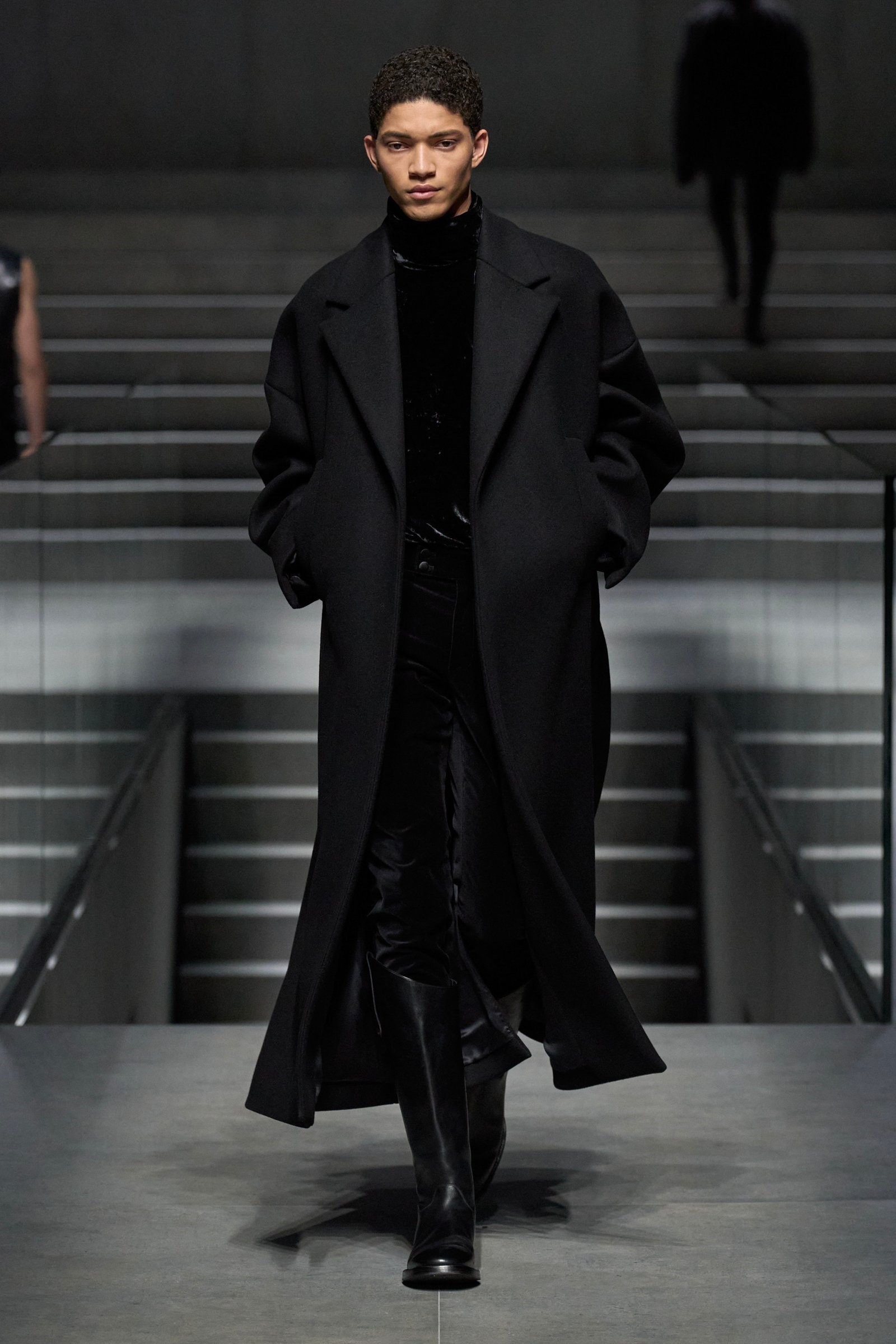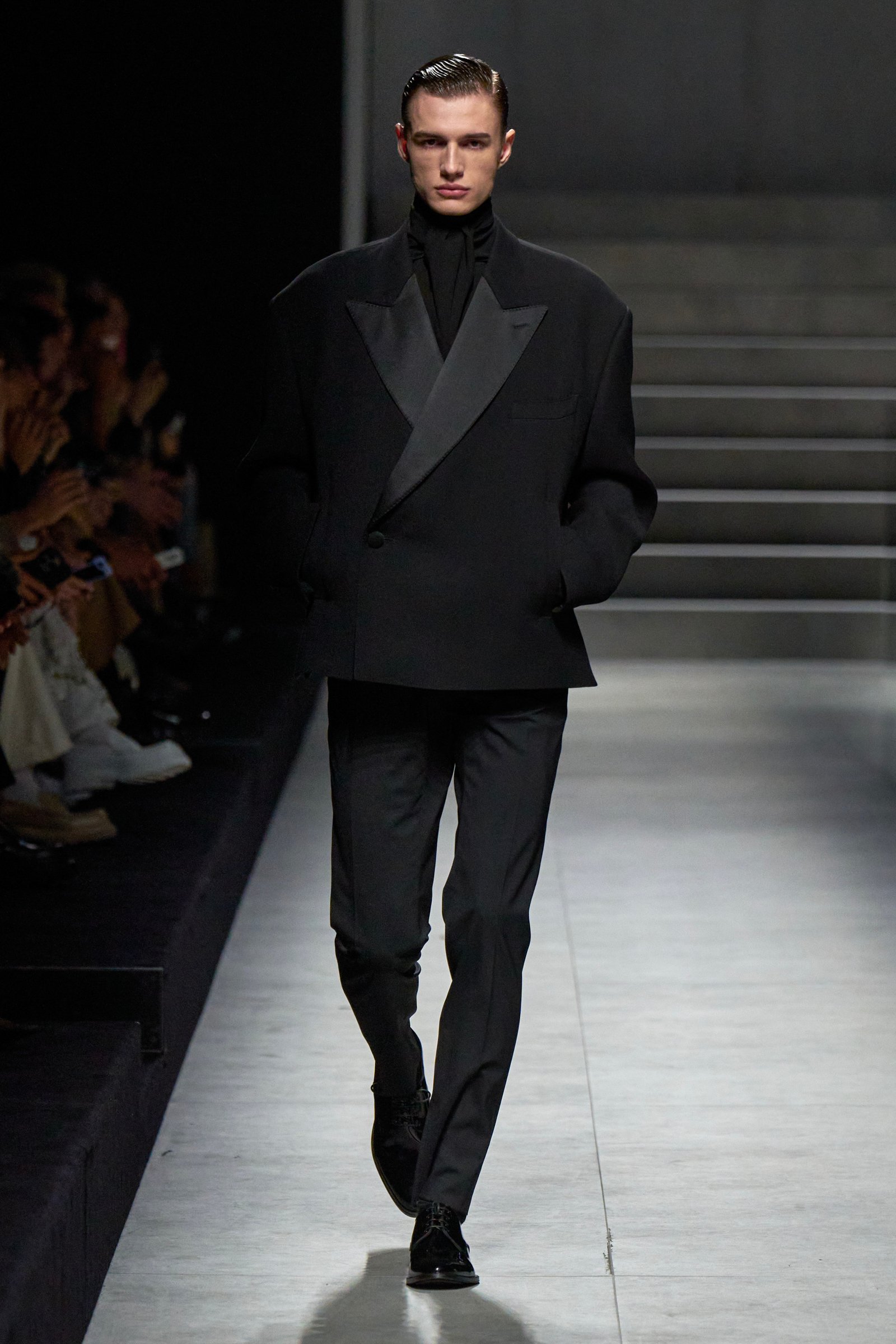 全62ルックで構成された2024年秋冬メンズコレクションは、「艶のある」や「洗練された」といった意味を持つ「SLEEK」を軸に、サルトリアを駆使した黒が基調のオーセンティックなアイテム群で構成。ドルチェ&ガッバーナのアーカイヴを参照しつつ、編集を加えることでクラシックをモダナイズしている。ドルチェ&ガッバーナは毎回自社オフィスでショーを開催しているが、今回特別に階段を増設。モデルが階段を登ってくるという演出により、コートの裾が階段を登るたびに美しく流れたのも、生地の落ち感を見定める目とそれに合うパターンメイキングという確かな技術があってこそなせる技だ。