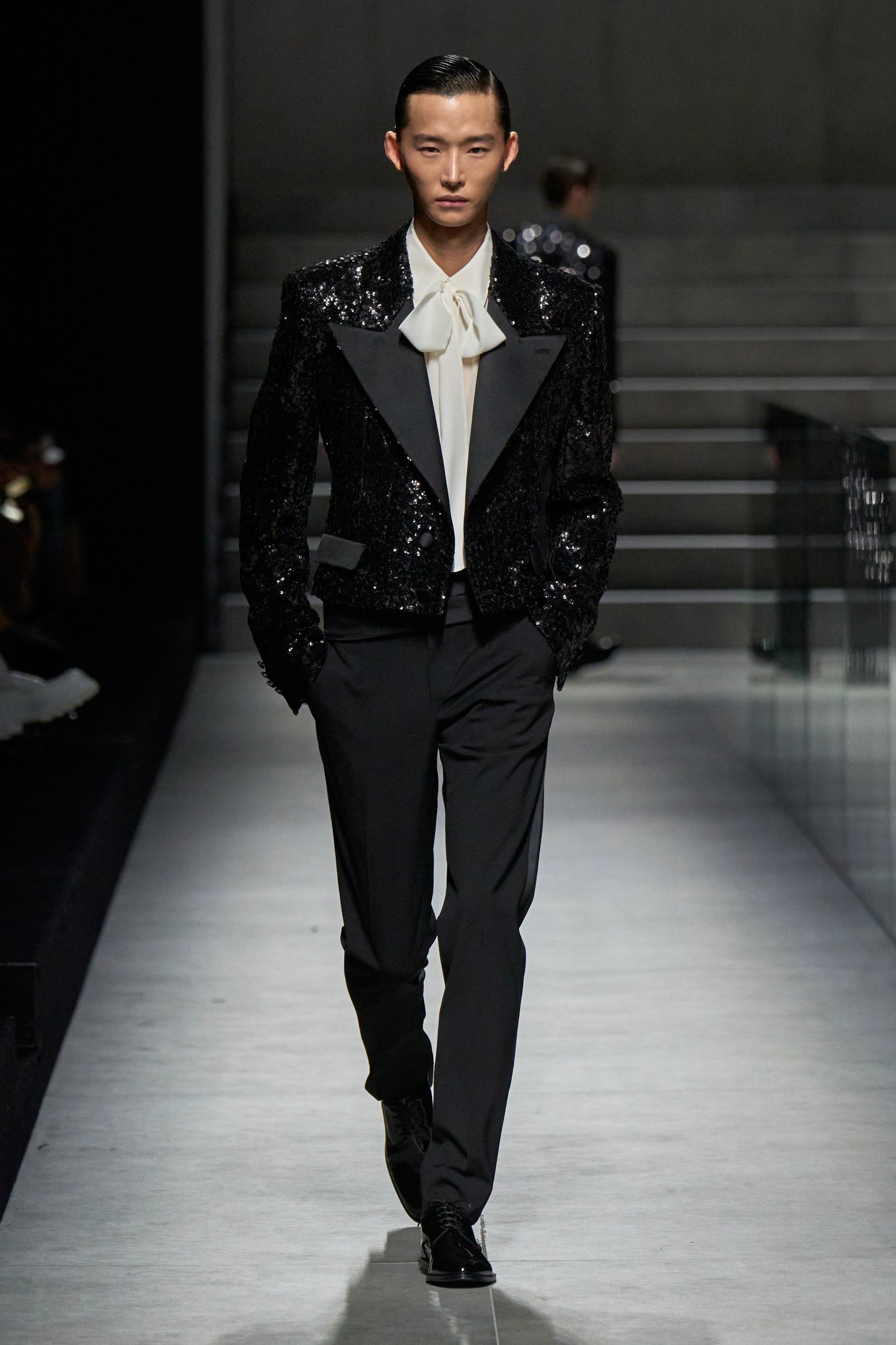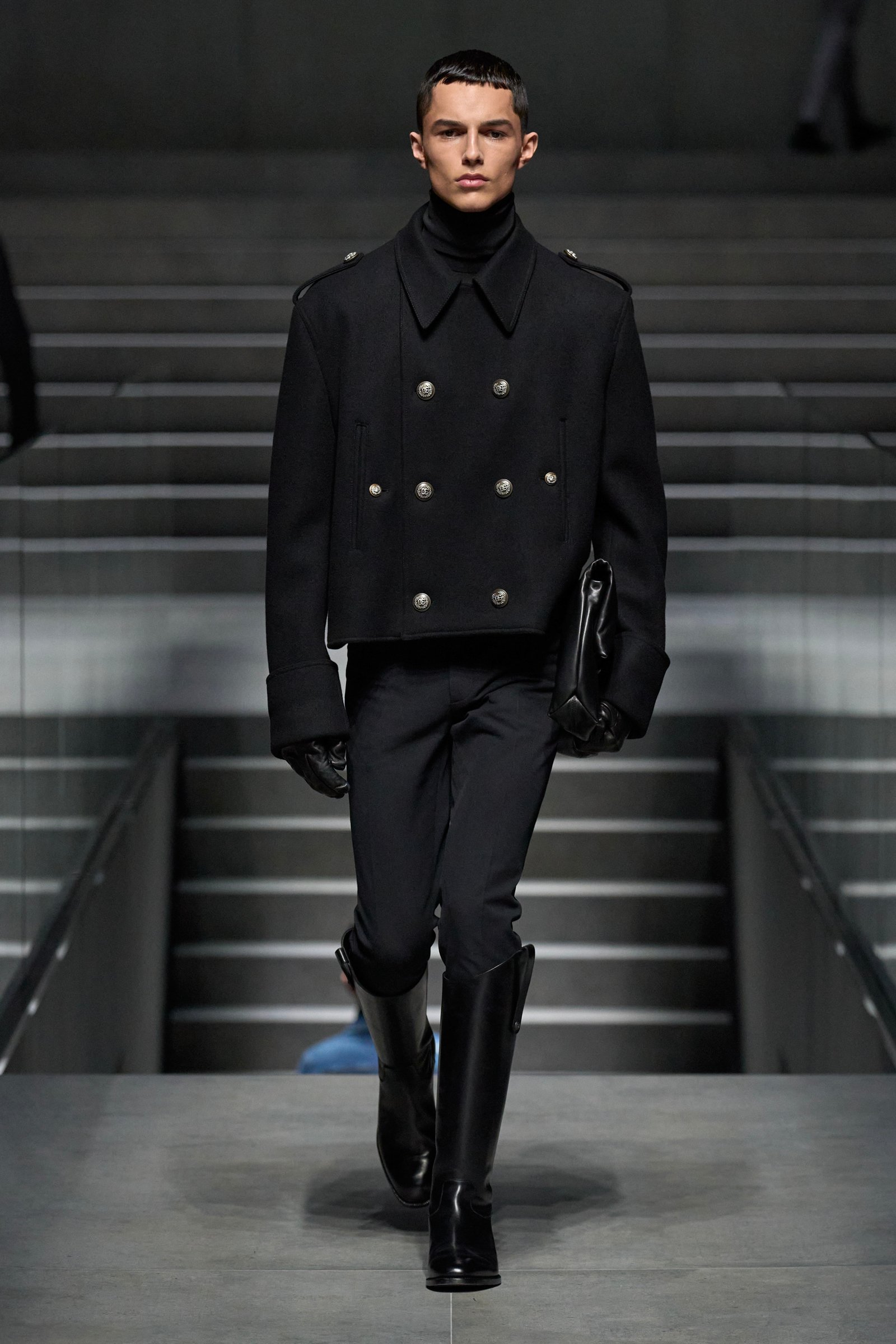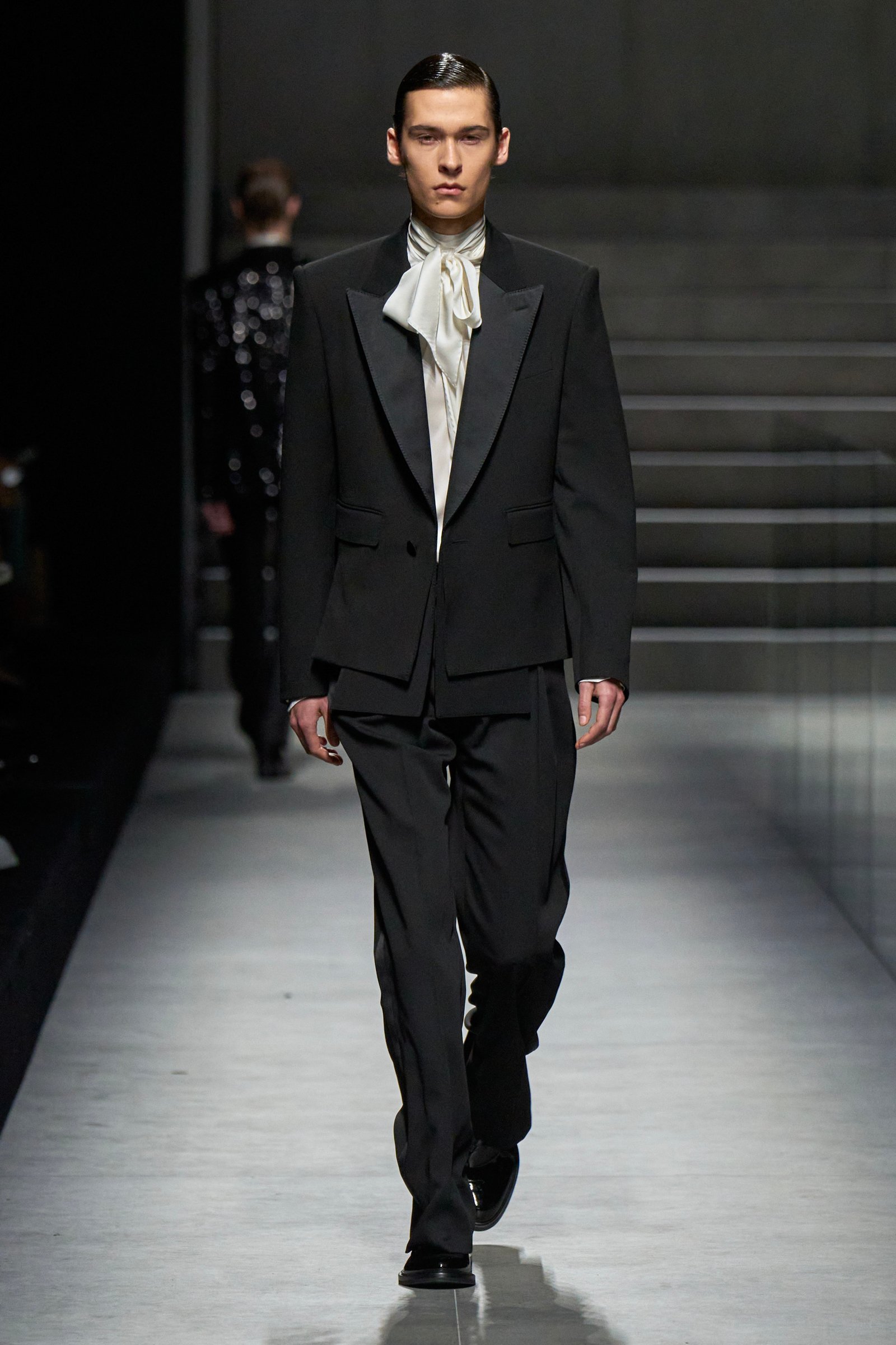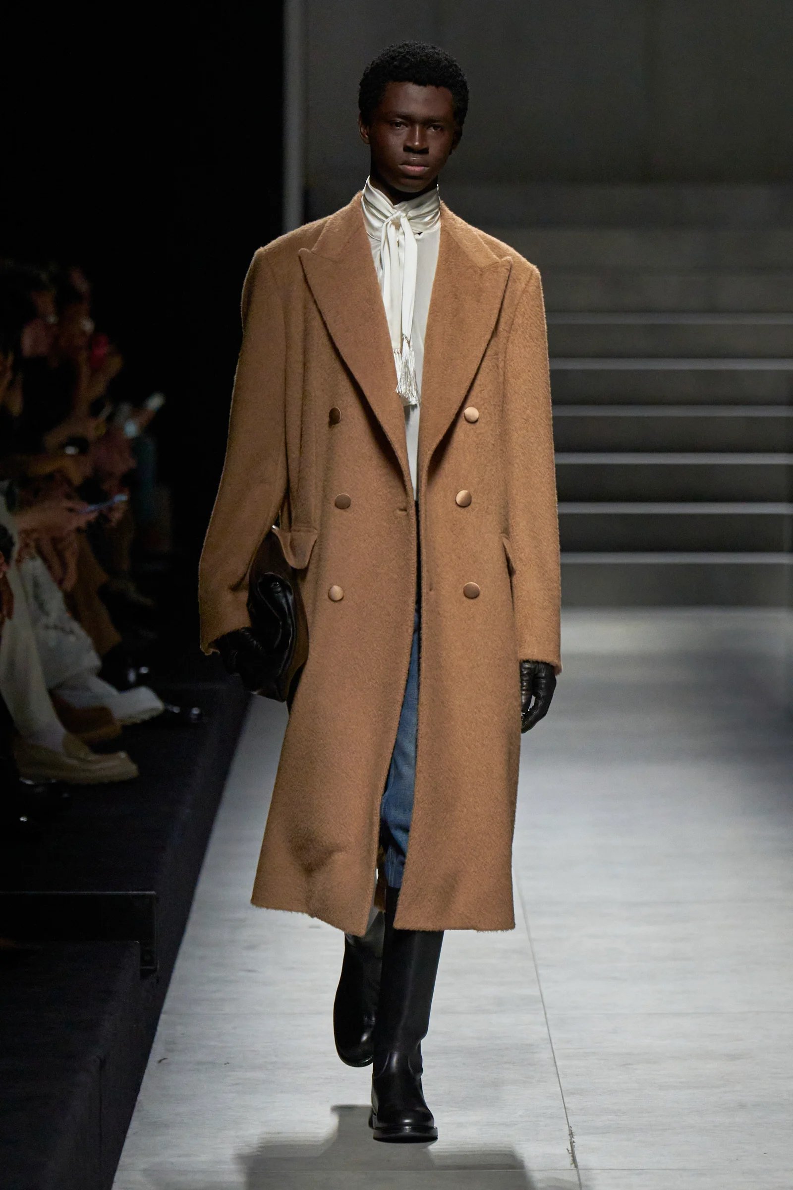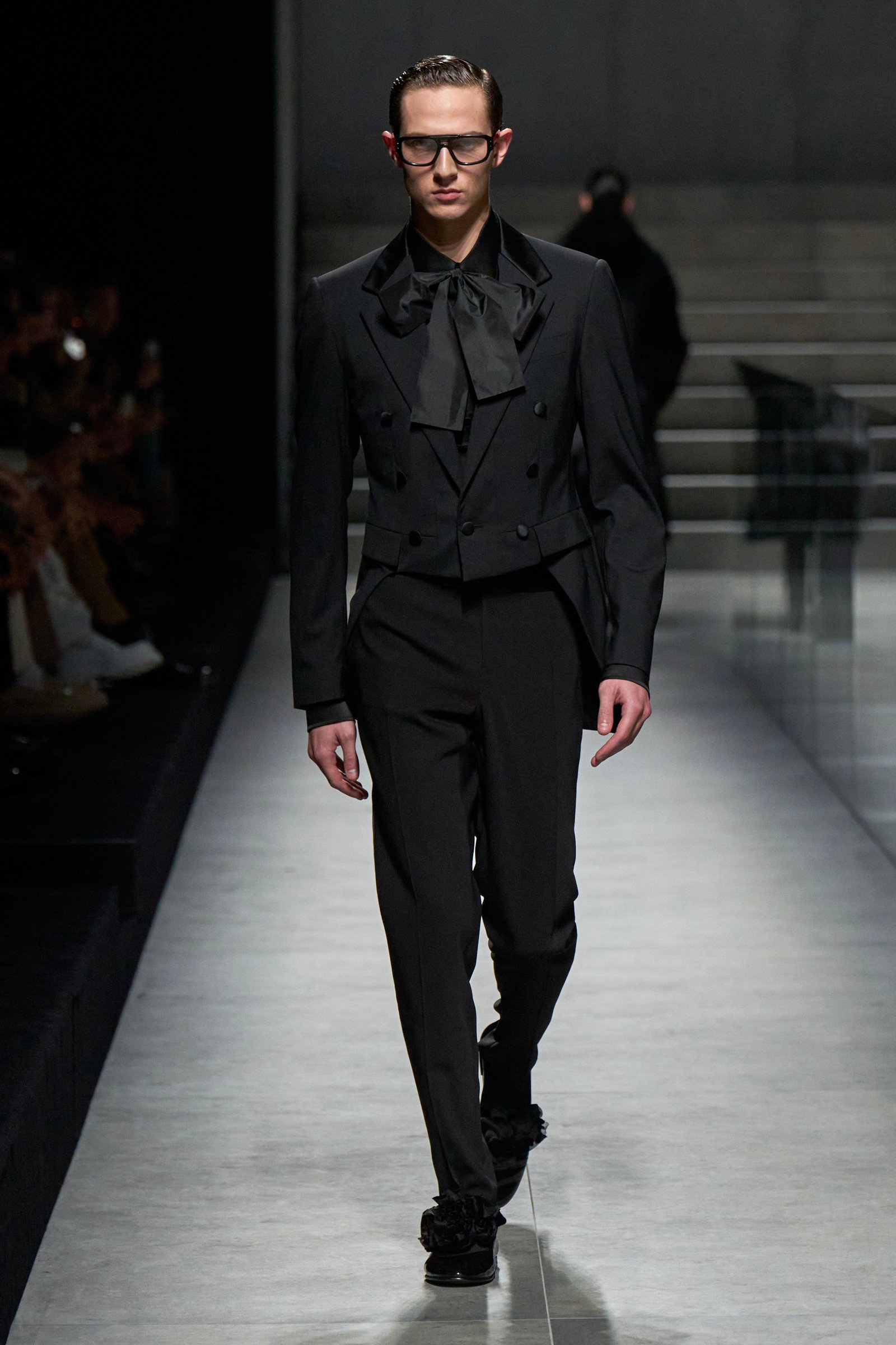 全62ルックで構成された2024年秋冬メンズコレクションは、「艶のある」や「洗練された」といった意味を持つ「SLEEK」を軸に、サルトリアを駆使した黒が基調のオーセンティックなアイテム群で構成。ドルチェ&ガッバーナのアーカイヴを参照しつつ、編集を加えることでクラシックをモダナイズしている。ドルチェ&ガッバーナは毎回自社オフィスでショーを開催しているが、今回特別に階段を増設。モデルが階段を登ってくるという演出により、コートの裾が階段を登るたびに美しく流れたのも、生地の落ち感を見定める目とそれに合うパターンメイキングという確かな技術があってこそなせる技だ。