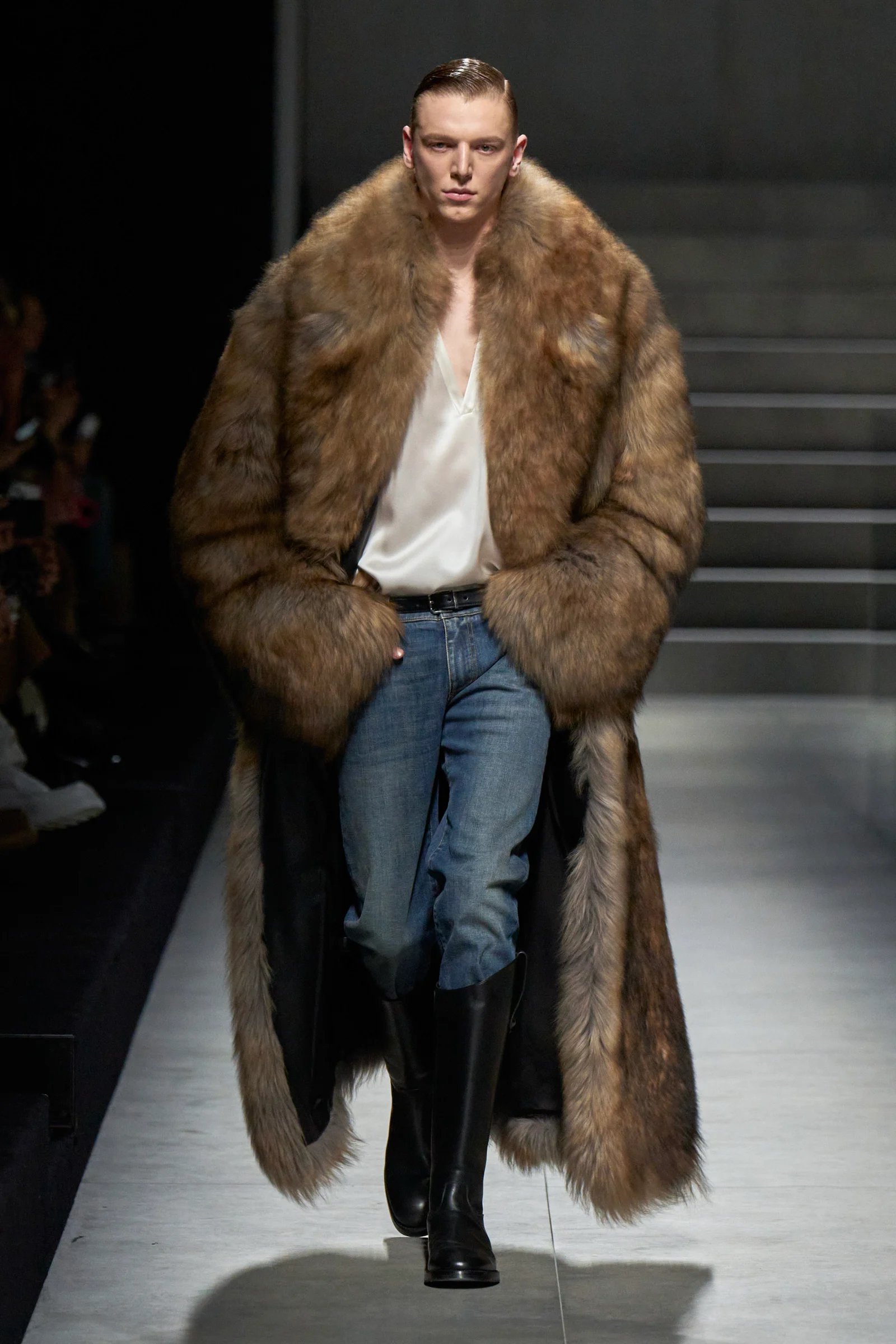 モノトーンのコレクションにアクセントとして差し込まれたのは、デニムやキャメル、レオパード柄。エレガンスを象徴するかのようなファーコートは、全てエコファーで作られているが、本物の毛皮と見紛うほどのクオリティに仕上がっている。