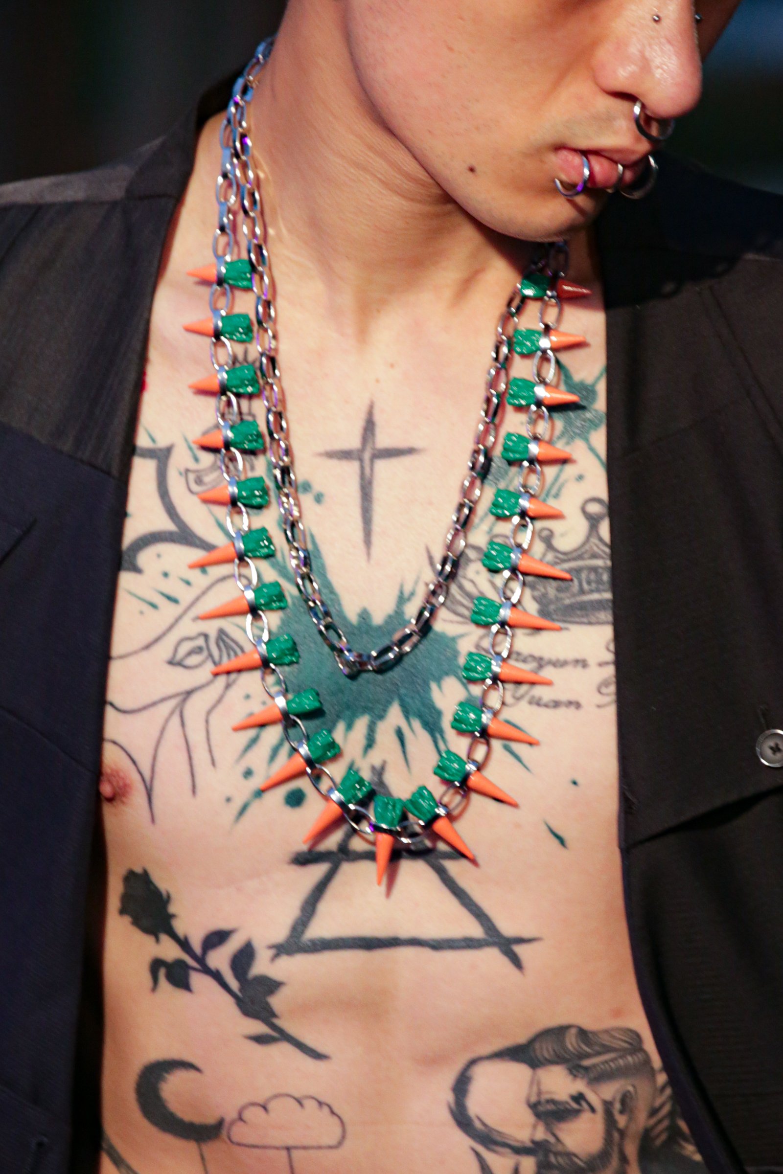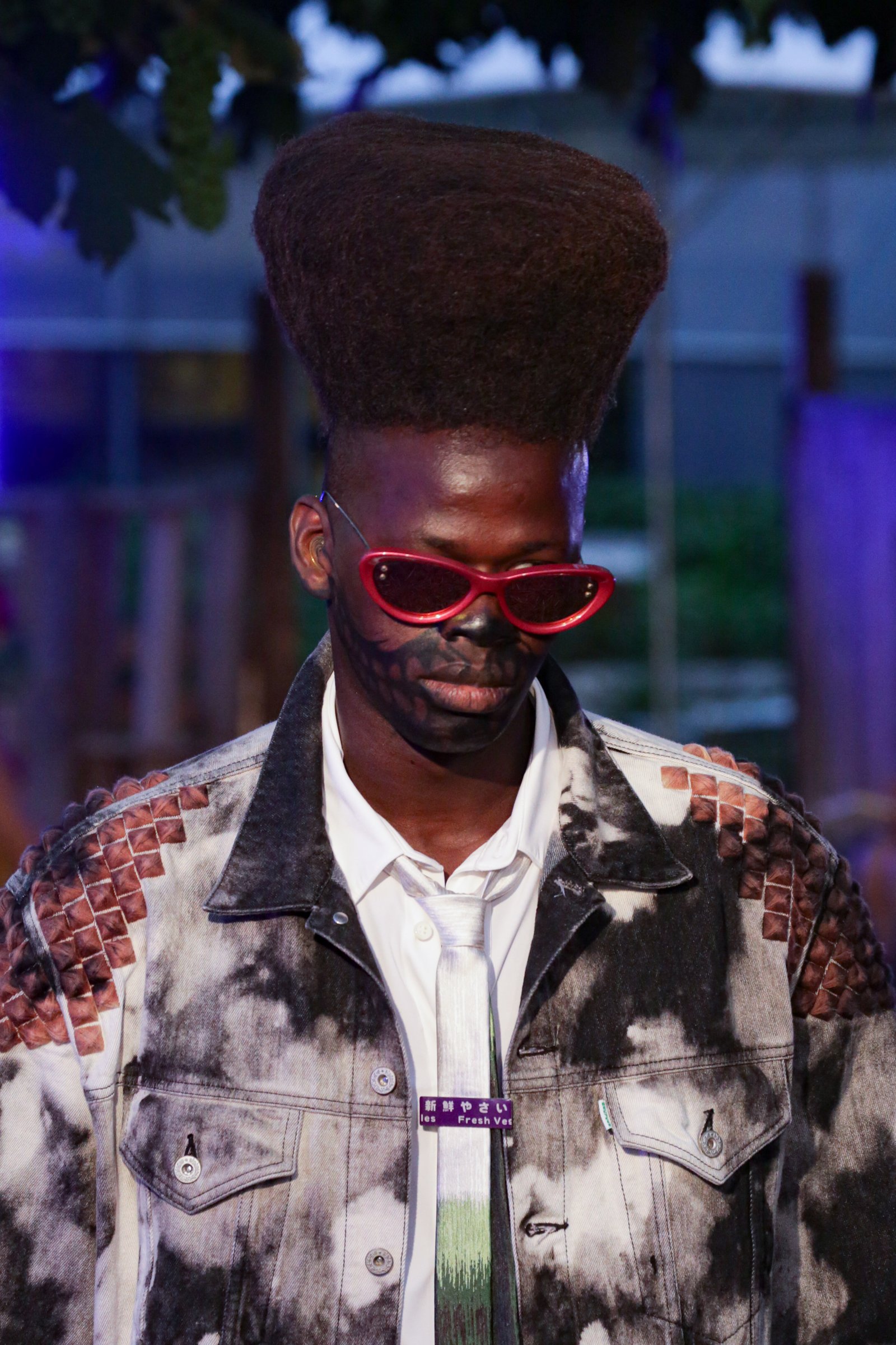 ファーストルックのライダースベストは、よく見るとスタッズや装飾が全て刺繍で表現されている。その騙し絵のような刺繍の技術を用いたダメージレスのダメージジーンズも登場した。パンクだけではなく、中盤はヤンキー風やギャル風、そして顔に「へのへのもへじ」が書かれたかかしを模したシュールなスタイルが混ざり、笑いを誘う。