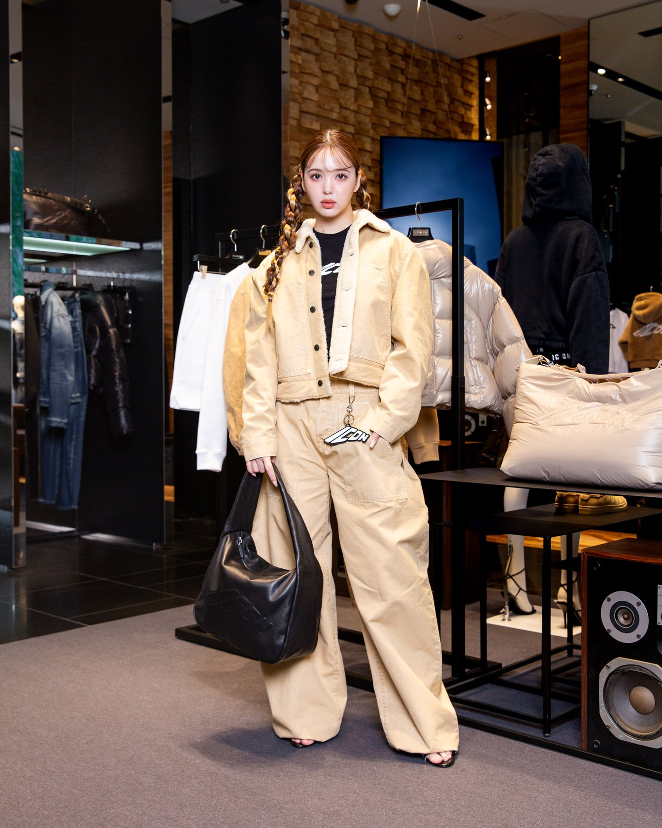 「このショート丈のフーディー、かわいいですね。着てみたい!」と笑顔を見せたのは藤田ニコル。早速、袖を通して着心地を確かめた。「見たことのない形のフードに一目惚れ。柔らかい素材に包まれる感覚です」。そしてキャメルのブルゾンとワイドパンツをセットアップで着用し、店内を巡りながらシューティング。「一見するとシンプルなのに、形が特徴的。特にパンツのラインがカッコ良くてスタイルアップできるので、テンションがアガりました」。