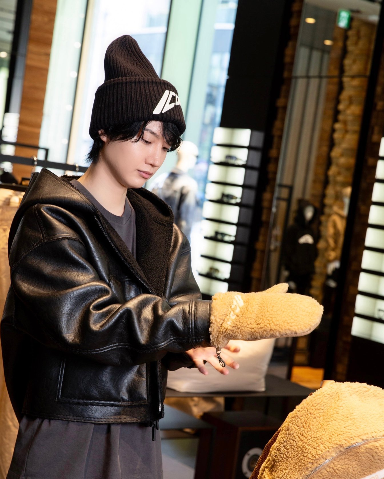 桜田通が気になったアイテムは、テディフリースのフーディー。「ふわふわな手触りと、背中のロゴがアイコニックで好きです」。シューティングではブラックのレザーフーディとサイドジップのパンツを着用した。特に惹かれたのはシルエットだという。「黒でまとめているけど少し大きめのフォルムがストリート感もあって、着た瞬間からとてもお気に入りになりました」。