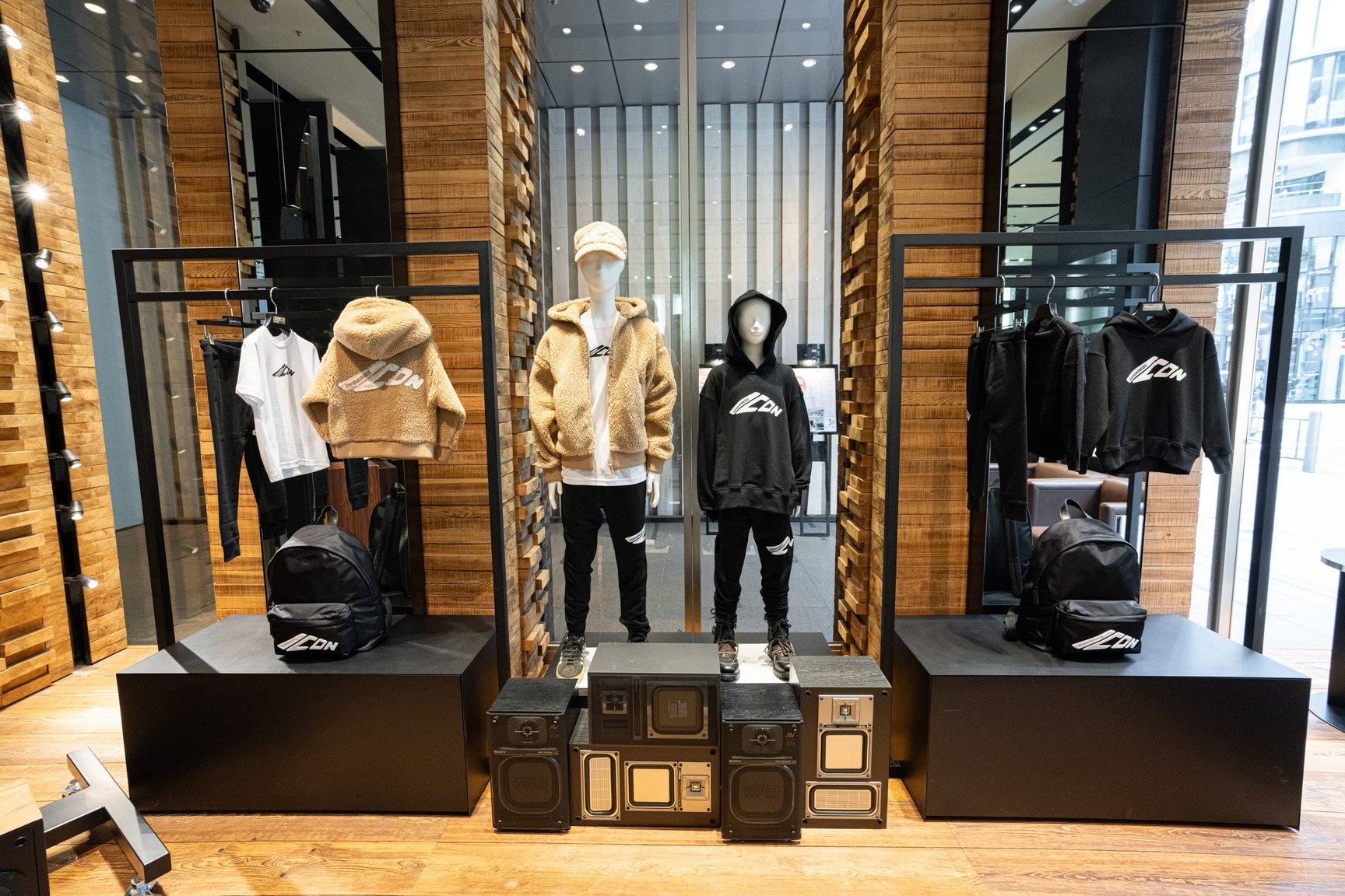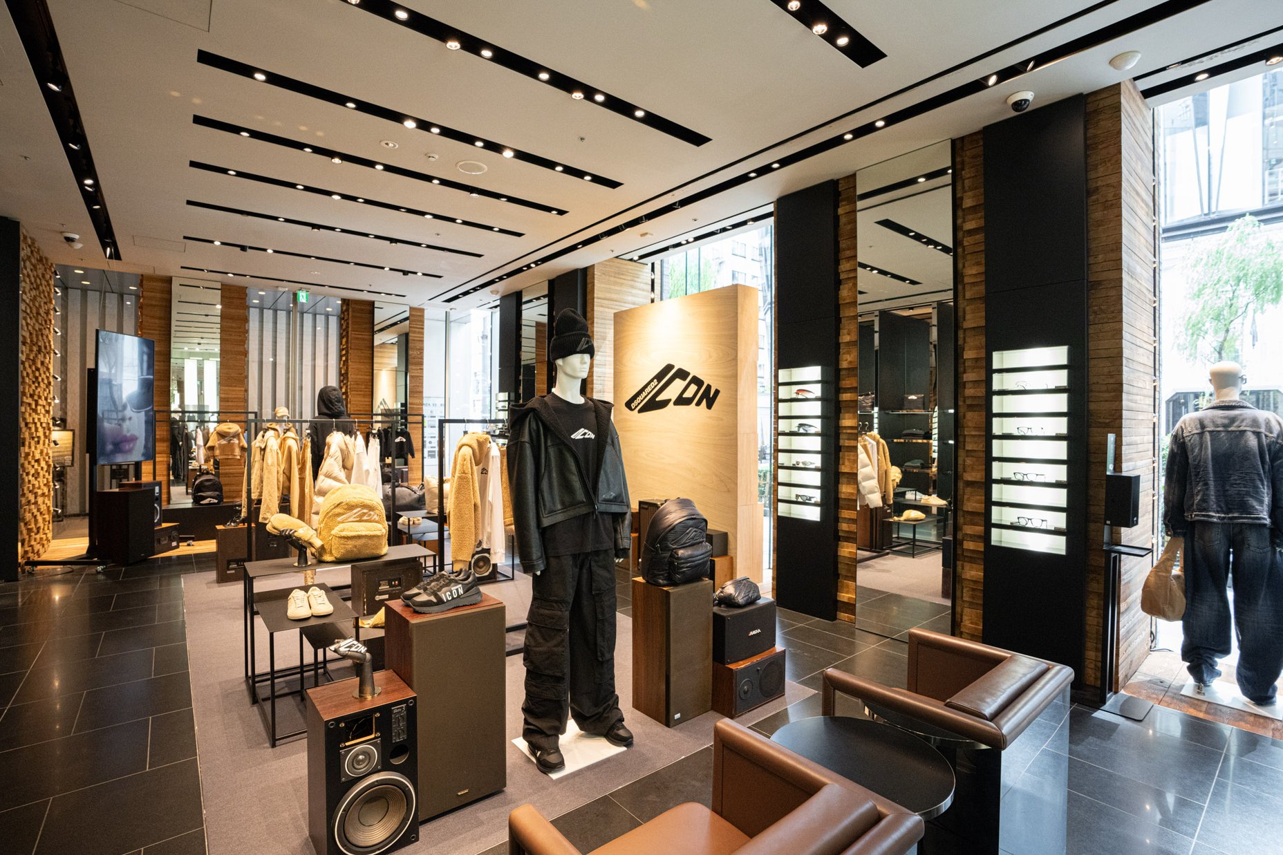 東京店1階で開催されているポップインストアは、ヴィンテージライクなステレオスピーカーを積み上げた空間に商品をフルラインナップ。どこか懐かしさを感じる佇まいのウーファーを差し込むことで、「アイコン ニュー ジェネレーション」の都会的でスポーティーな要素がいっそう引き立つ特別なレイアウトとなっている。