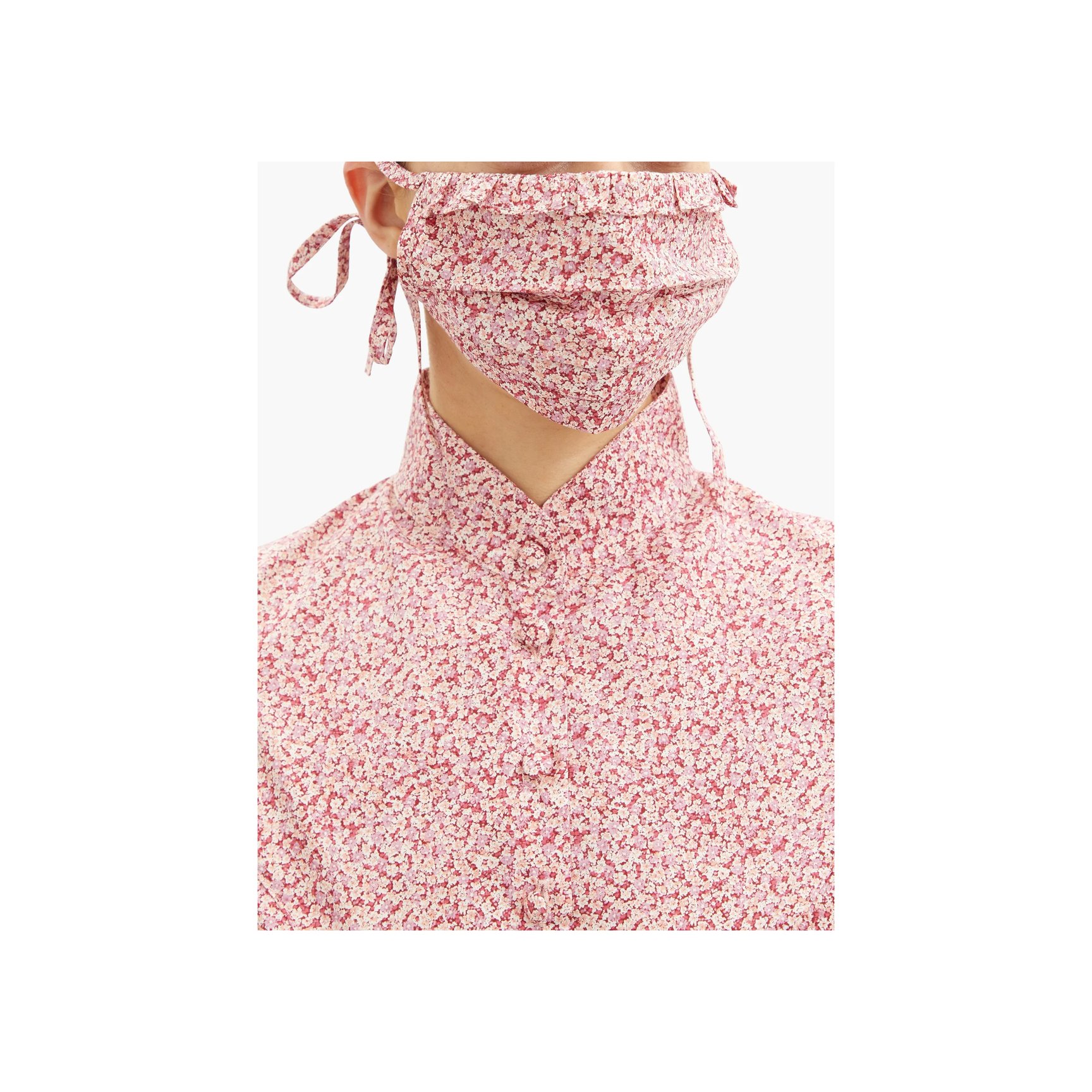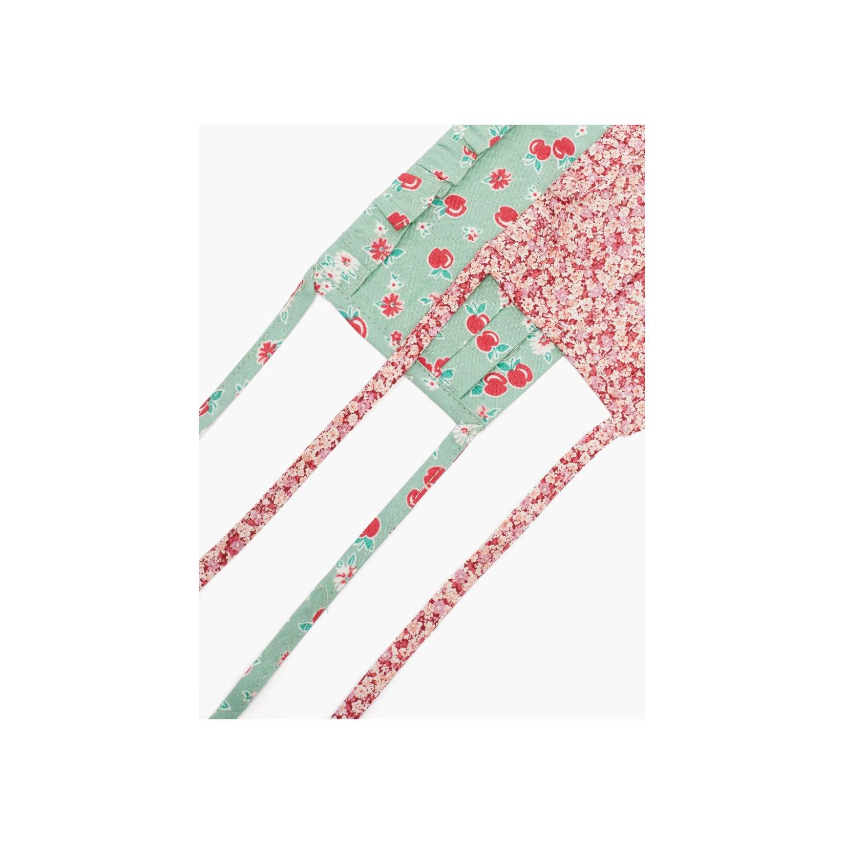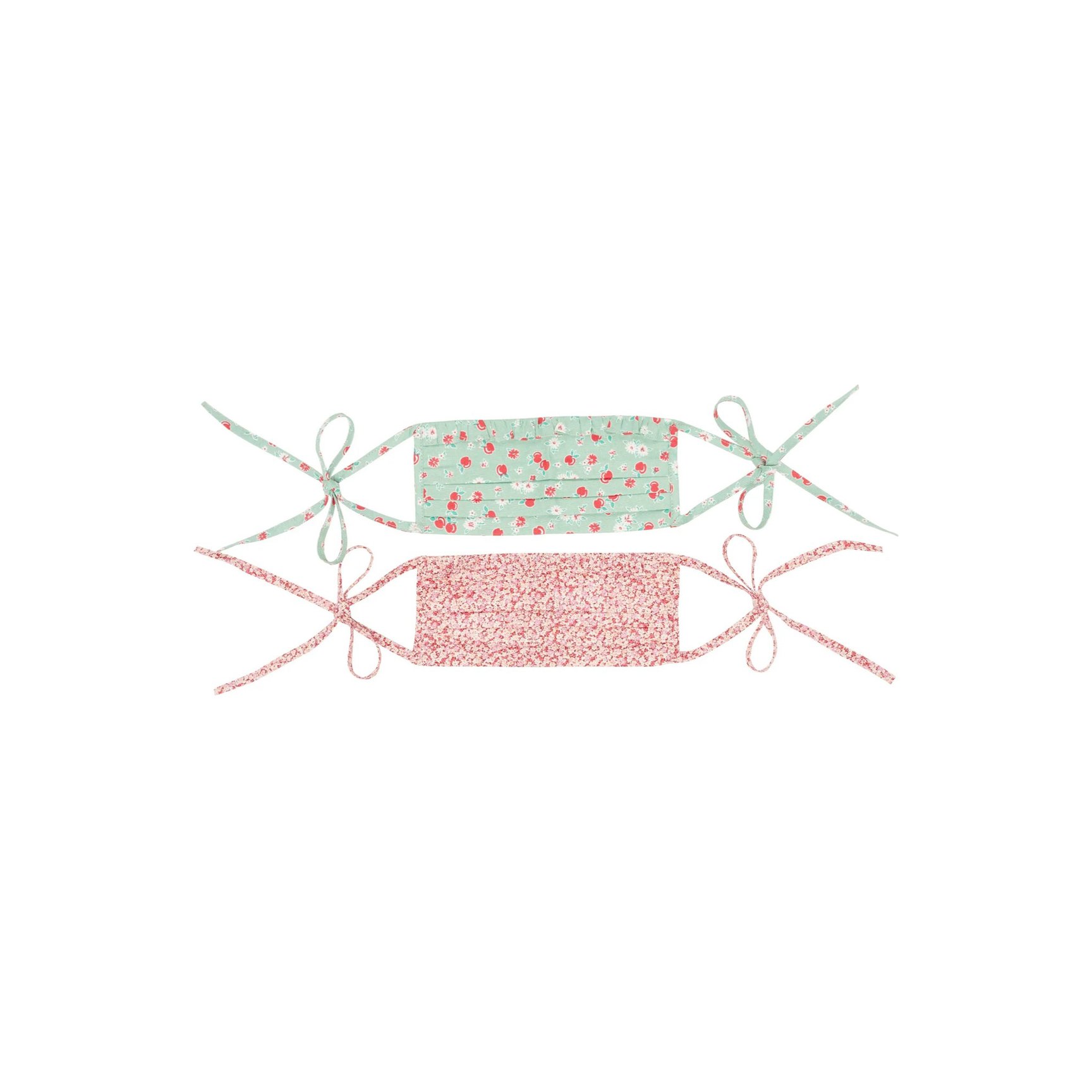 ドリーミーなプレーリードレスが人気の「バットシェバ(Batsheva)」。デッドストックのコットンローンを使用し、ドレスでもおなじみのフローラルプリントをマスクに落とし込みました。プリーツとラッフルや、細身のタイストラップで繊細な印象に仕上げられています。ピンク&ミントグリーンの2枚セット。