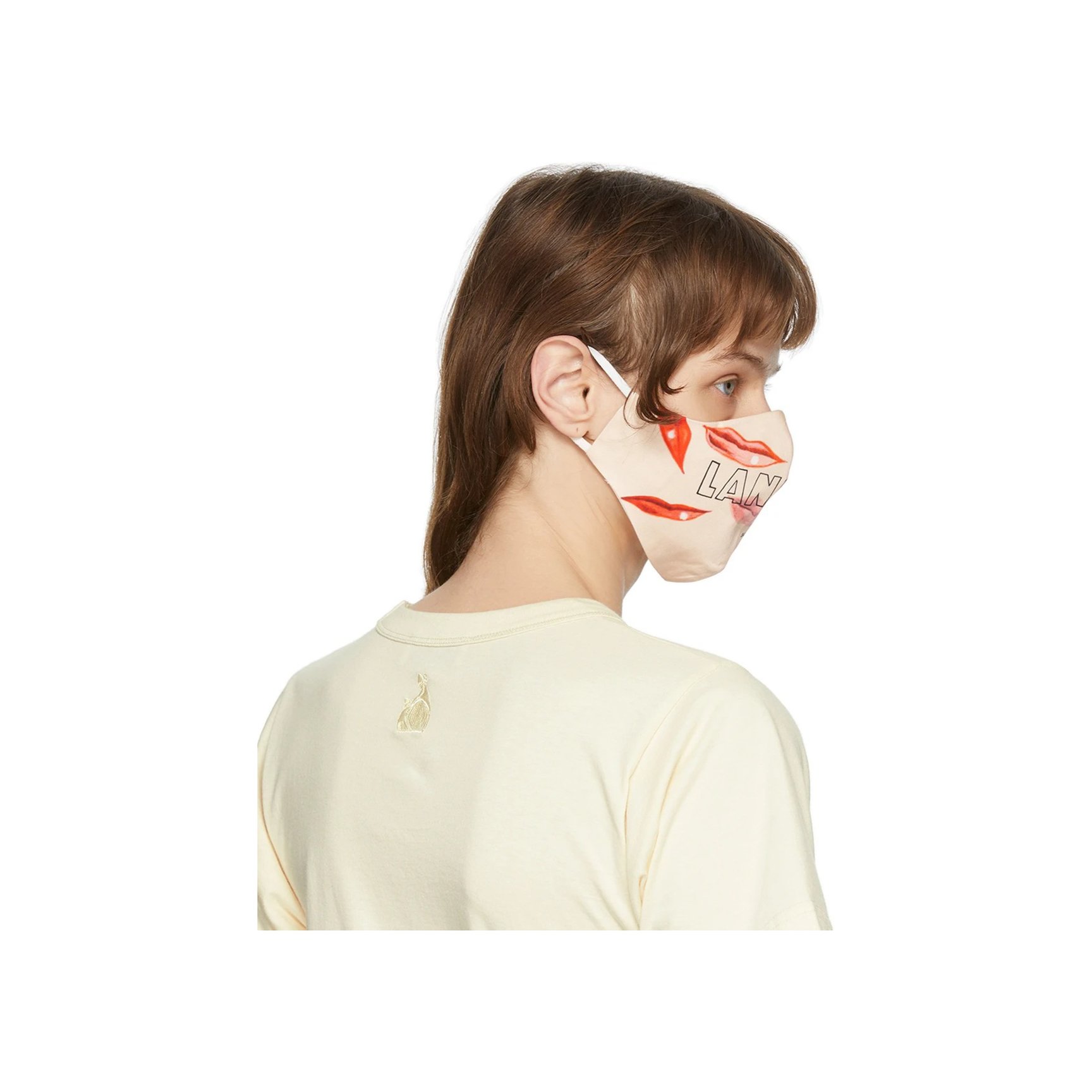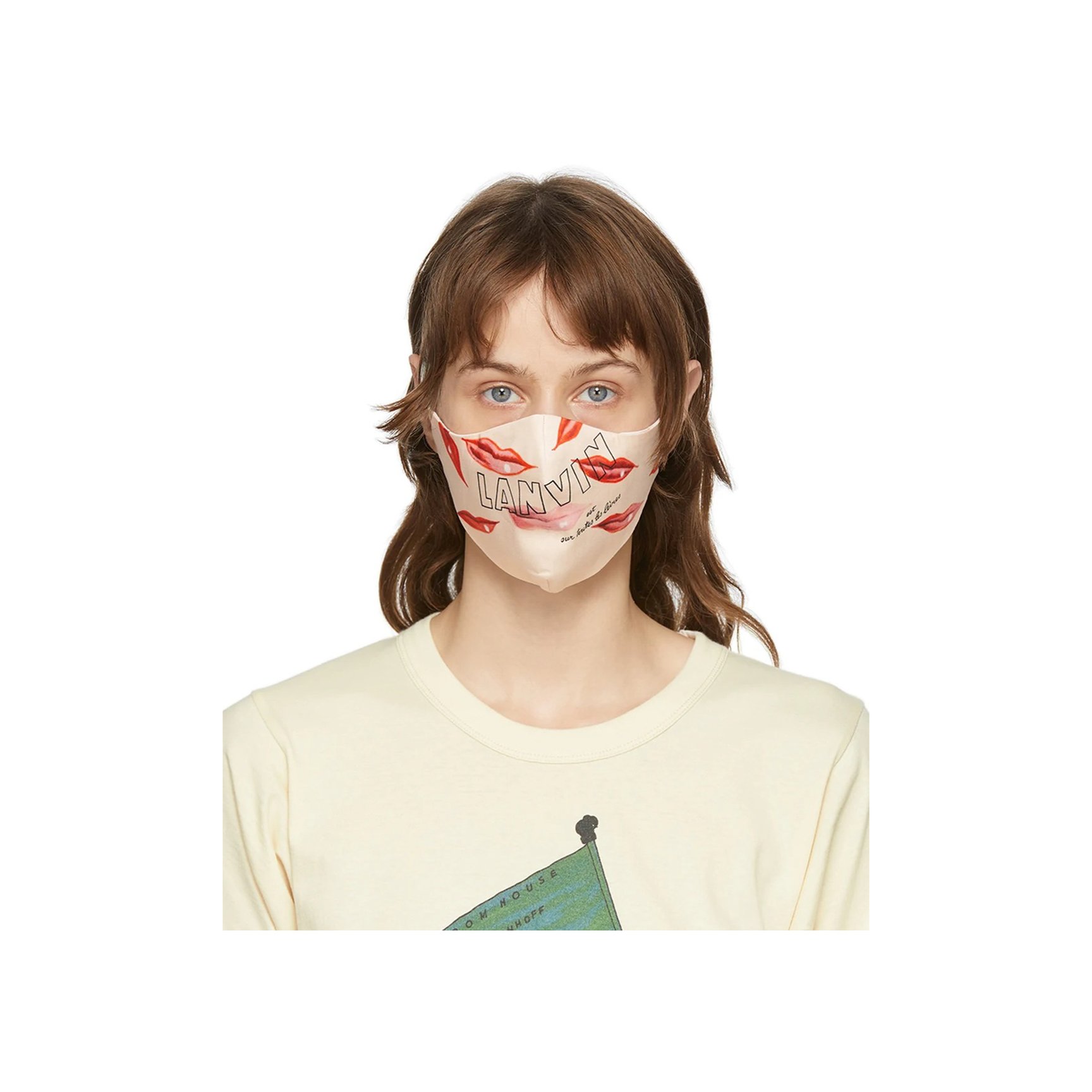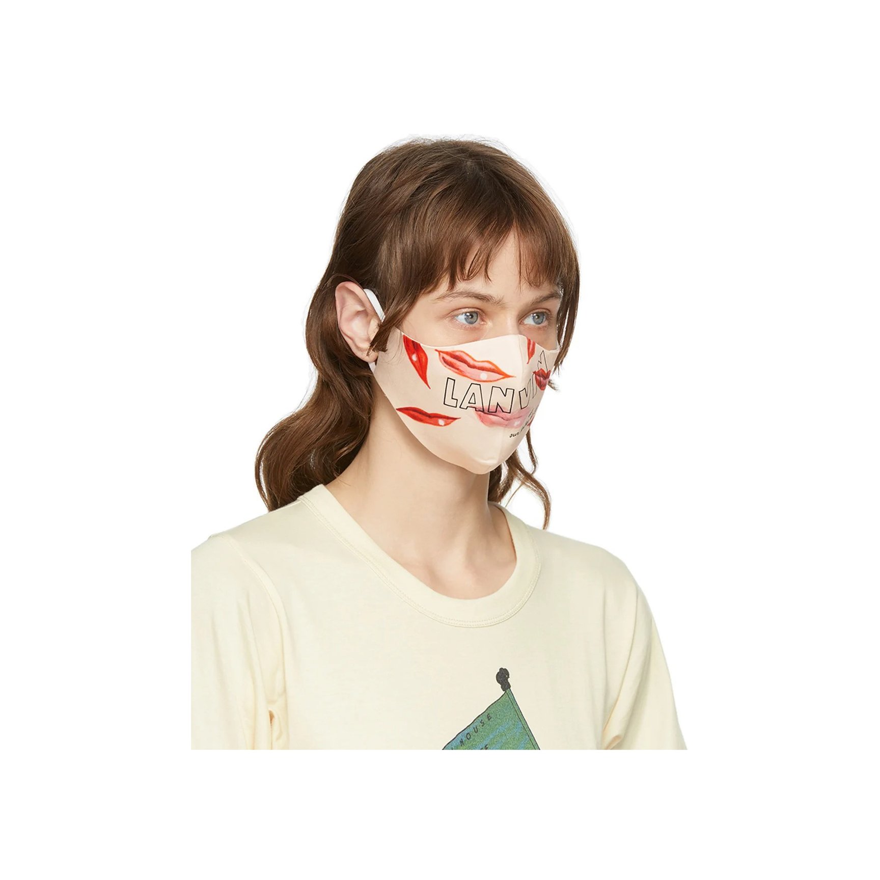 リップをいくつもプリントしたマスクは「ランバン(LANVIN)」のもの。リップはマスクで隠れてしまうものだからこそ、マスクでアピールする発想がユニークですよね。コケティッシュなモチーフと手書き風のファニーなロゴのバランスが絶妙。こちらも2枚セットです。