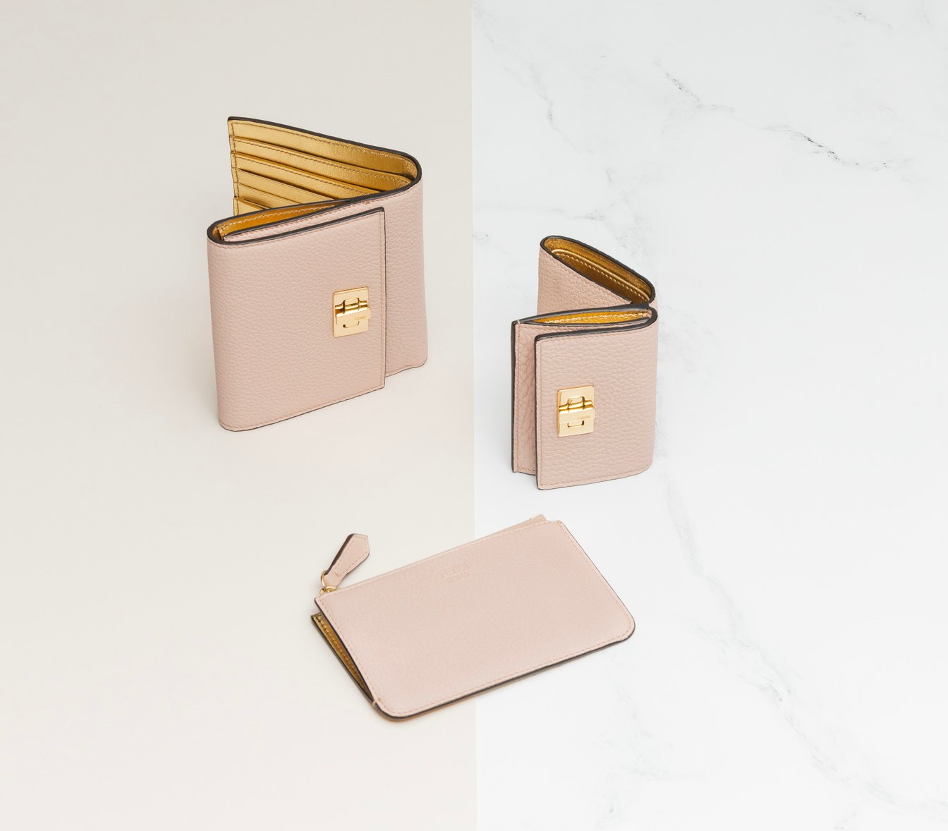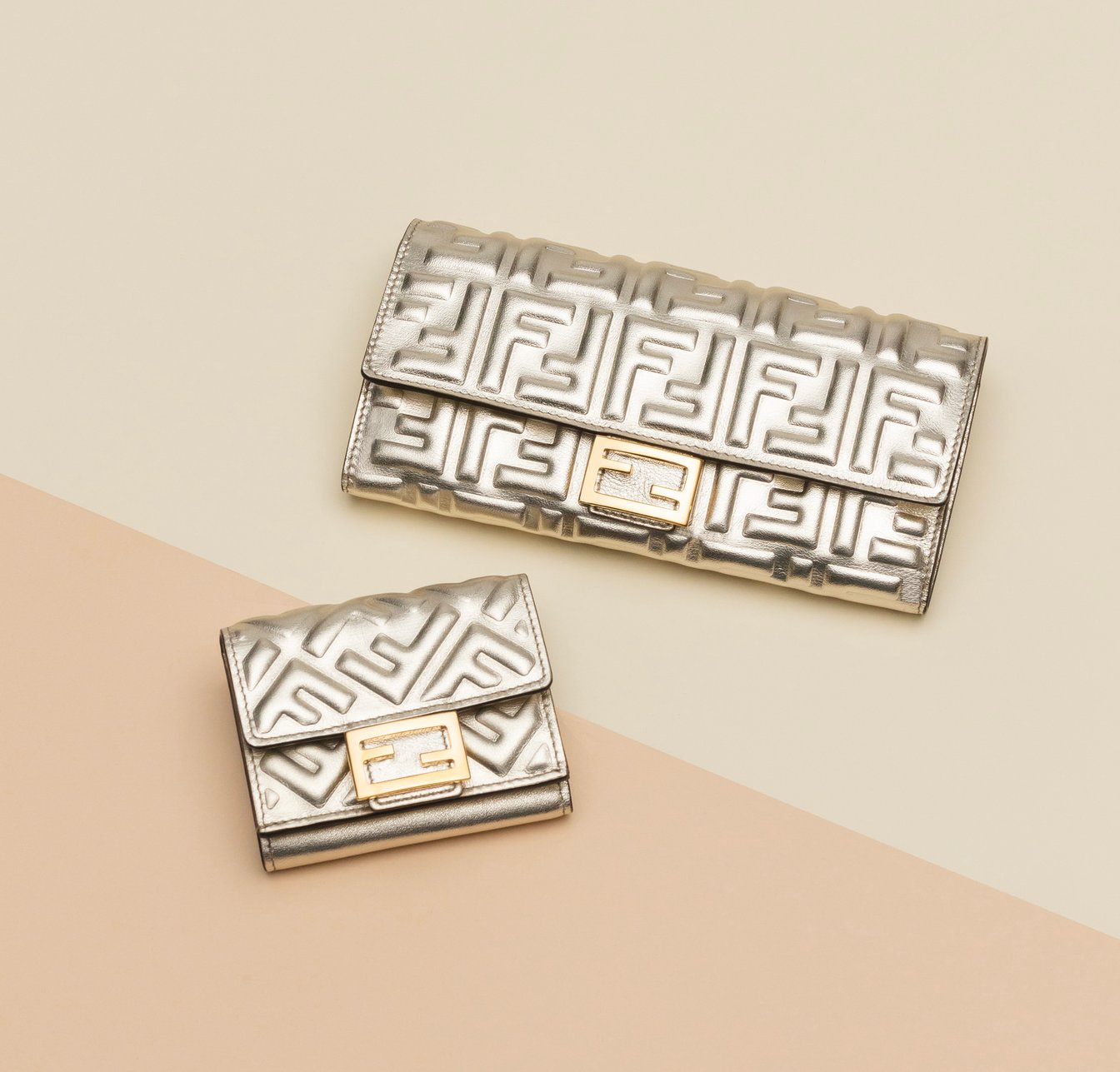 メタリックなシャンパンゴールドのレザーにゴールド仕上げのパーツが上品で華やかなウォレットは、エンボスのFFモチーフが存在感のある「バゲット」シリーズから。長財布はマチ付きポケットx2、ジップポケットx1、カードスロットx10、複数のフラットサイドポケットと収納力抜群。三つ折り財布は、紙幣用の大きなコンパートメントと3つの隠しカードケースが付いていてコンパクトなデザイン。あなたはどっち派?