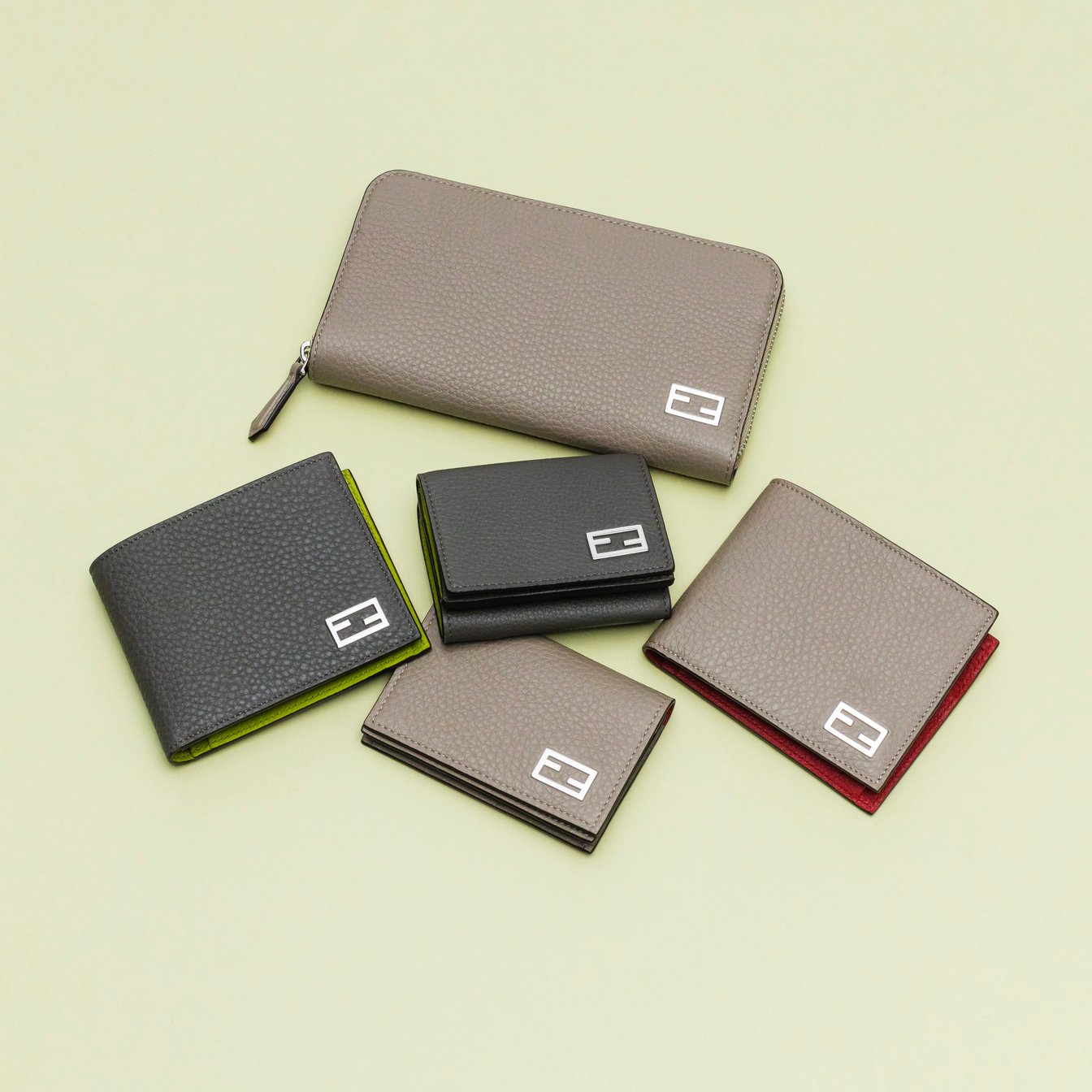 FFバゲットのメタルアクセサリーがワンポイントの一見シンプルなメンズウォレットですが、こちらもライニングに注目。ライトグレー×アシッドグリーン、ベージュ×レッドのカラーリングは落ち着いた中にもヴィヴィッドなアクセントが効きた配色に。長財布や二つ折り、三つ折り、カードケースとライフスタイルや用途によって選べます。