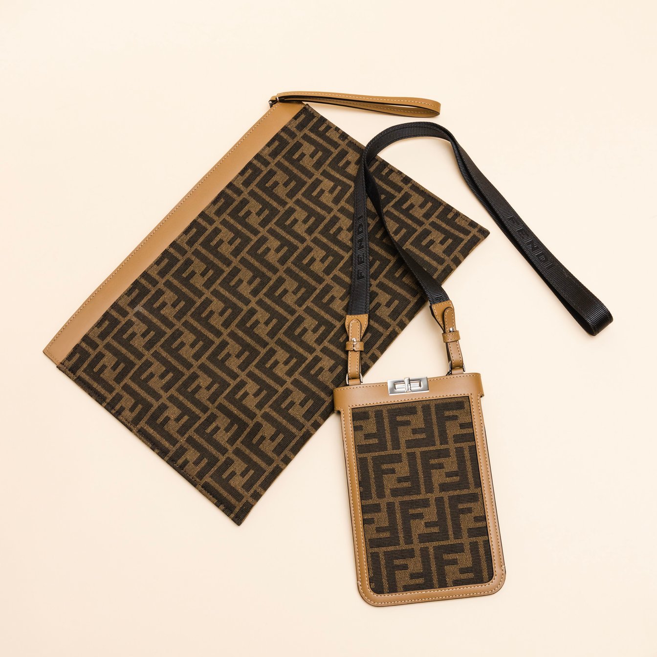 フェンディのシグネチャーであるFFのジャカード生地を使用したフラットクラッチとスマートフォンバッグ。スムースレザーのトリミングディテールが高級感を高めます。持ち運びに便利なナイロンストラップ付きのスマートフォンバッグにはアイコニックなツイストロックがワンポイントに。