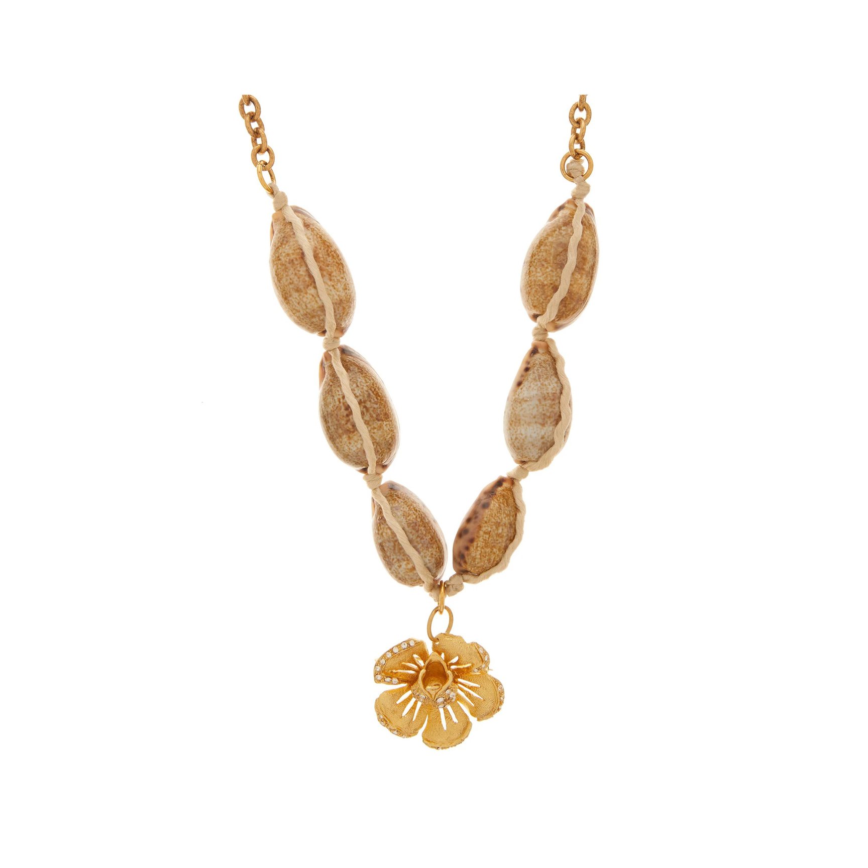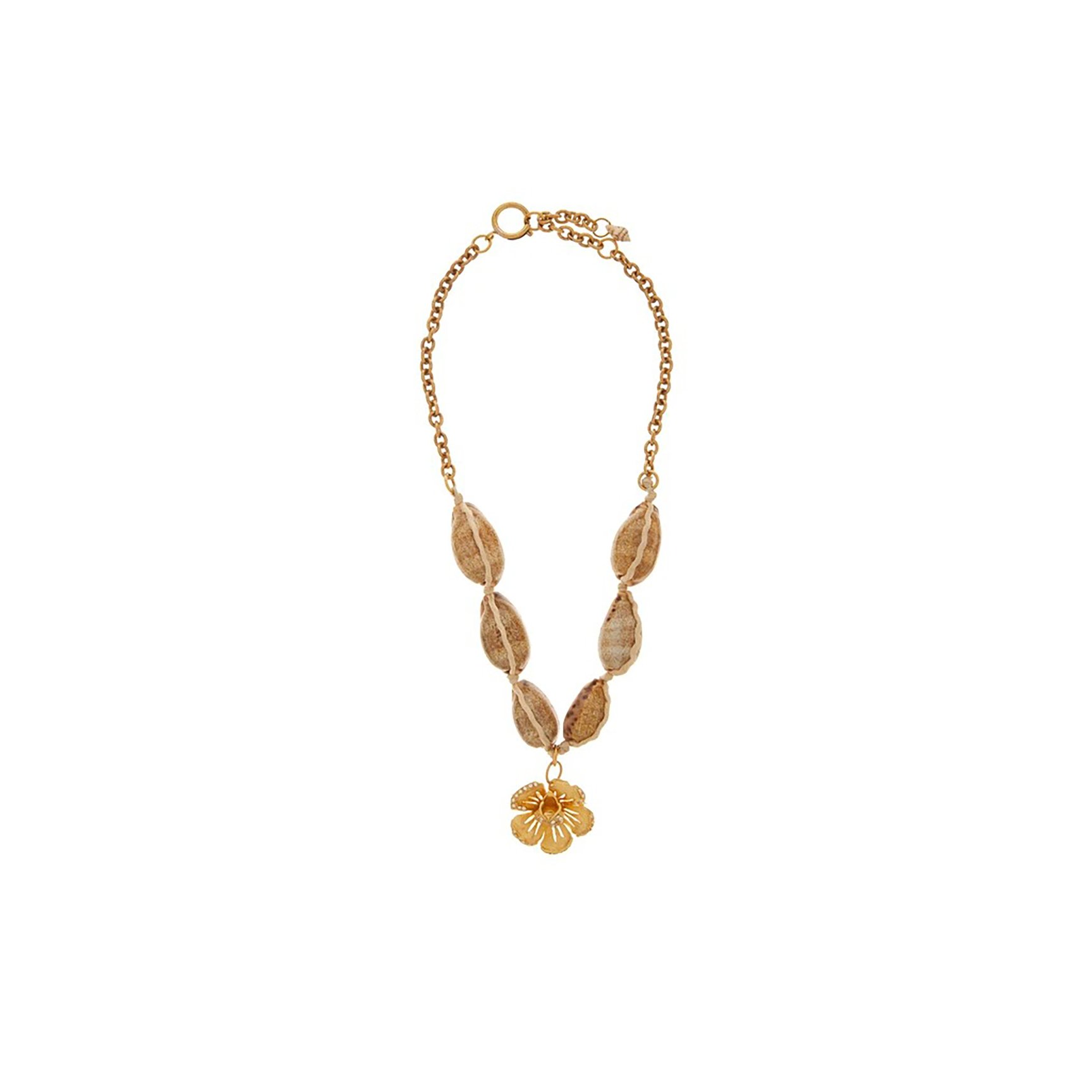 クリスタルが輝くフラワーモチーフと、シェルの組み合わせがユニークな「マリーン?セル(MARINE SERRE)」のネックレス。ナチュラル系モチーフをゴールドトーンの色調でまとめたことで、エレガントさも感じられます。白シャツコーデのアクセントとして投入するのもおすすめ。