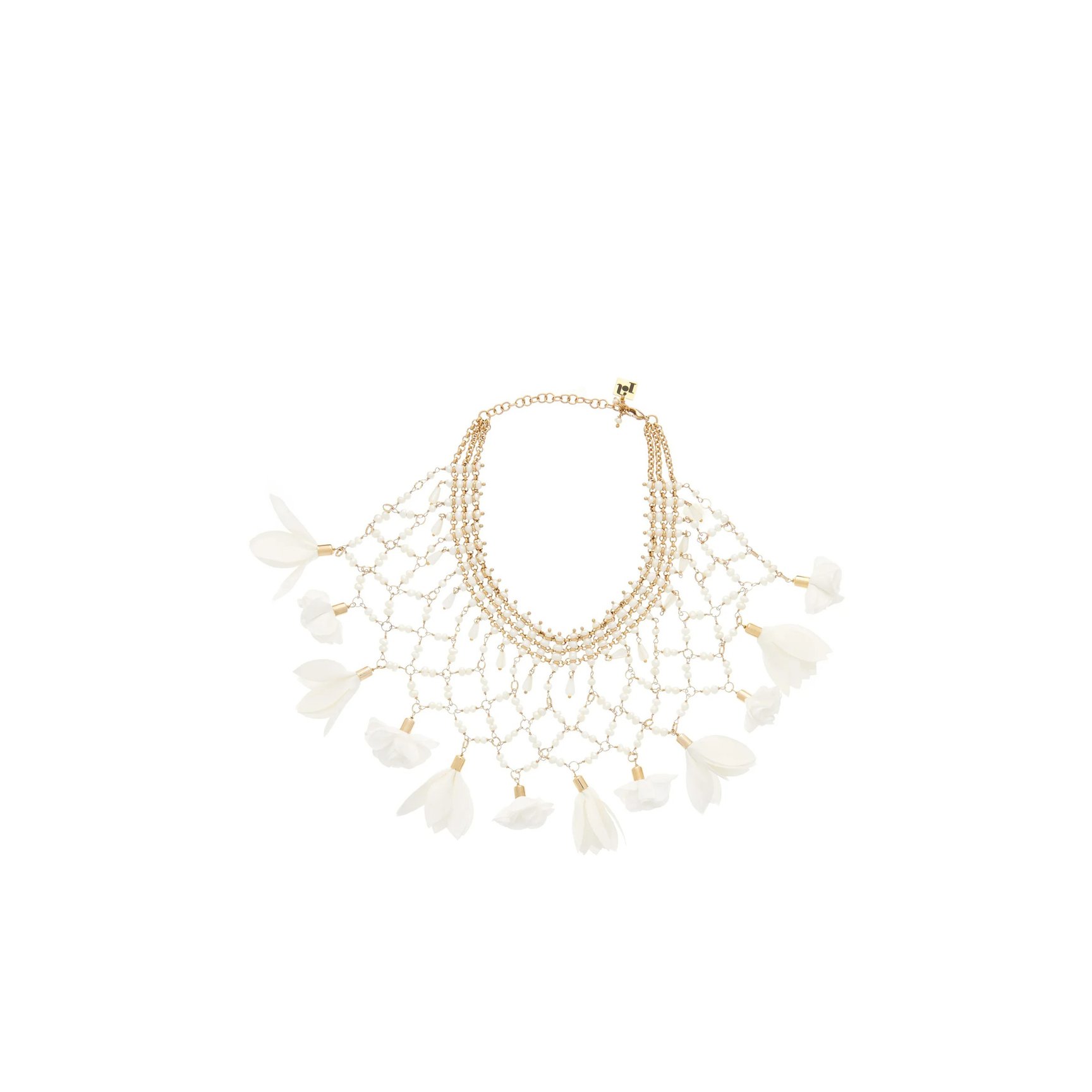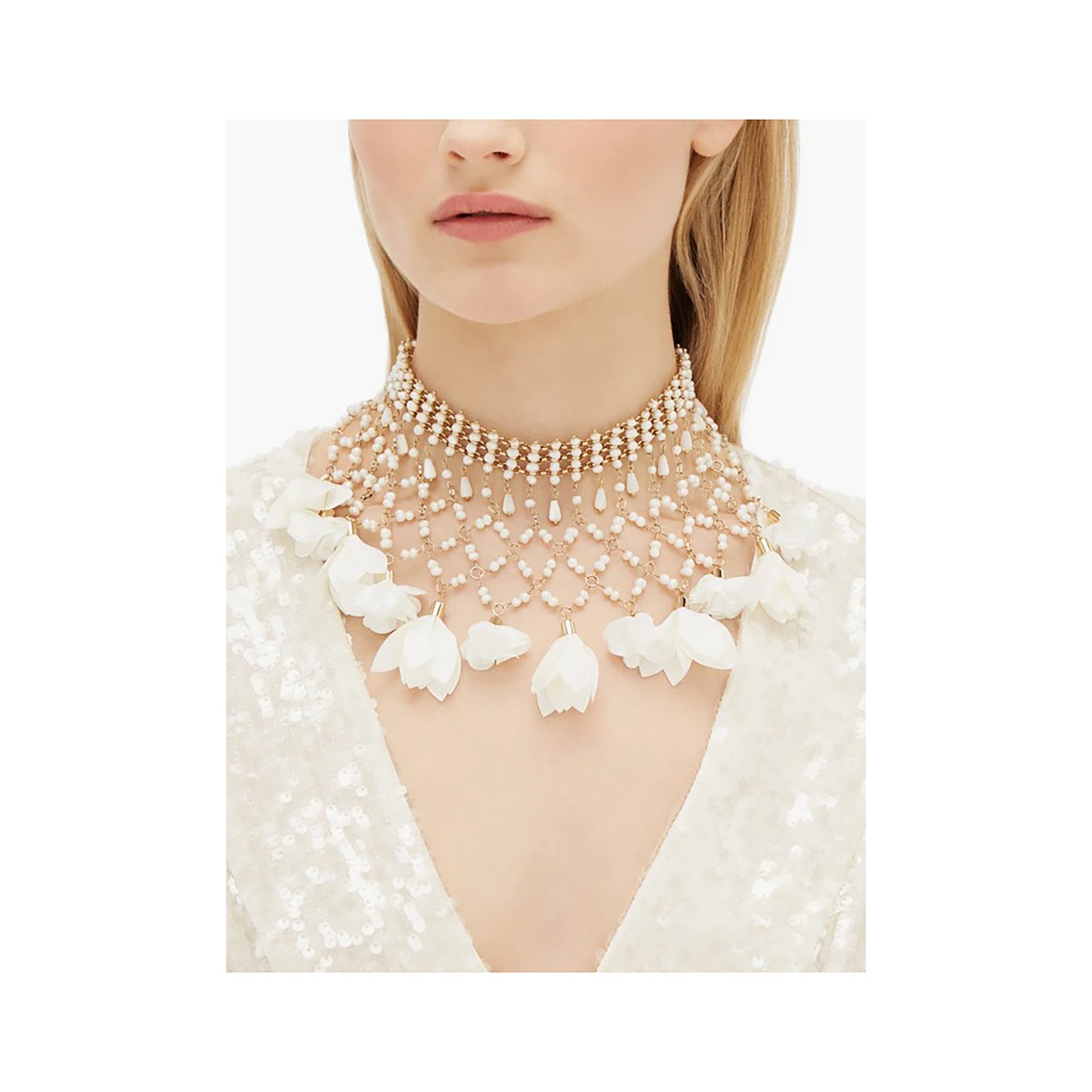 花々が咲き誇る「ロザンティカ(Rosantica)」のネックレスは、まさに主役級の華やかさ。繊細なチェーンとパールが首元からデコルテをより美しく引き立ててくれます。ゴージャスなのに清楚さもあわせ持つのは、ピュアなホワイトならでは。