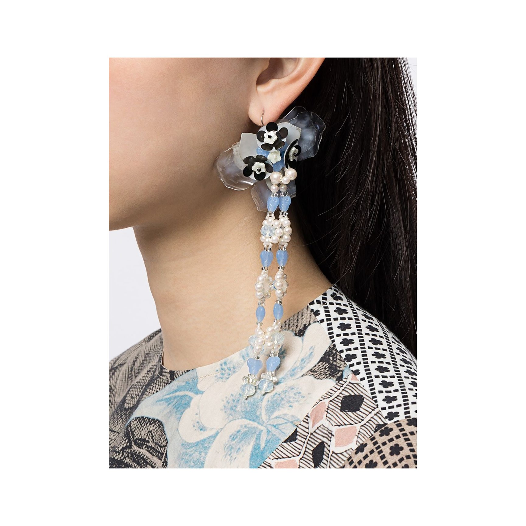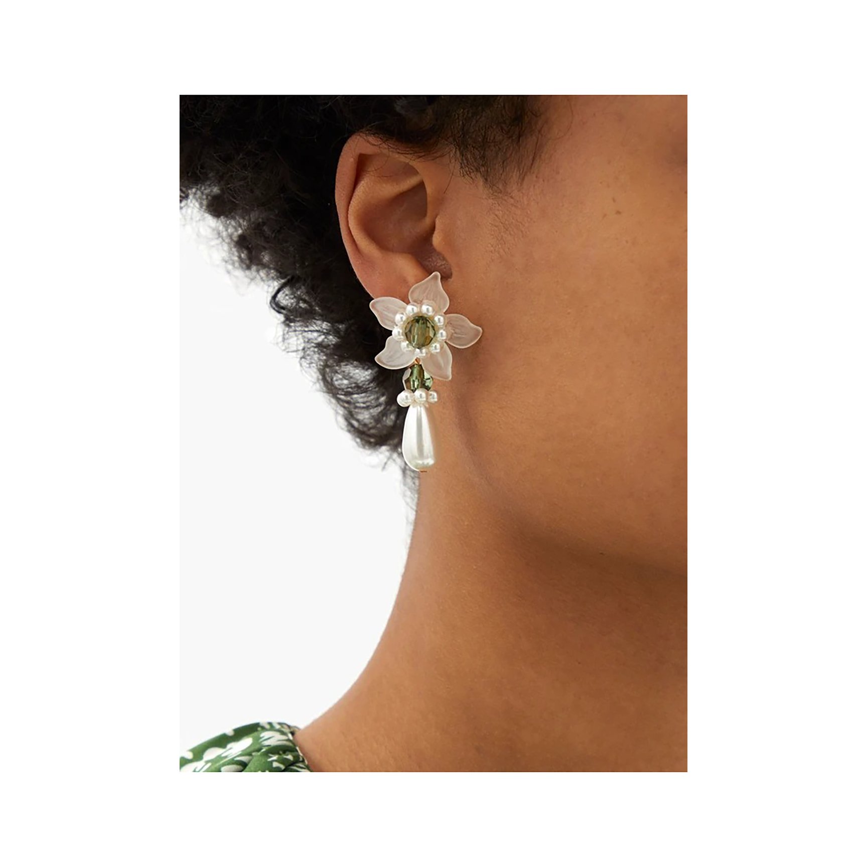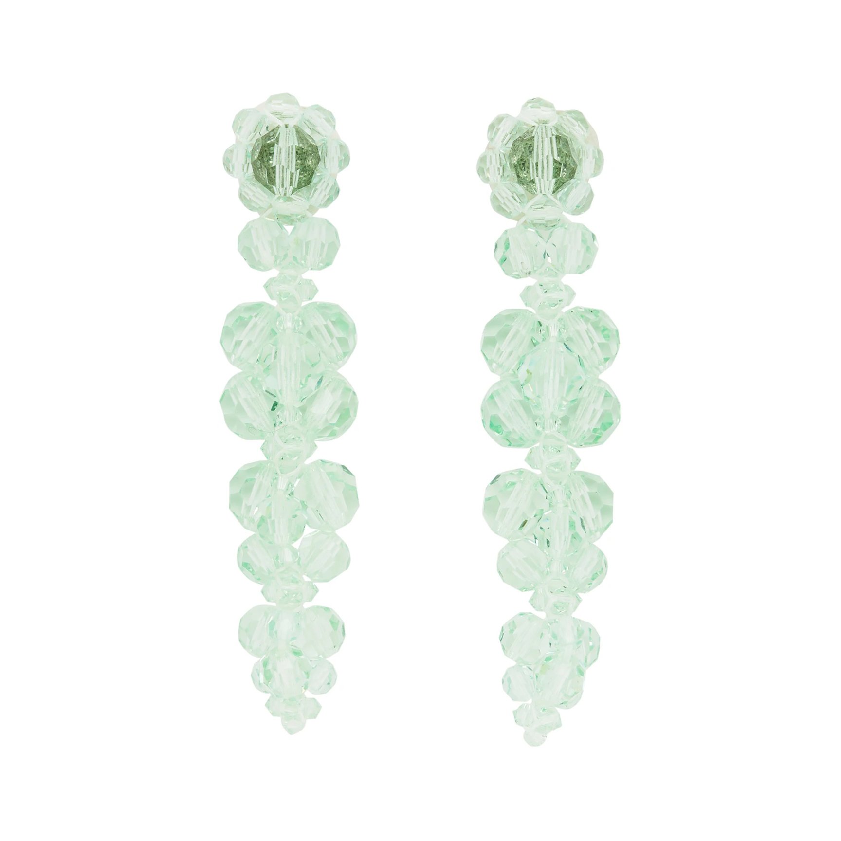 「シモーン?ロシャ(Simone Rocha)」のシグネチャーアイテムでもあるクリスタルビーズのアクセサリー。花をモチーフにしたドロップピアスは、ボリューミーながらビーズの透明感で軽やかなルックが完成します。爽やかなミントグリーンカラーも春らしさ満点。