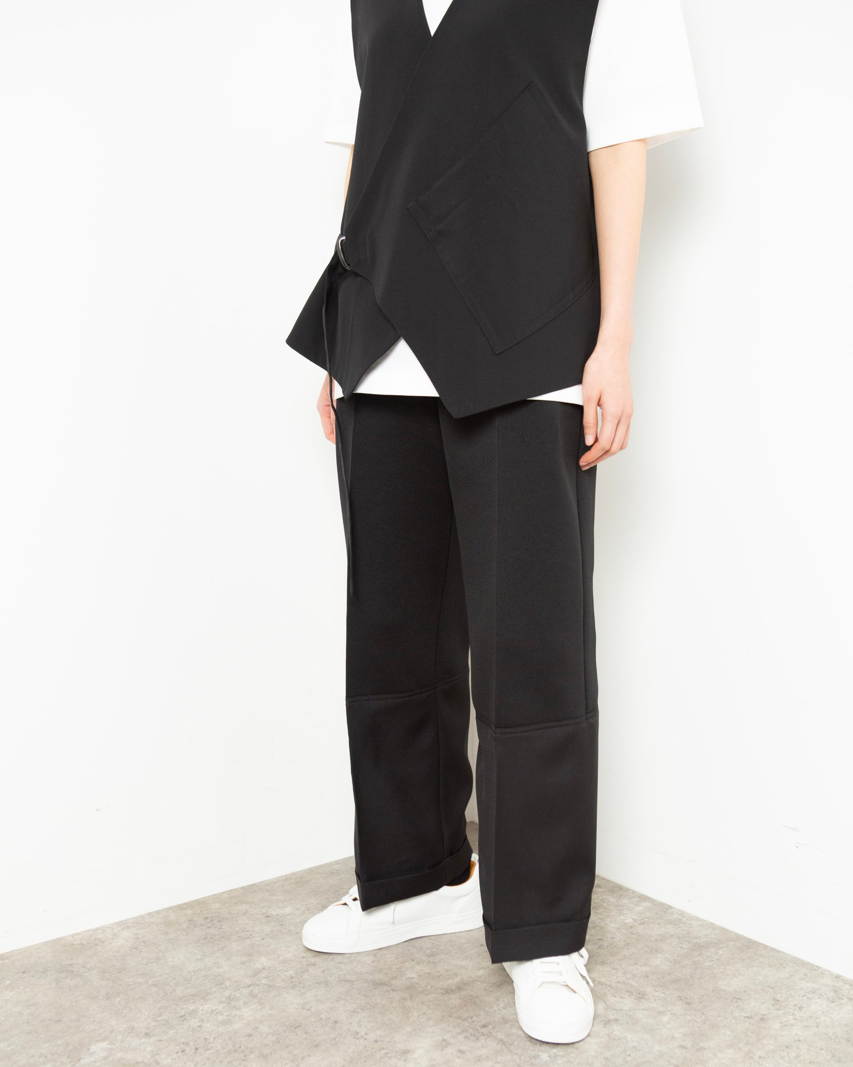 ニットパンツは履き心地や機能性の良さからついつい手にとってしまうアイテムですが、部屋着のようにも見えがち。「マラミュート(malamute)」のニットトラウザーは、ブランドらしい地厚のニット生地をベースに、センタープレスが入ったり独特な切り返しがエレガントな魅力を放つアイテム。ニット生地をベースに膝下から素材をリサイクルポリエステルのギャバジン素材で切り替えたことで、メリハリのあるデザインになっています。白Tにベストを合わせたマニッシュなスタイルがおすすめです。