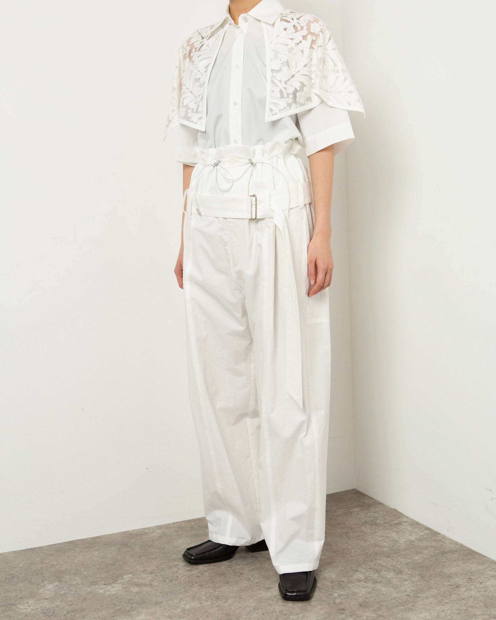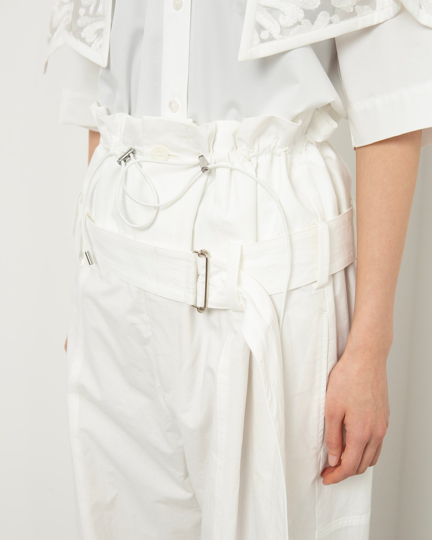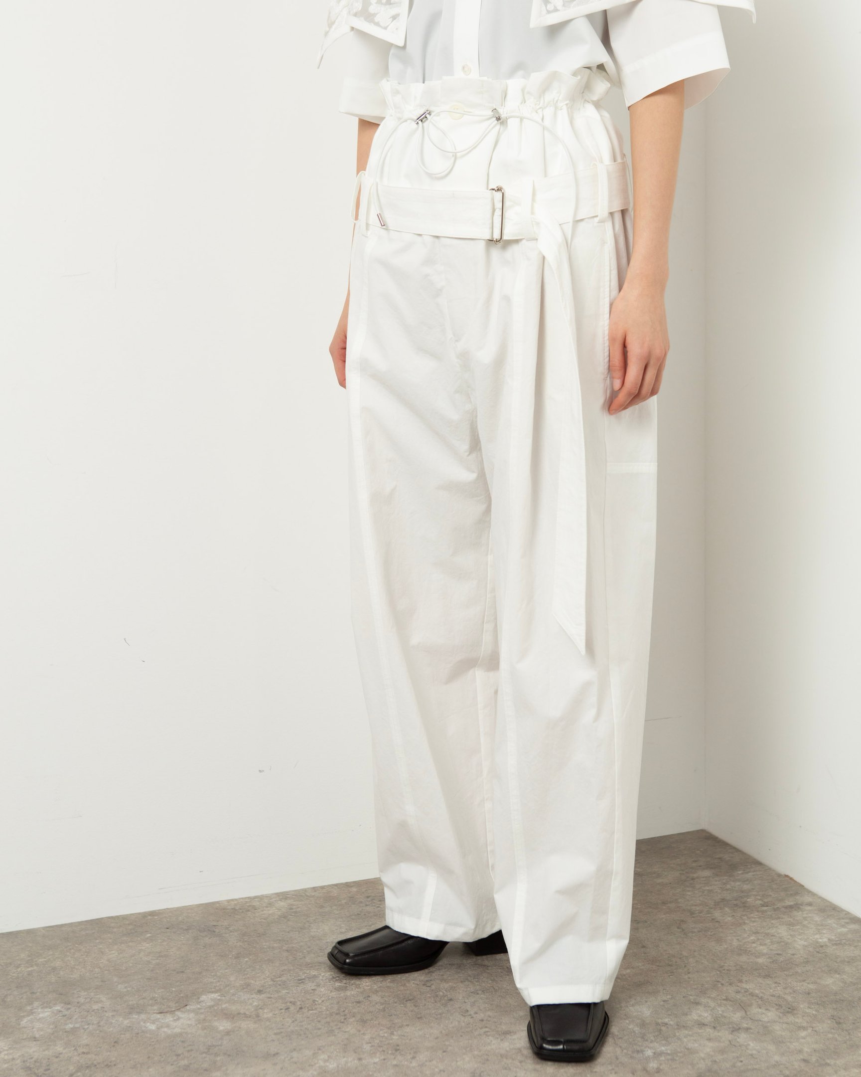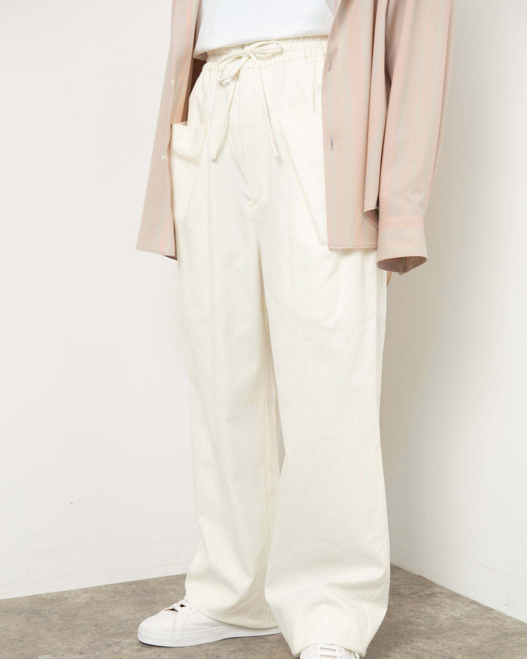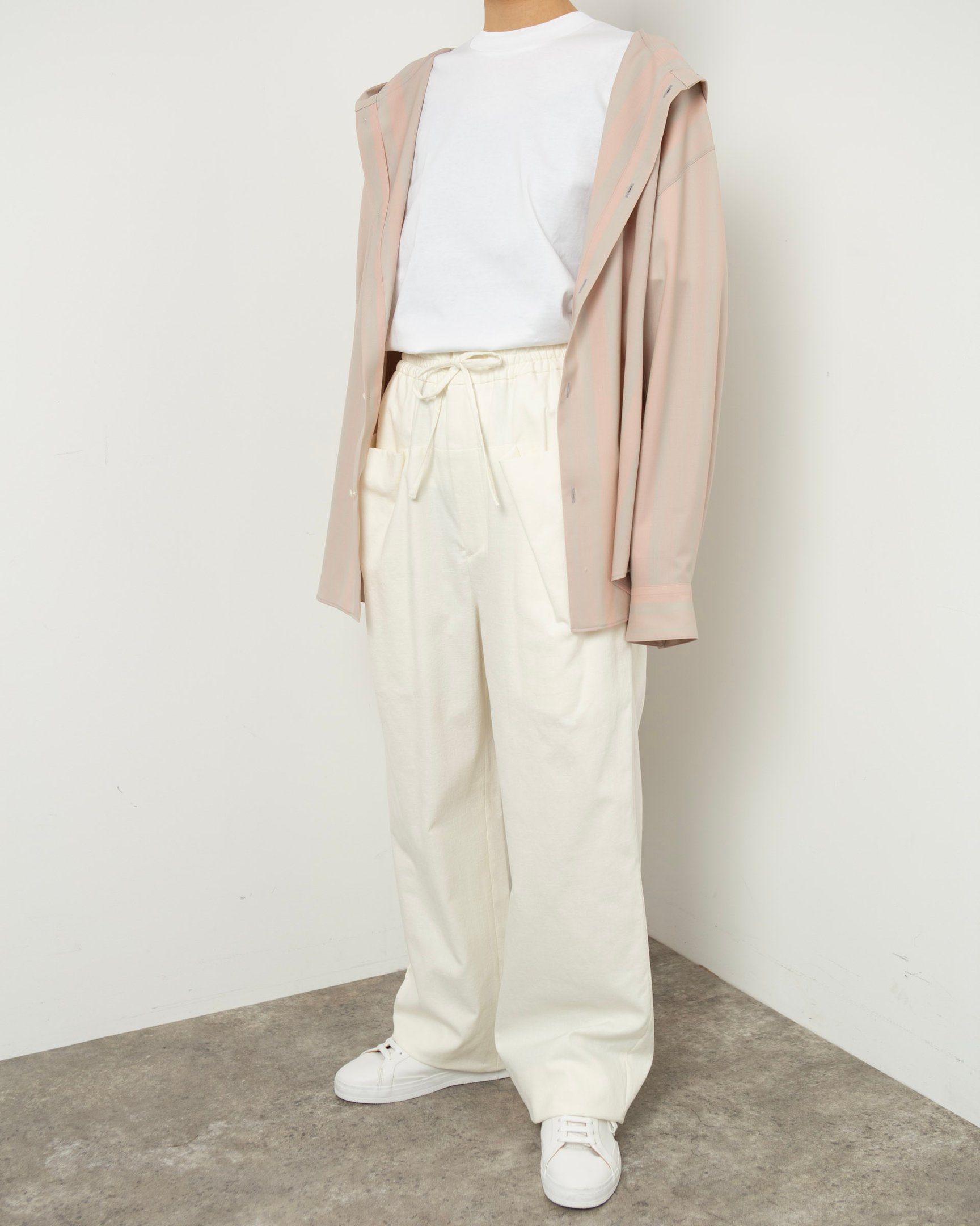 ドローコードや存在感のある太めのベルトが魅力的なハイウエストパンツは「ウジョー (UJOH)」から。洗いざらしのような加工が施され、膨らみのあるタッチとシボ感が特徴の生地が、のっぺりしがちなホワイトのパンツに奥行きを生み出してくれます。アクティブな印象かつ綺麗なシルエットなので、色々なスタイリングに重宝しそう。ベルトよりも上を折り返して穿くことも可能なので、トップスをタックインしたスタイリングも◎。あえてキレイめなブラウスと合わせて、上品カジュアルな着こなしを楽しんでみては。