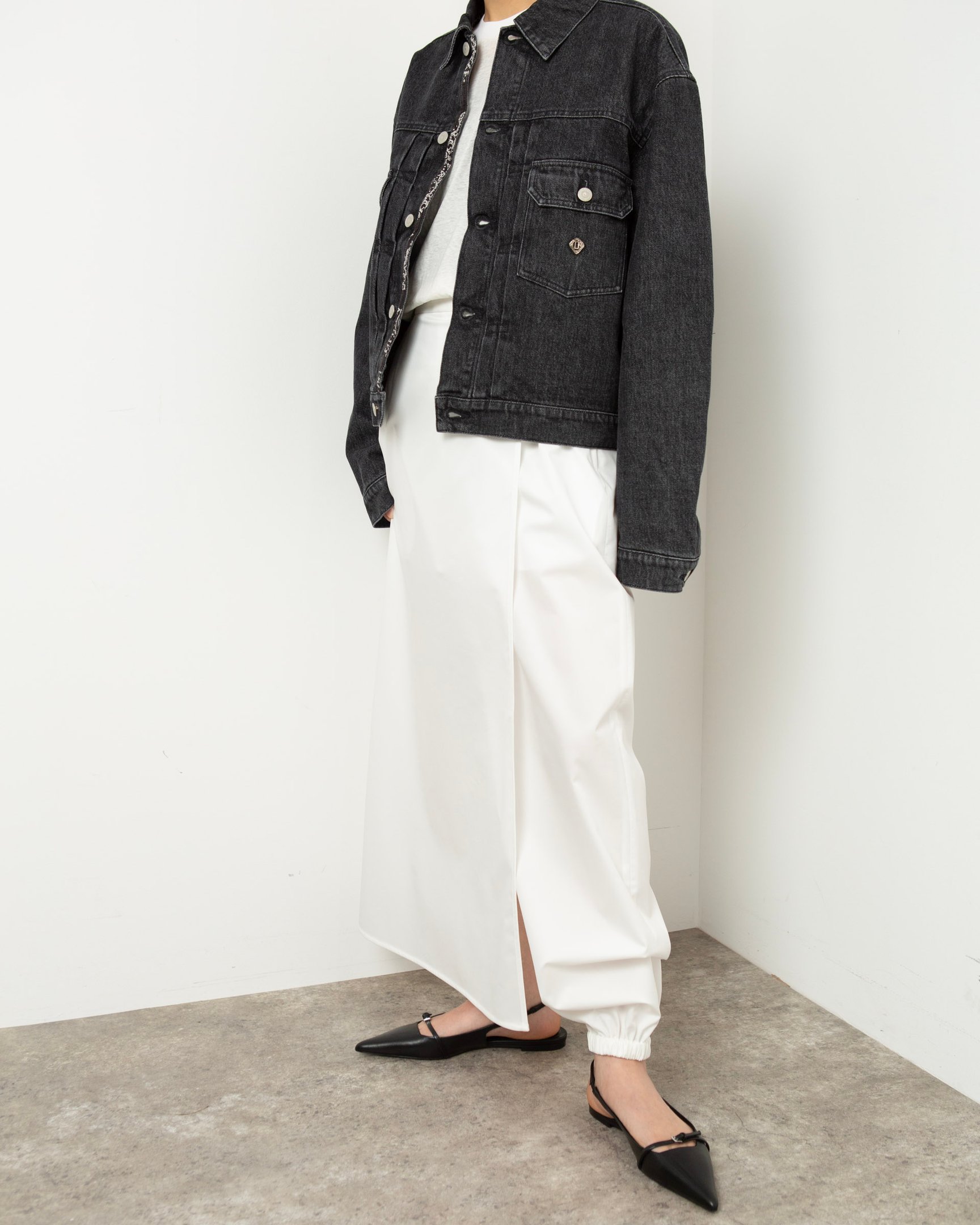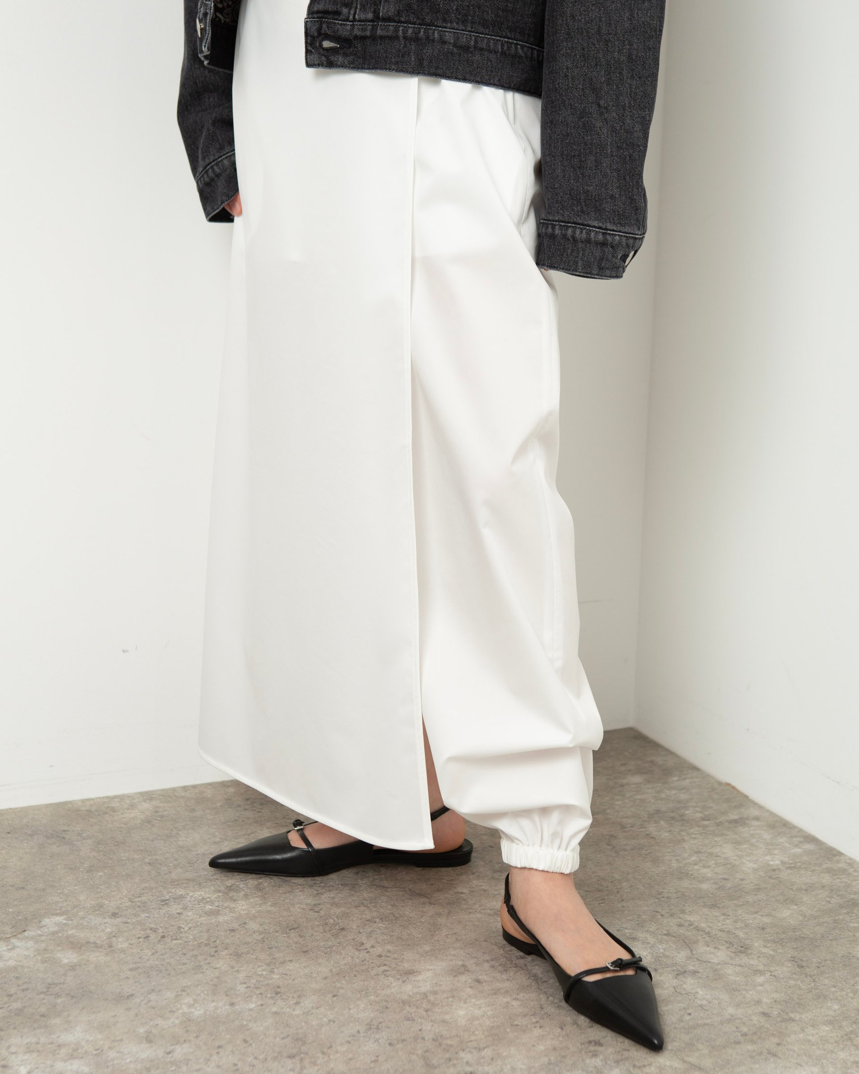 「チノ(CINOH)」からは、ラップスカートとパンツをドッキングしたような個性派ボトムスを紹介。大胆なデザインですが、軽やかな素材感とホワイトのカラーで綺麗めな雰囲気を演出してくれます。素材はコットンとポリエステルの混合になっており、春夏らしいさらっとした着心地の上にシワになりにくいのも嬉しいポイント。シンプルなジャケットやTシャツを合わせてるだけで、スタイルをコンテンポラリーにアップデートしてくれる一本です。足元はキレイめなシューズでまとめるのが良さそう。