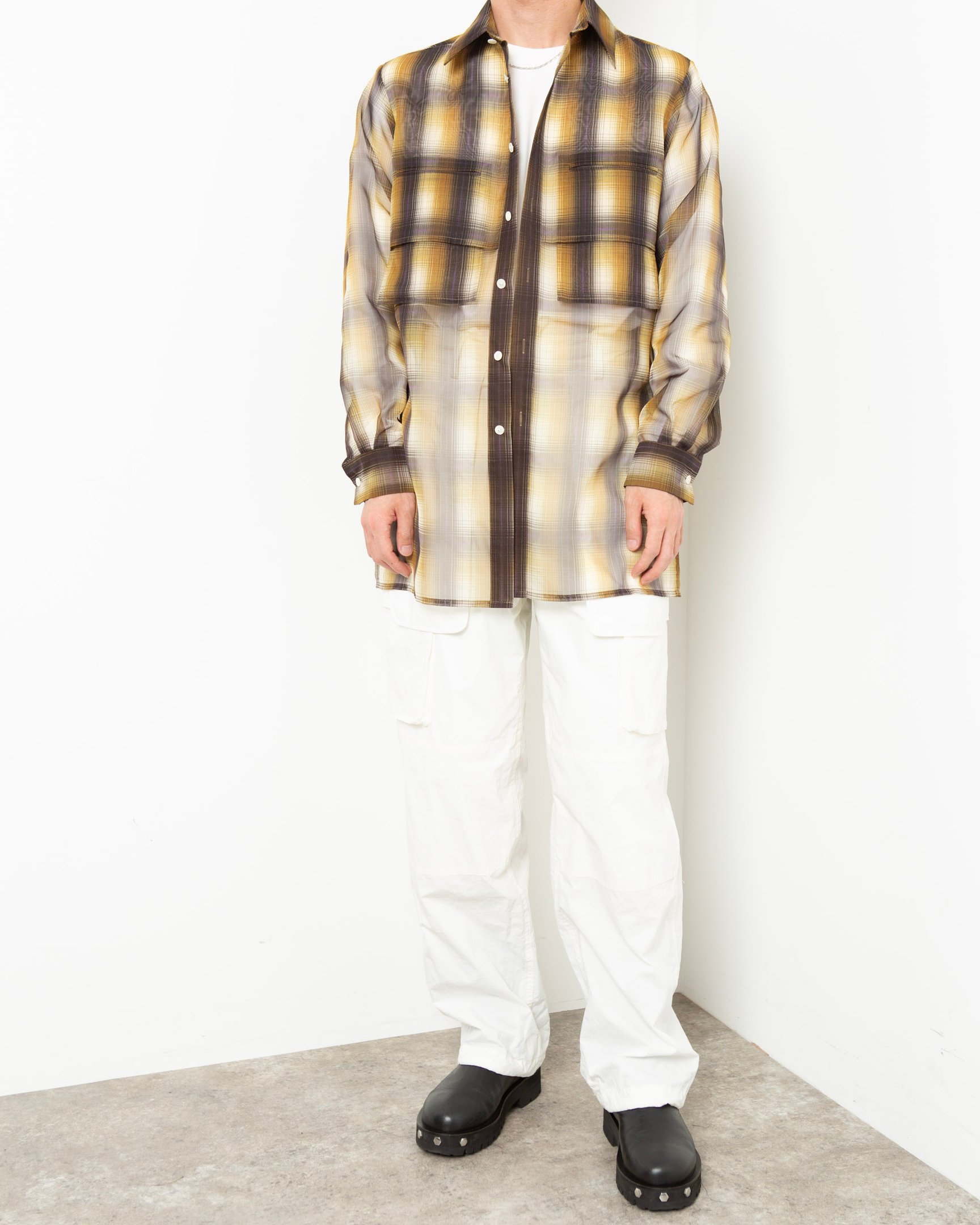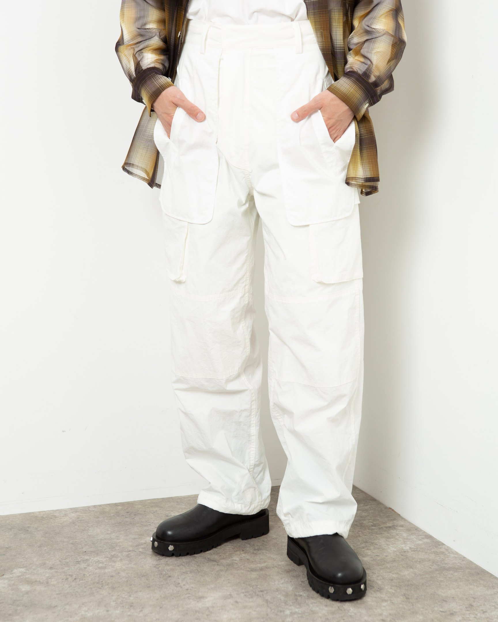 キャッチーなデザインで人気を集めている「コトハヨコザワ(kotohayokozawa)」から、大胆なホワイトとブラックの切り返しが目を惹くカーゴパンツを紹介。ボリューム感のある見た目ですが、シャツ地のような綿のリップストップ生地のおかげで軽やかな穿き心地です。アイテム自体はカジュアルな印象なので、とろみのある生地感のジャケットと合わせて大人っぽさを演出してバランスをとったスタイリングがおすすめです。