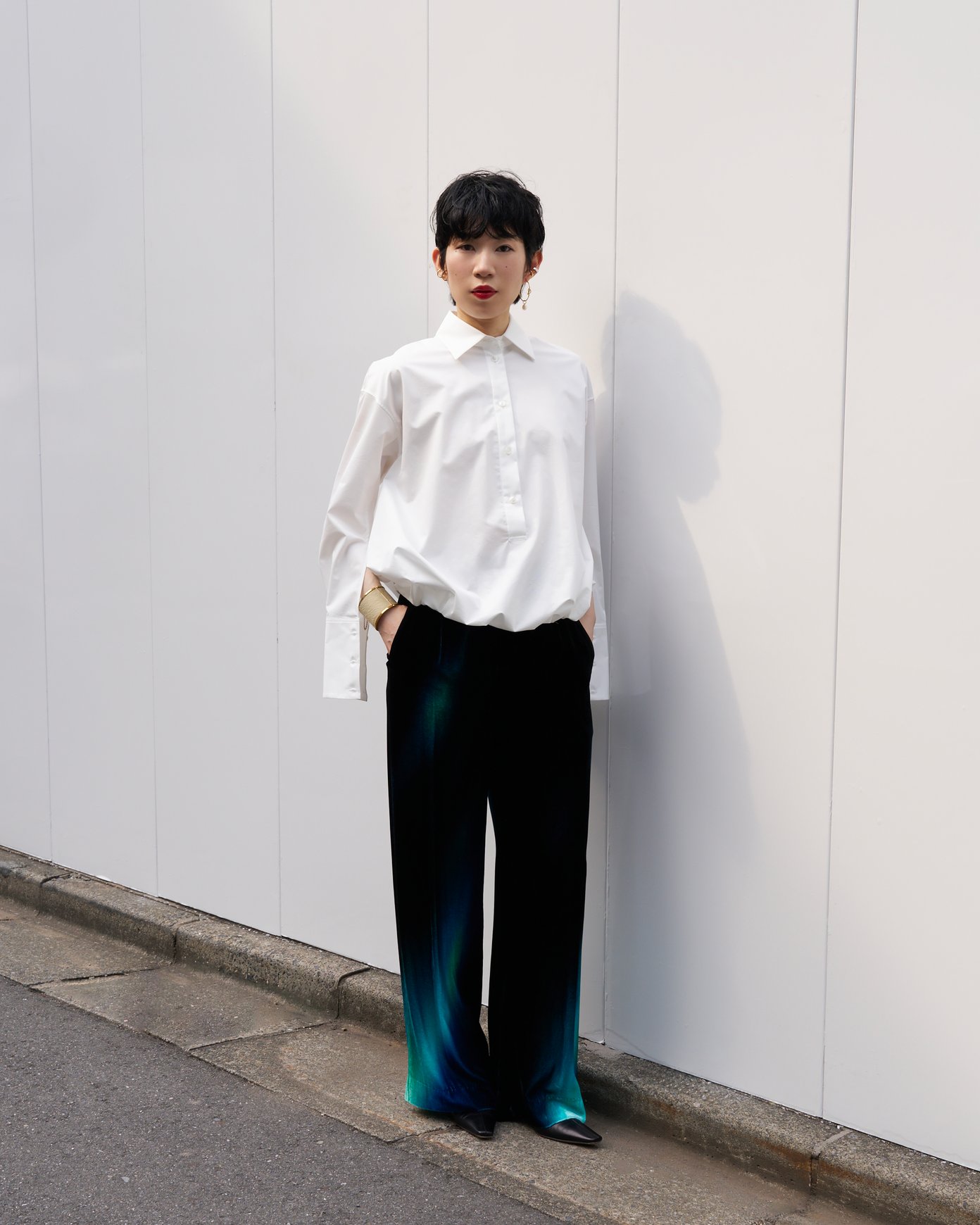 ブラウジングしているかのように窄まった裾のデザインを活かしてトップスをコンパクトにまとめ、オーロラのような抽象的な柄が目を惹くボトムスを主役にした着こなし。全体的にシックにまとめたクールな印象ですが、ボトムスのグラデーションがアーティスティックなアクセントを加え、個性を感じさせるスタイルに。一般的なドレスシャツと合わせるとドレッシーにまとまりすぎるところを、プルオーバーのデザインで程よくカジュアルダウン。袖のボタンはラフに開けることで、よりこなれた印象に仕上がります。