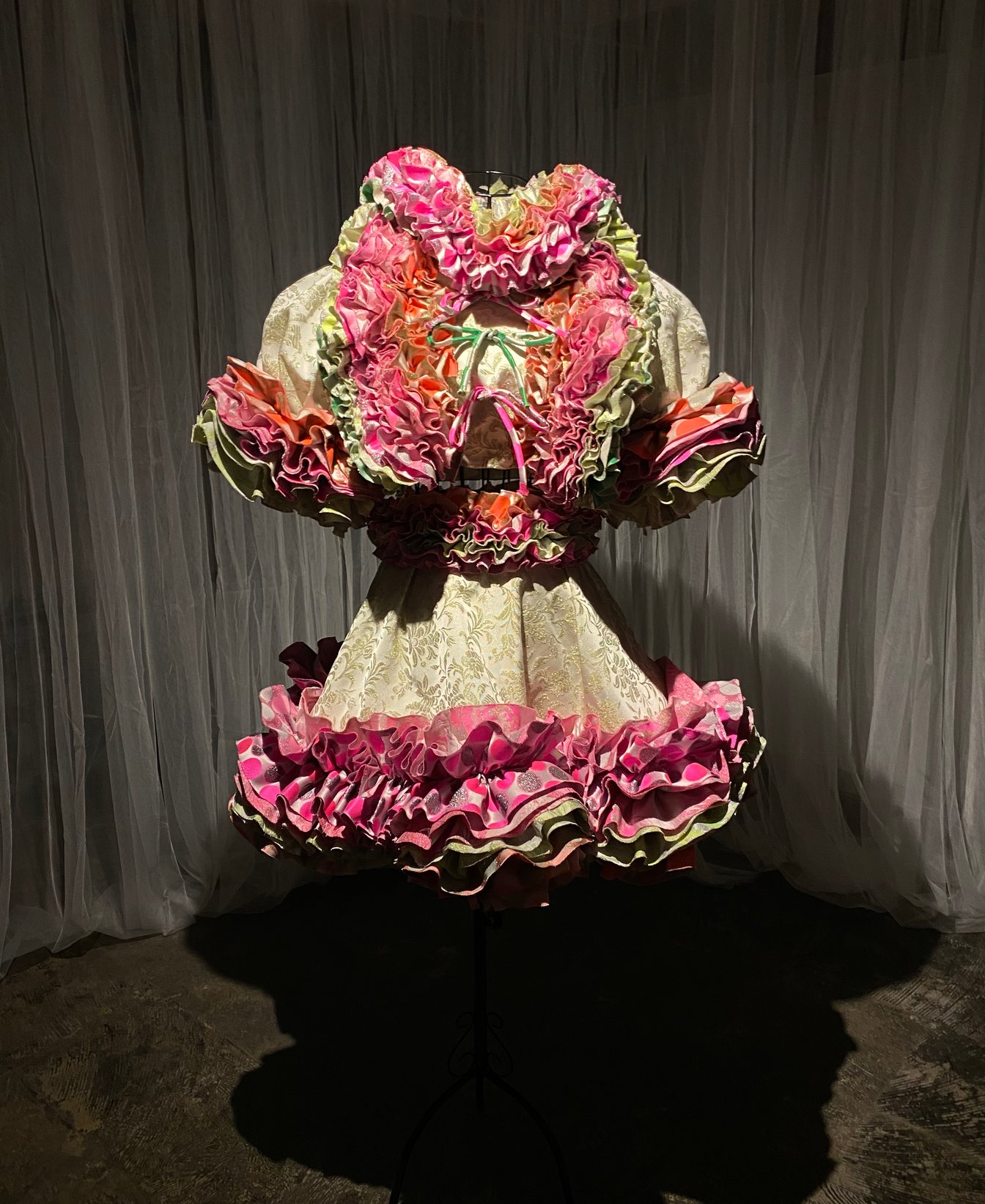 宮下織物は、小泉智貴による「トモ コイズミ(TOMO KOIZUMI)」と協業したドレスを披露。京都府内のラメ糸を使って宮下織物が織り上げたテキスタイル「エタンセル(Etincelle)」をベースに、小泉デザイナーと共同で糸の色作りや柄選びを行い、1着を仕立てた。