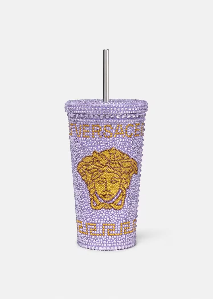 アルミニウム製のトラベルカップは、蓋とストロー付きで冷たいドリンクを持ち歩くのにぴったり。全面にクリスタルをあしらったデザインは、メゾンを代表するメドゥーサのモチーフが目を引く。カラーはバイオレットのほかに、レッド、ホワイト、ピンク、ブラック、ゴールドを揃える。キラキラのデザインでテンションも上がりそう。
