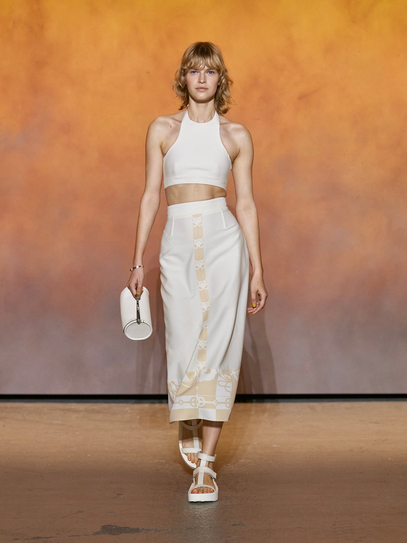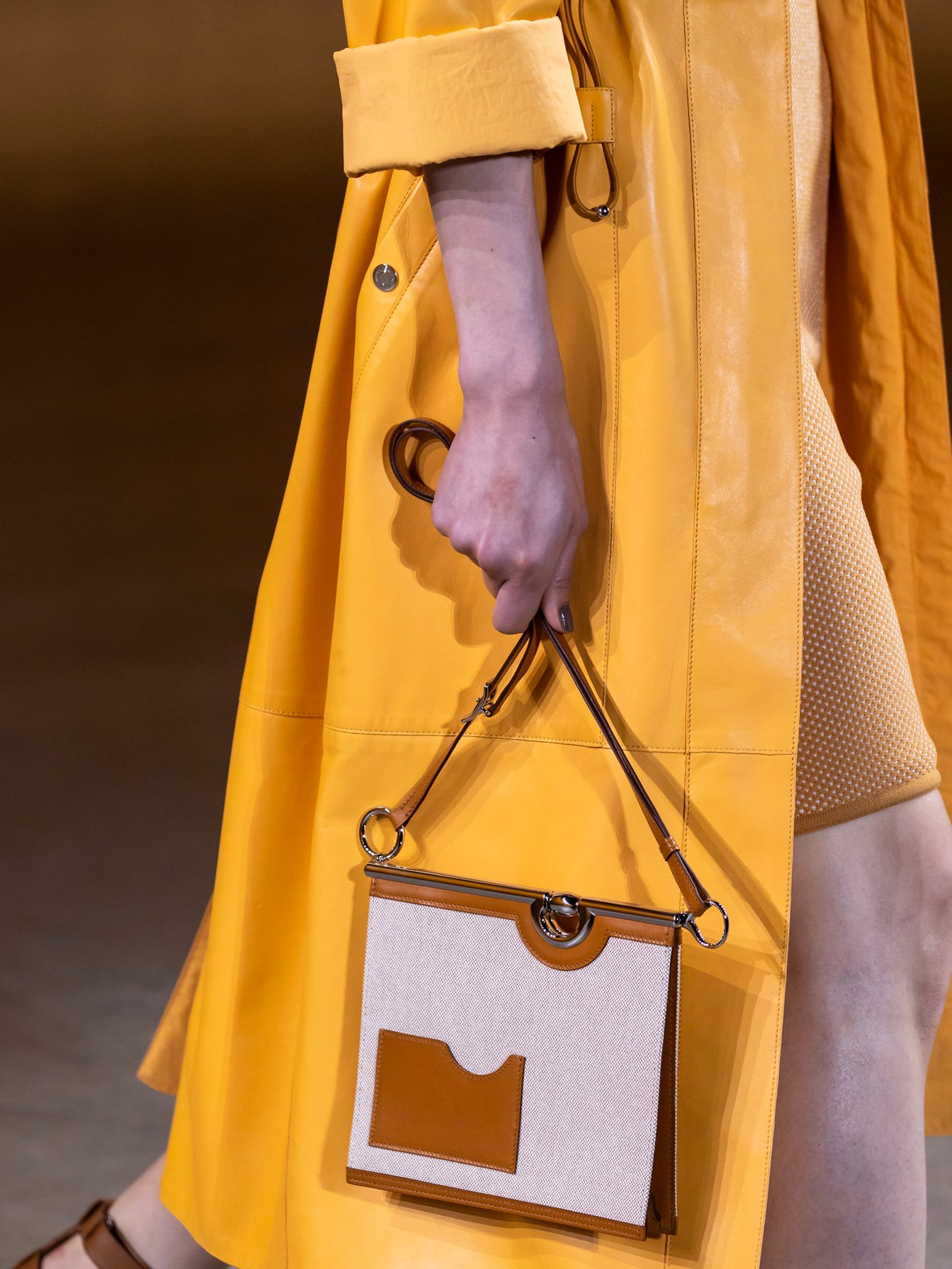 コレクションでは張りのあるシルクコットンやトワルアッシュ、ソフトなレザーなどを用いて、構築的でありながらコンフォタブルなウェアを提案。ビスチェやブラトップによるヘルシーな肌見せ、レザーのジャンプスーツといったアクティブなスタイルに、ポーチが着想源のドローストリングといったユーティリティーの要素を取り入れた。丸みを帯びたスタッズやアイレットなどバッグにも用いているディテールが、エルメスのレザー職人の技を象徴的に表している。