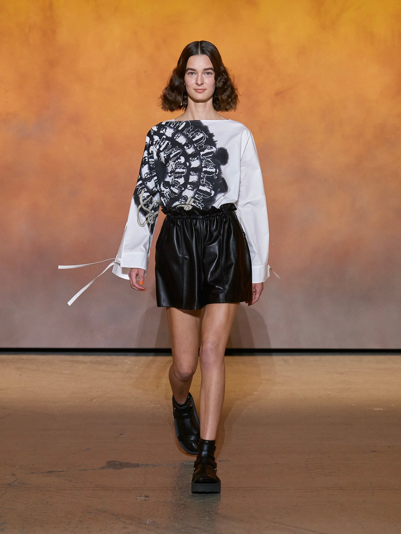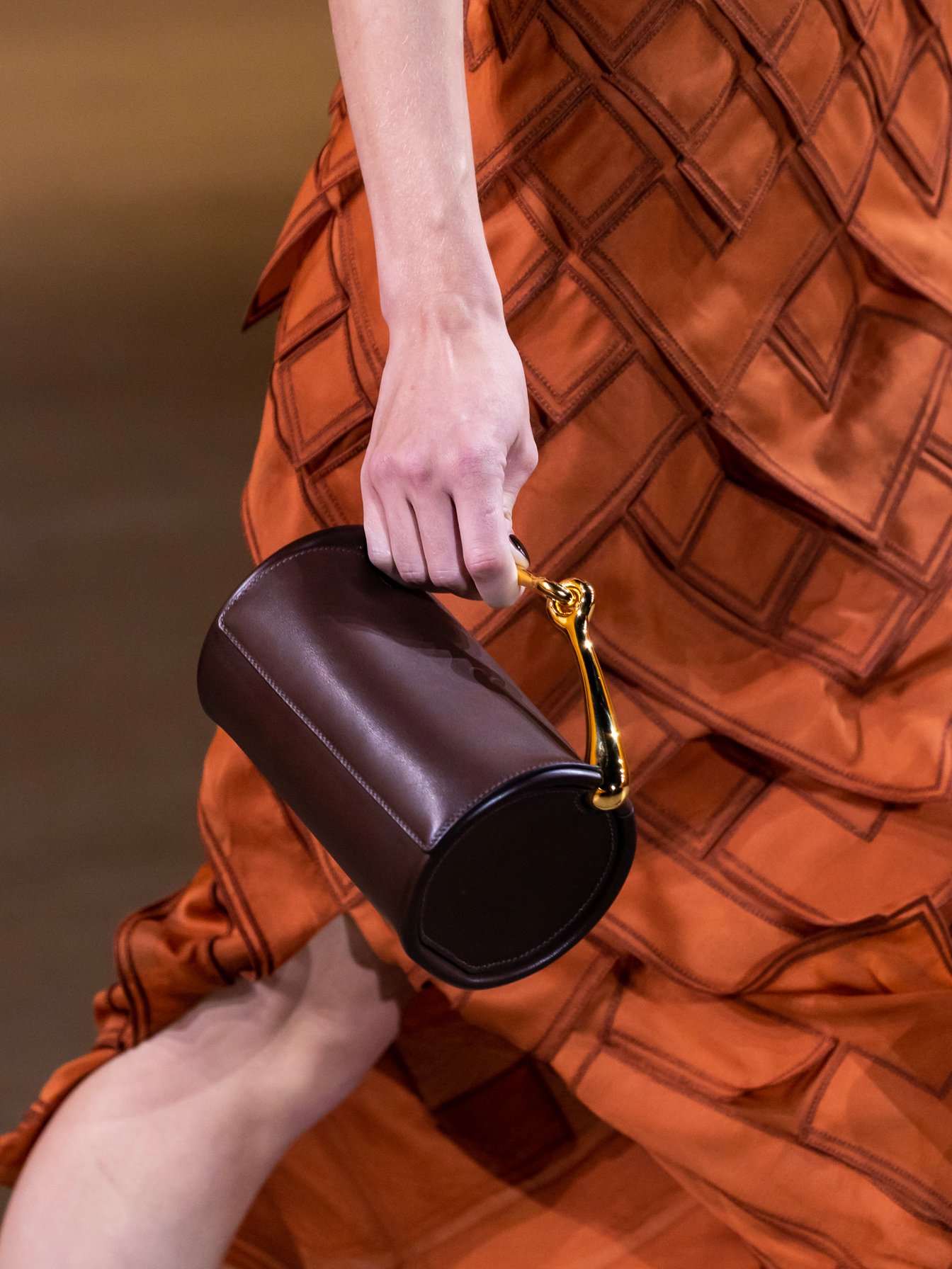 足元は、カーフスキンとラバーソールを組み合わせたフラットサンダル。レザー製のソックスを組み合わせてソックスブーツのようなスタイリングも見られた。バッグはドラム型など小ぶりのサイズ。機能的なポケットがデザインされているウェアが多いこともあり、バッグはアクセサリーに近い存在となっている。