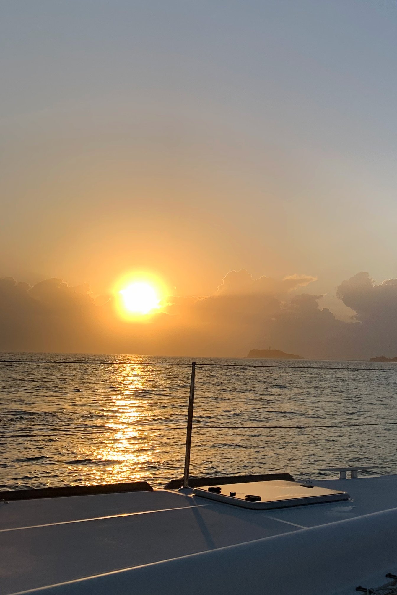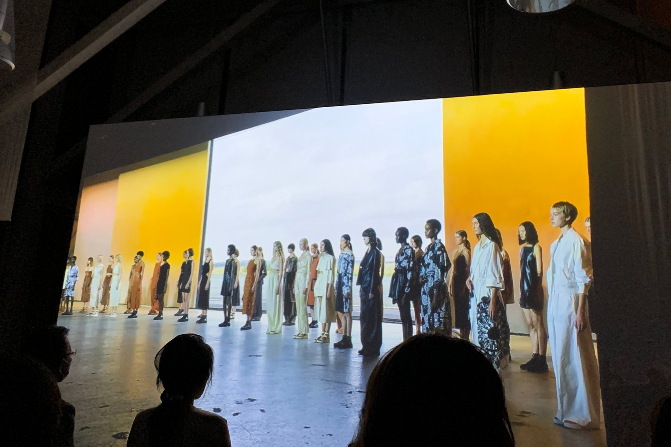 ショーのラストシーンでは、パネルが動いて屋外とつながり、空港の景色と離陸する飛行機が背景に。ライブビューイングを行なった釜山、ニューヨーク、ロンドン、アブダビ、そして日本の神奈川の5都市でも、海辺といった開放感のある場所に巨大スクリーンが設置された。日本では逗子マリーナが会場となり、招待客はサンセットクルージングとともに、配信を通じてコレクションを体験した。